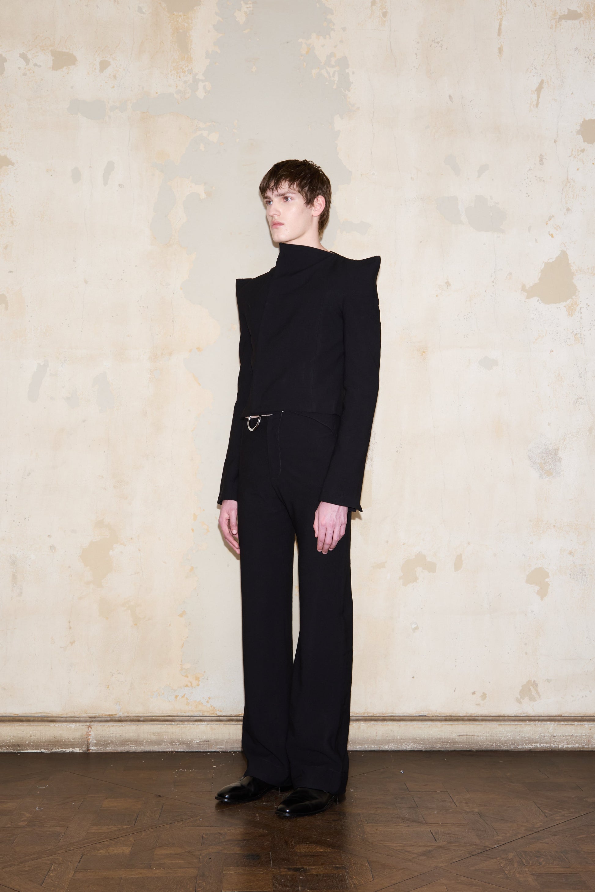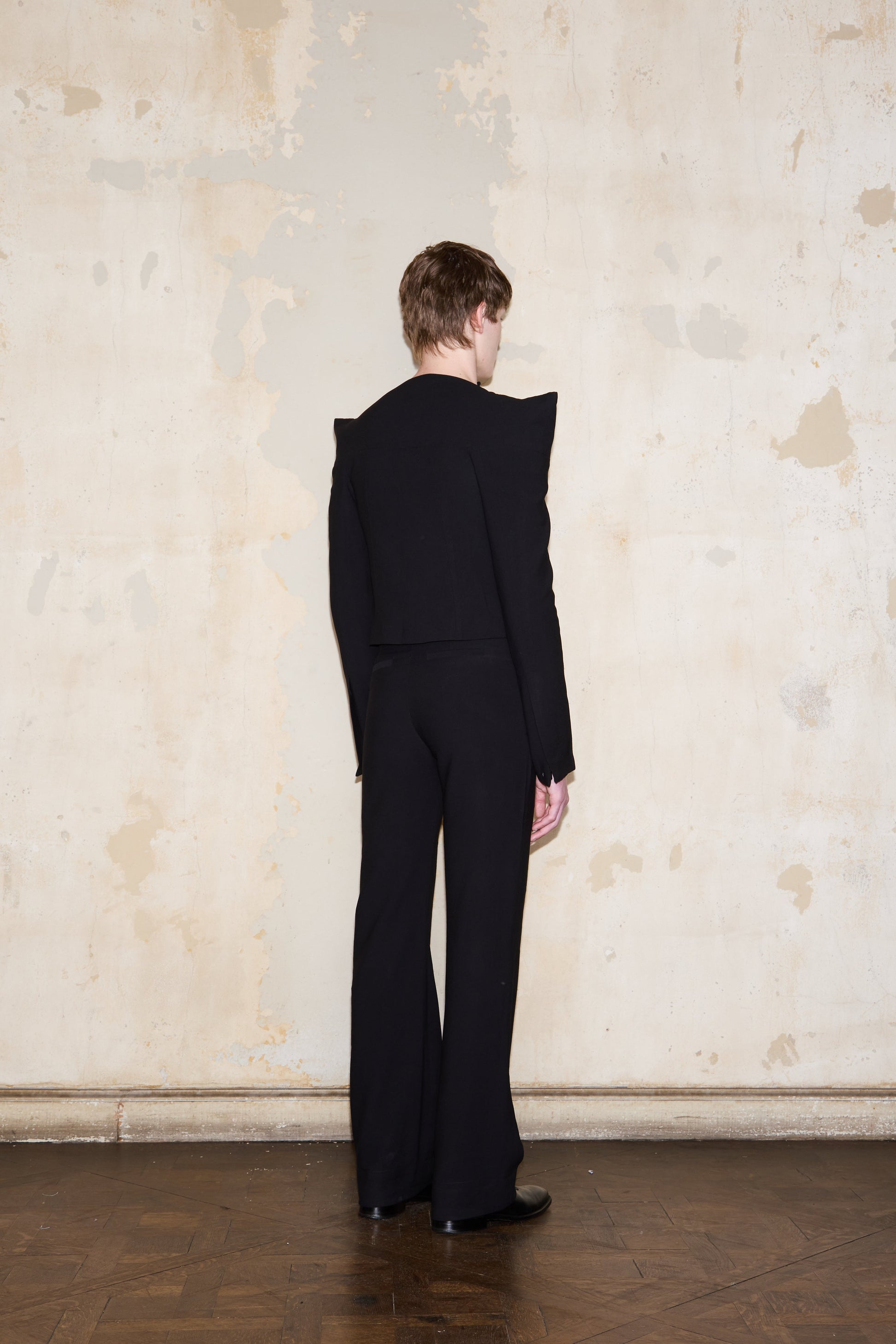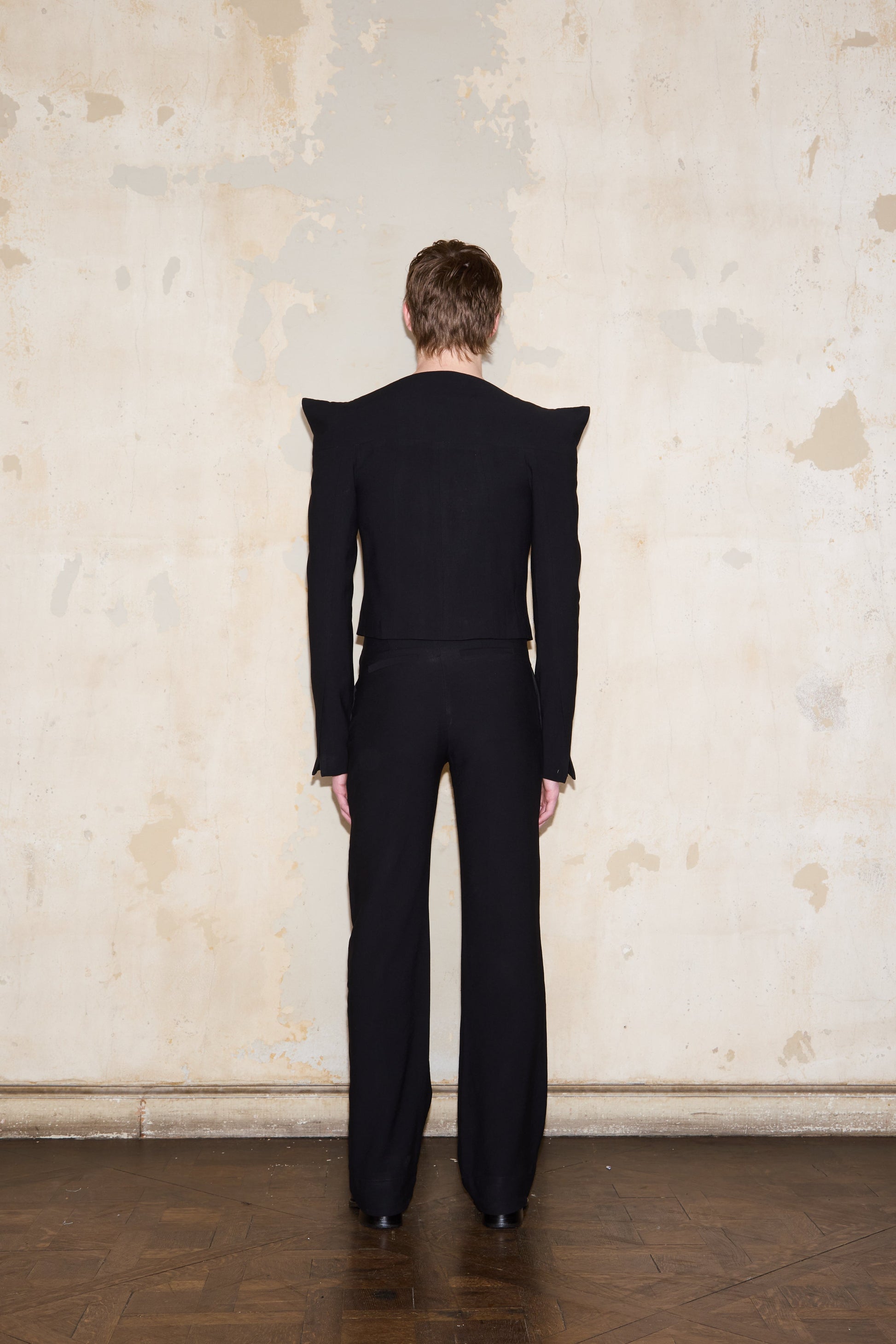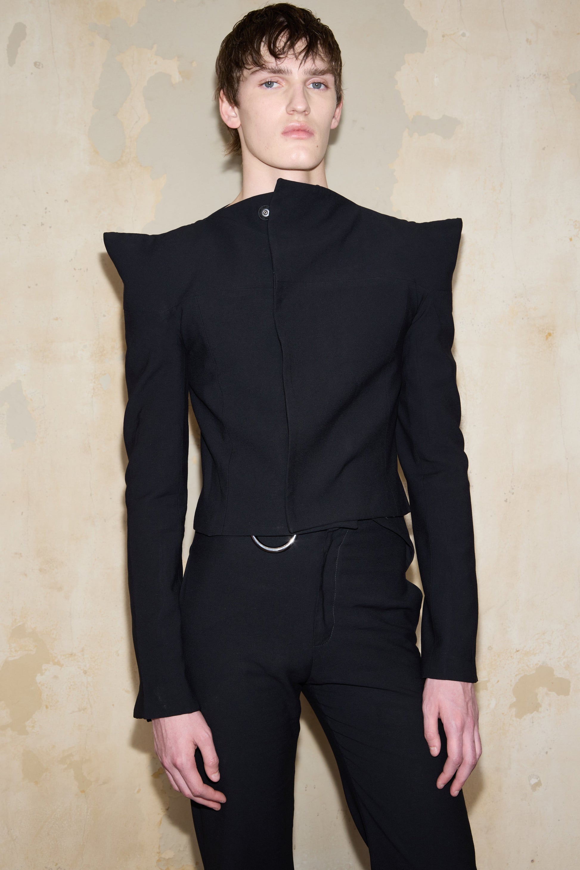 Tailored from lightweight suiting fabric, this fitted blazer features structured shoulders and neckline with an asymmetric design that is higher at the front and back. It fastens internally with snaps.
