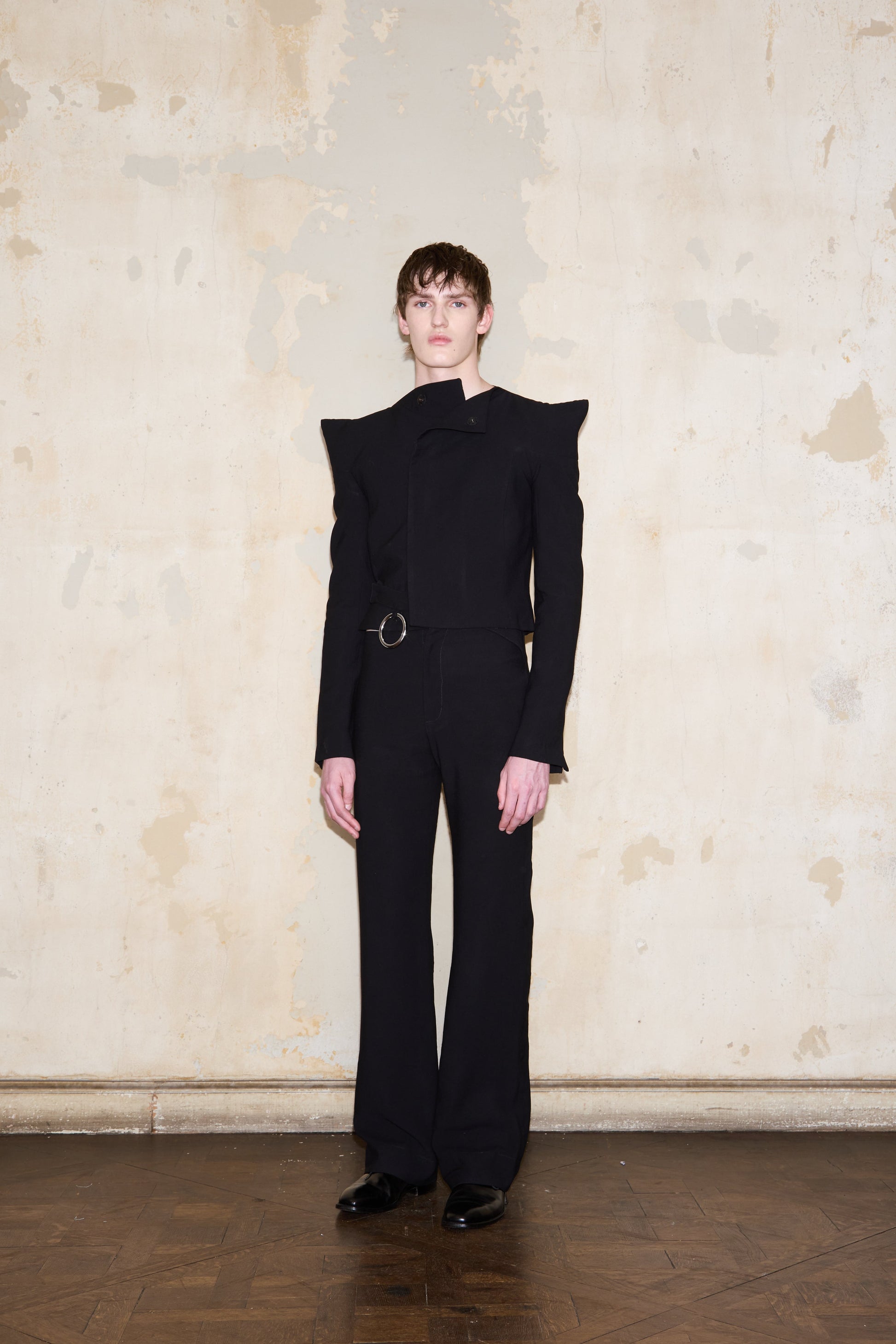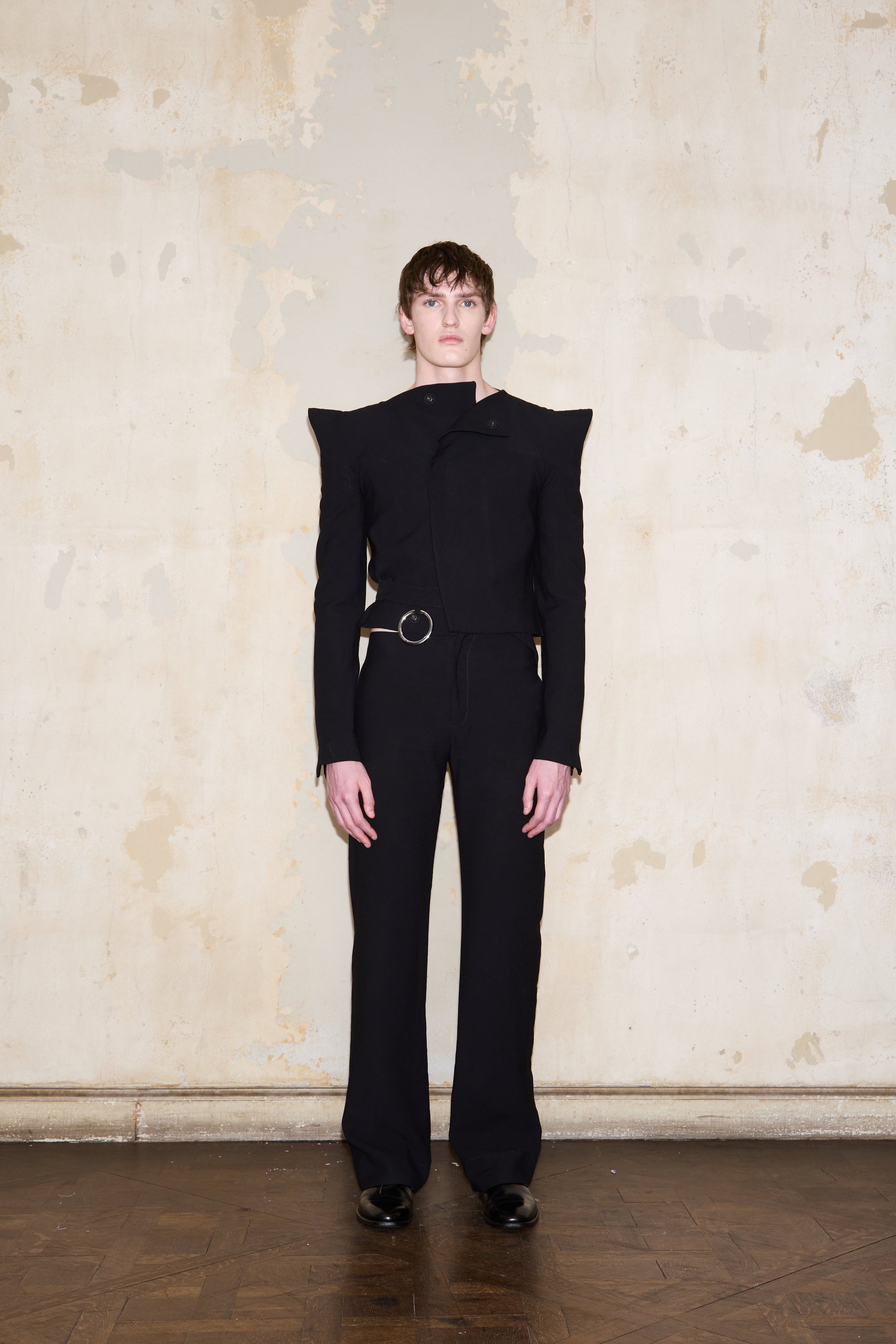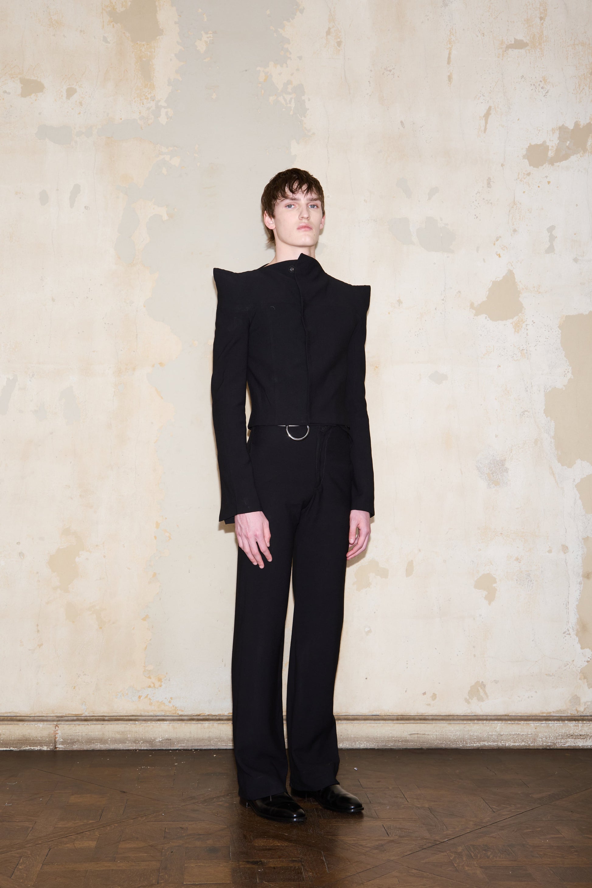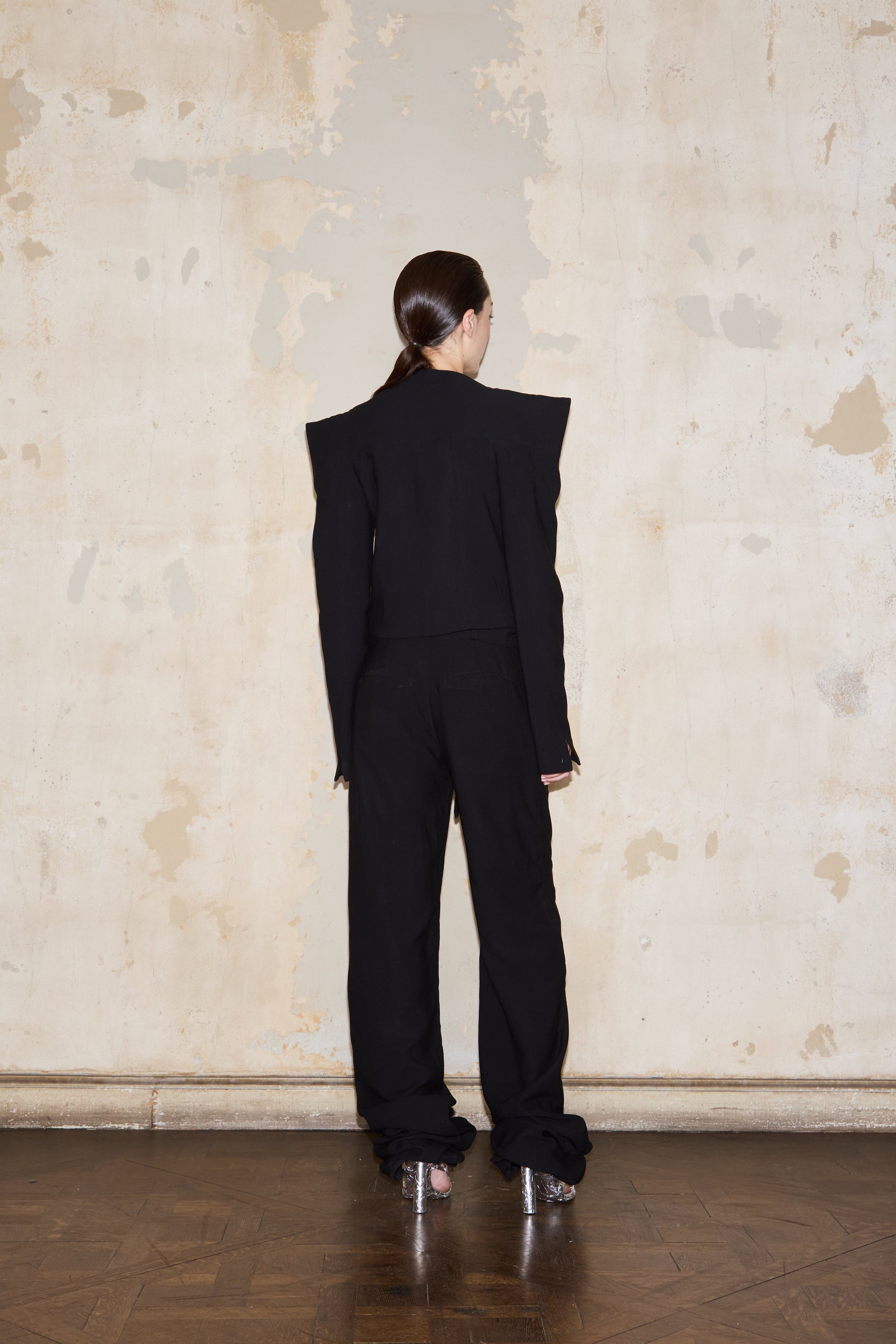 Tailored from lightweight suiting fabric, this fitted blazer features structured shoulders and neckline with an asymmetric design that is higher at the front and back. It fastens internally with snaps.