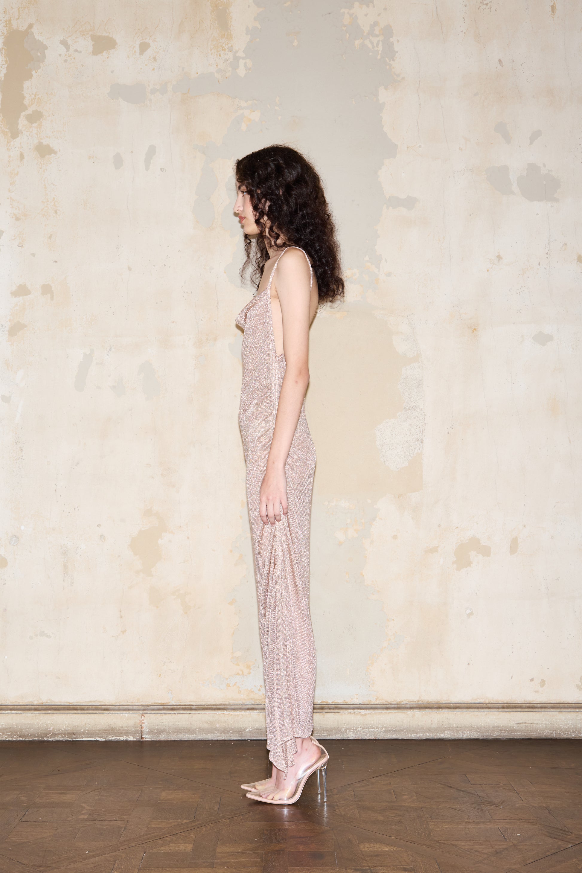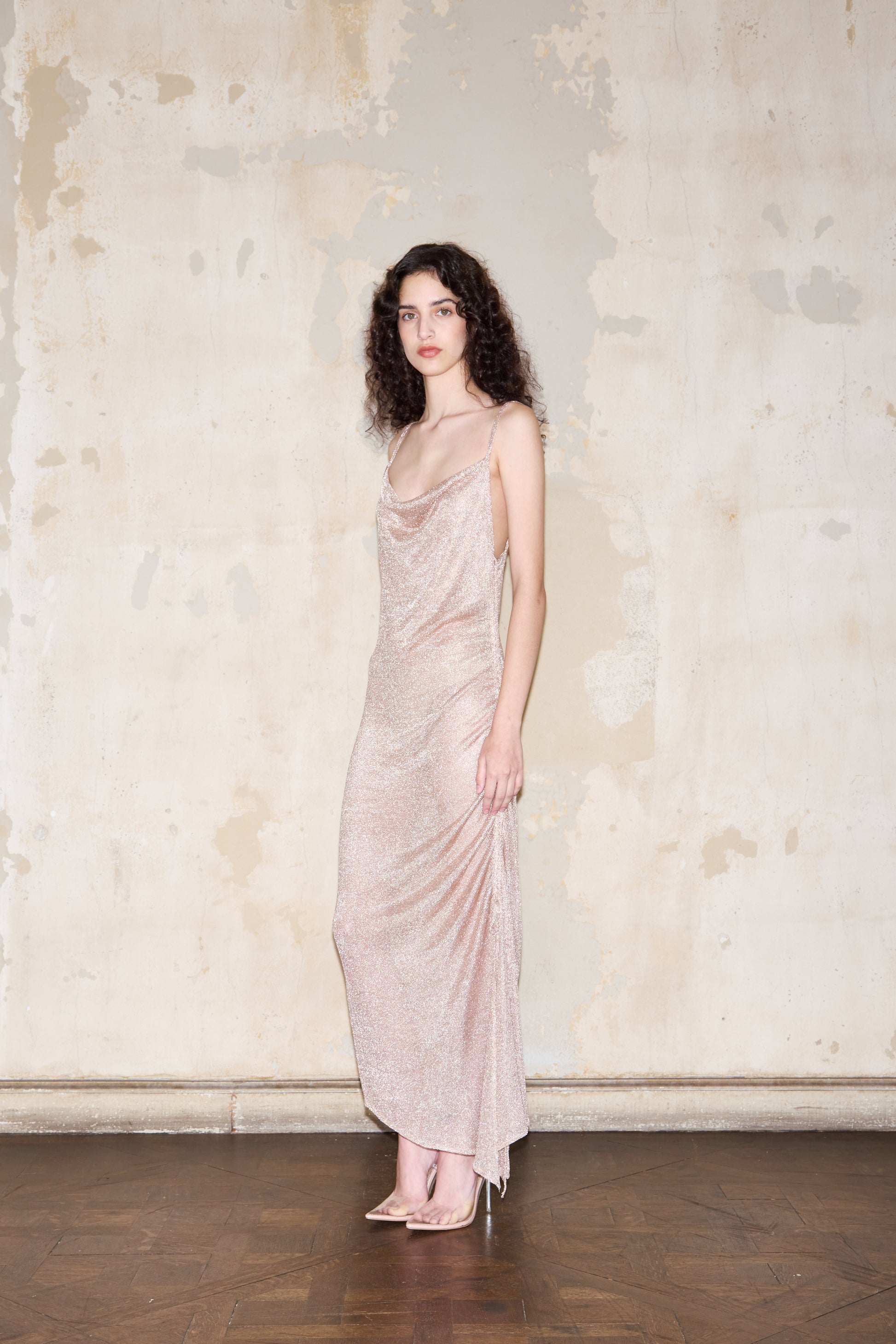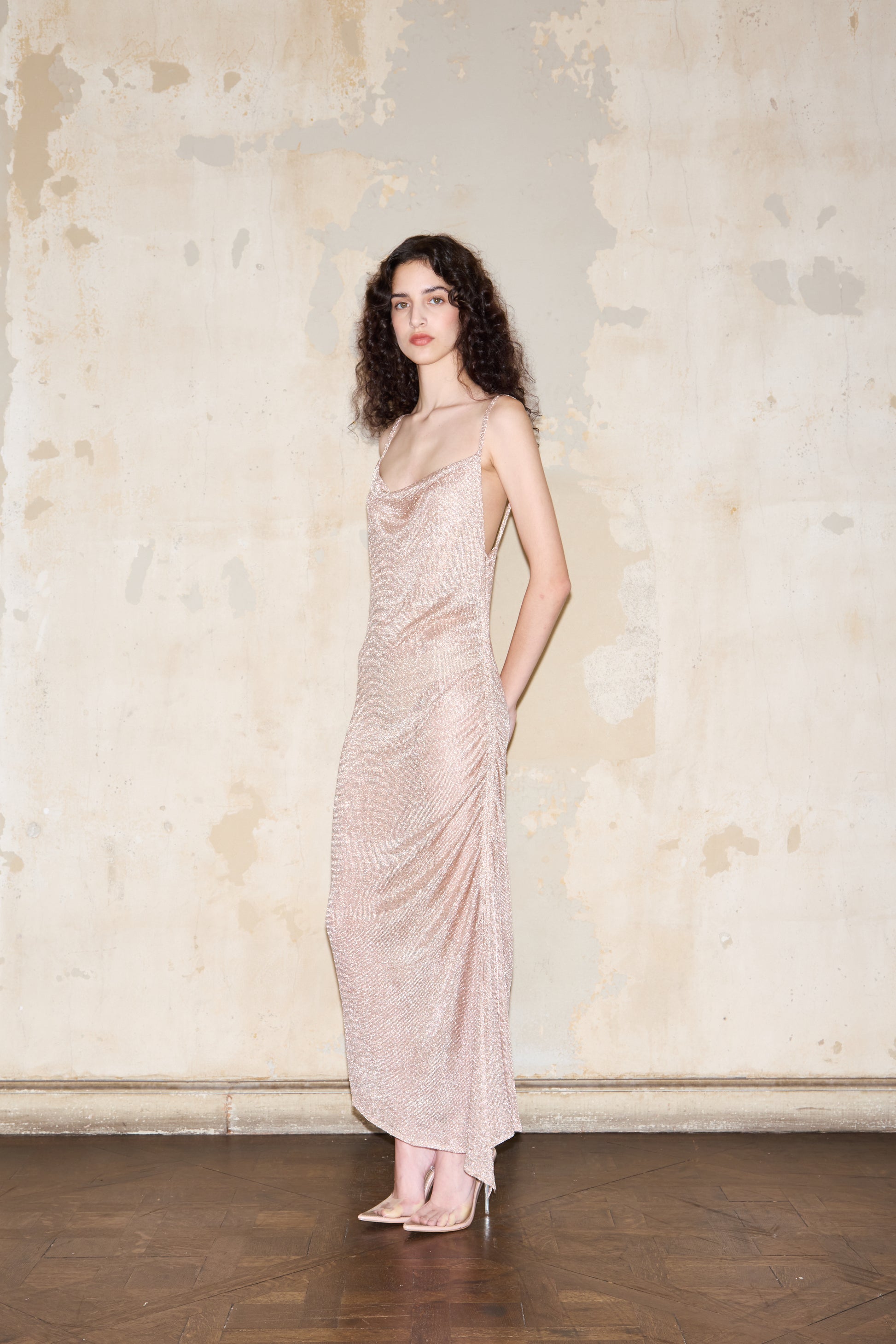 Asymmetrical gown with adjustable straps. Features an elegant draped neckline and distinctive side slit with customizable drawstrings for controlled draping effect.