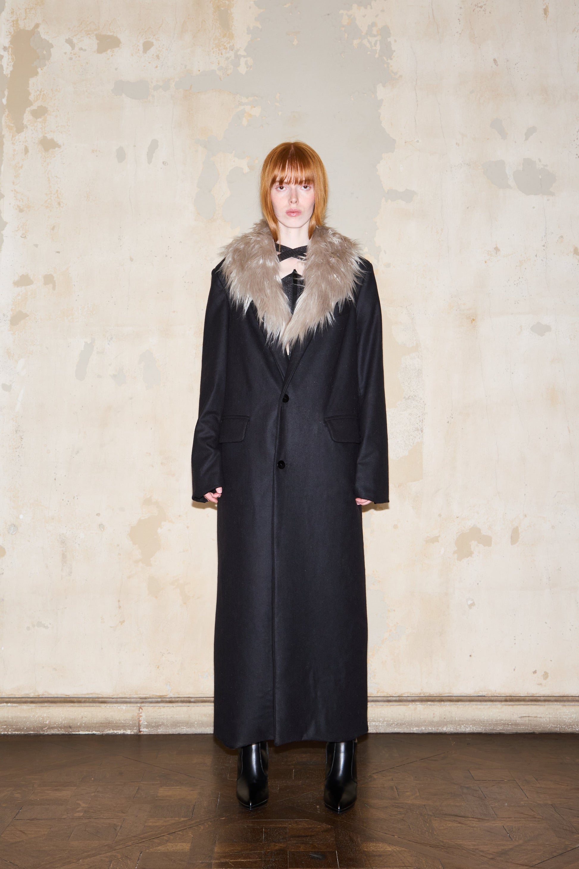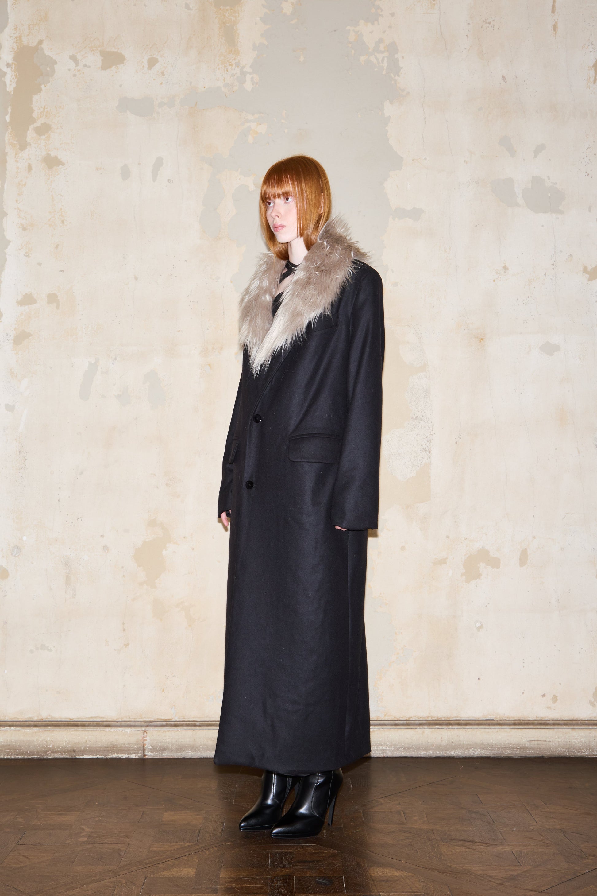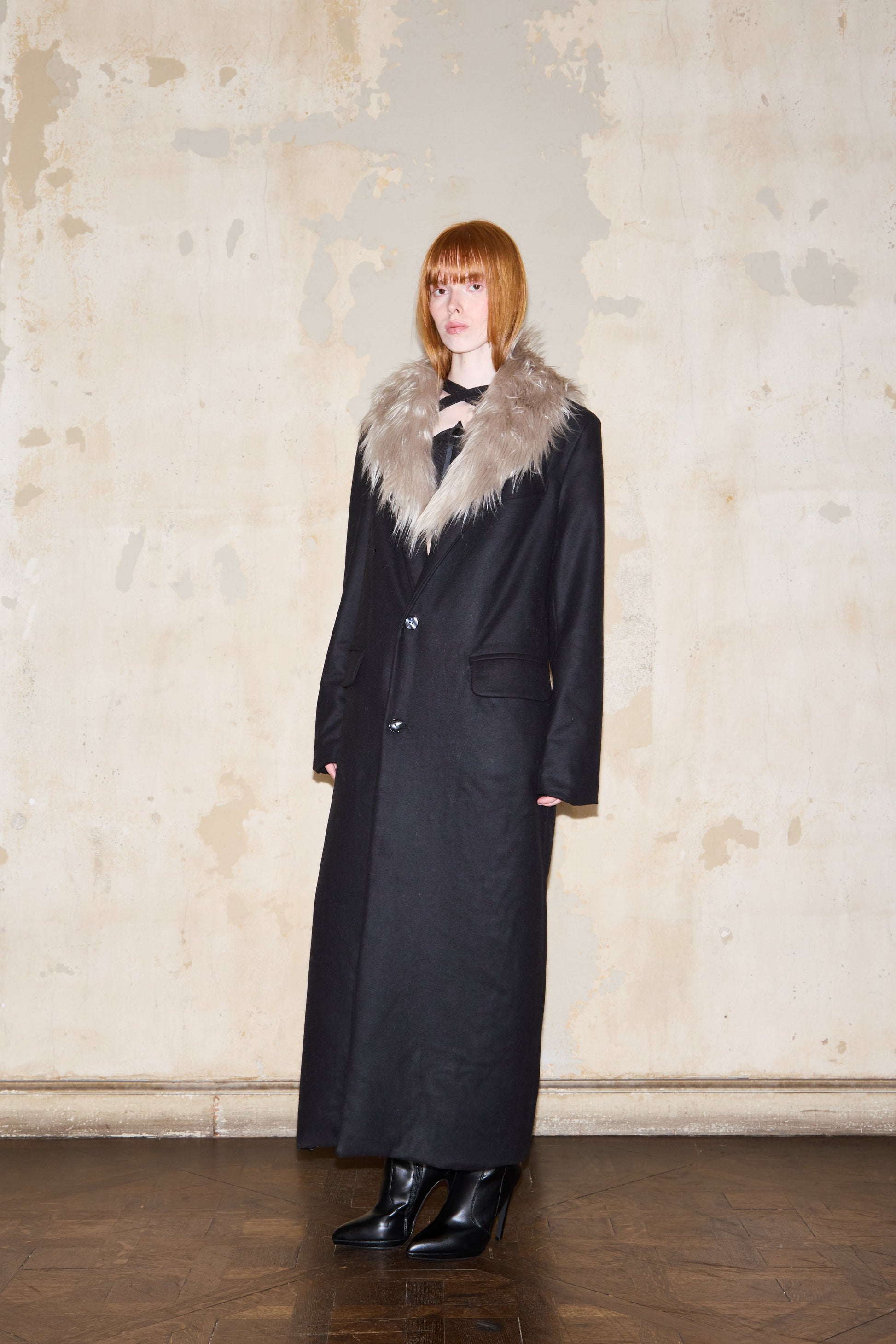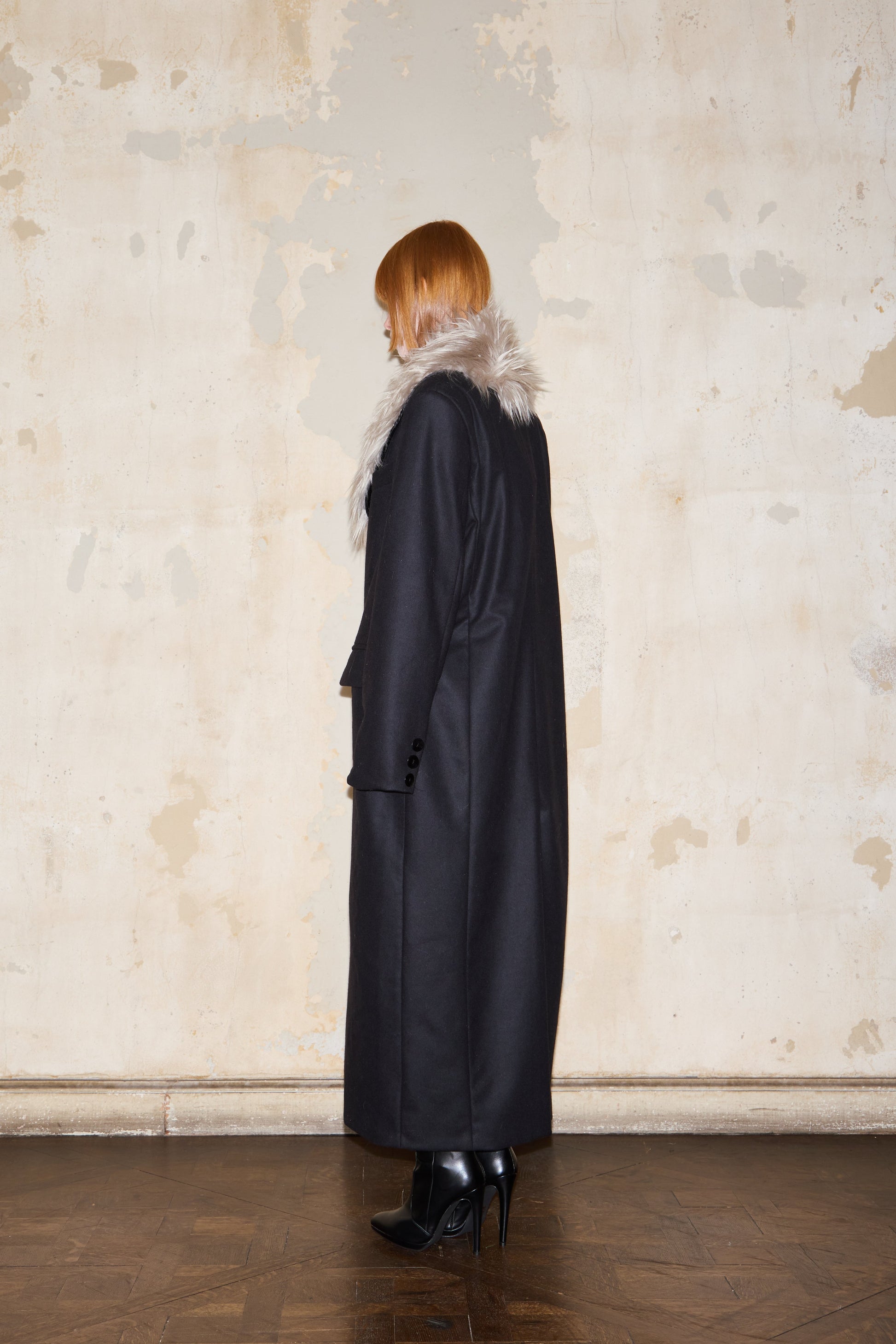 Classic double-breasted coat featuring a detachable faux fur collar. Lined with exclusive ESQUINA print satin. Crafted from Italian wool, satin, and faux fur. Dry clean only.