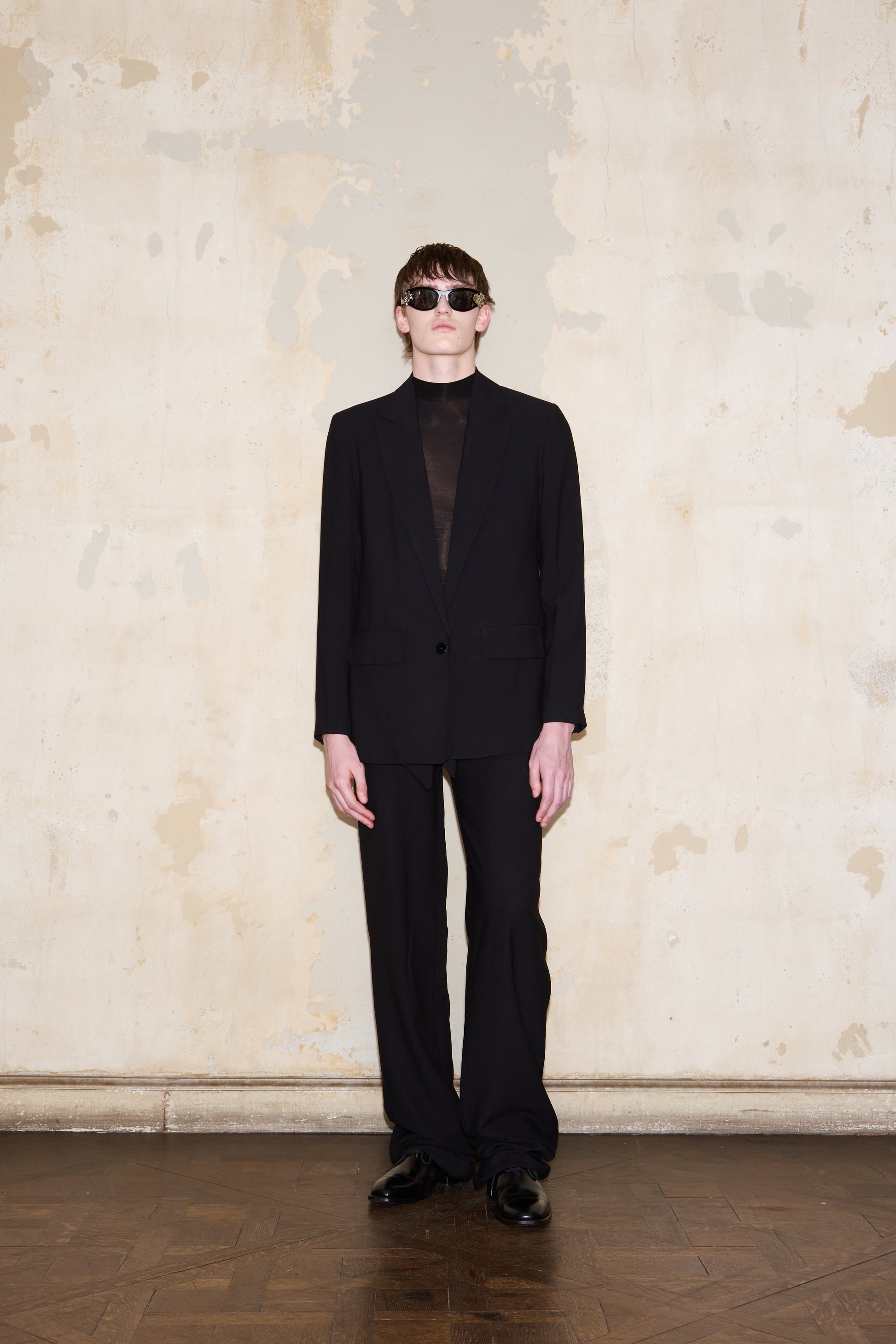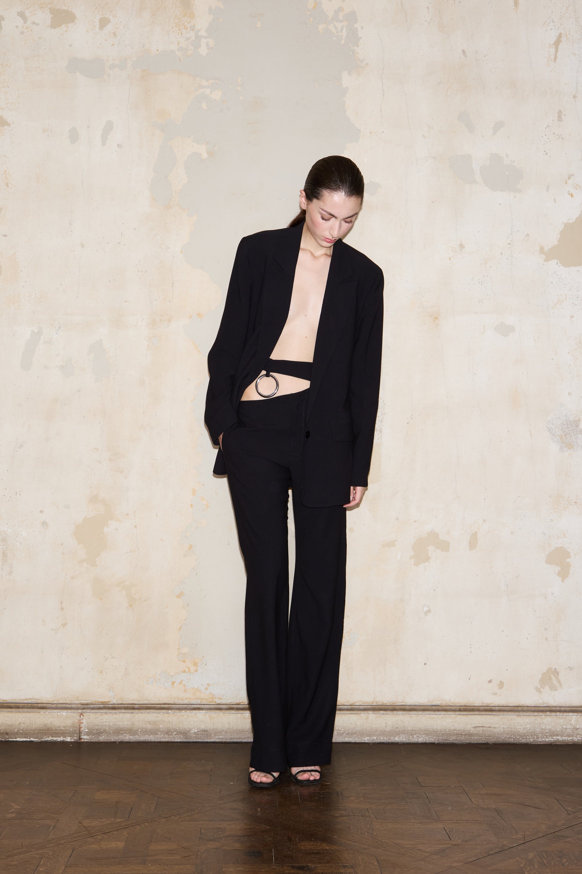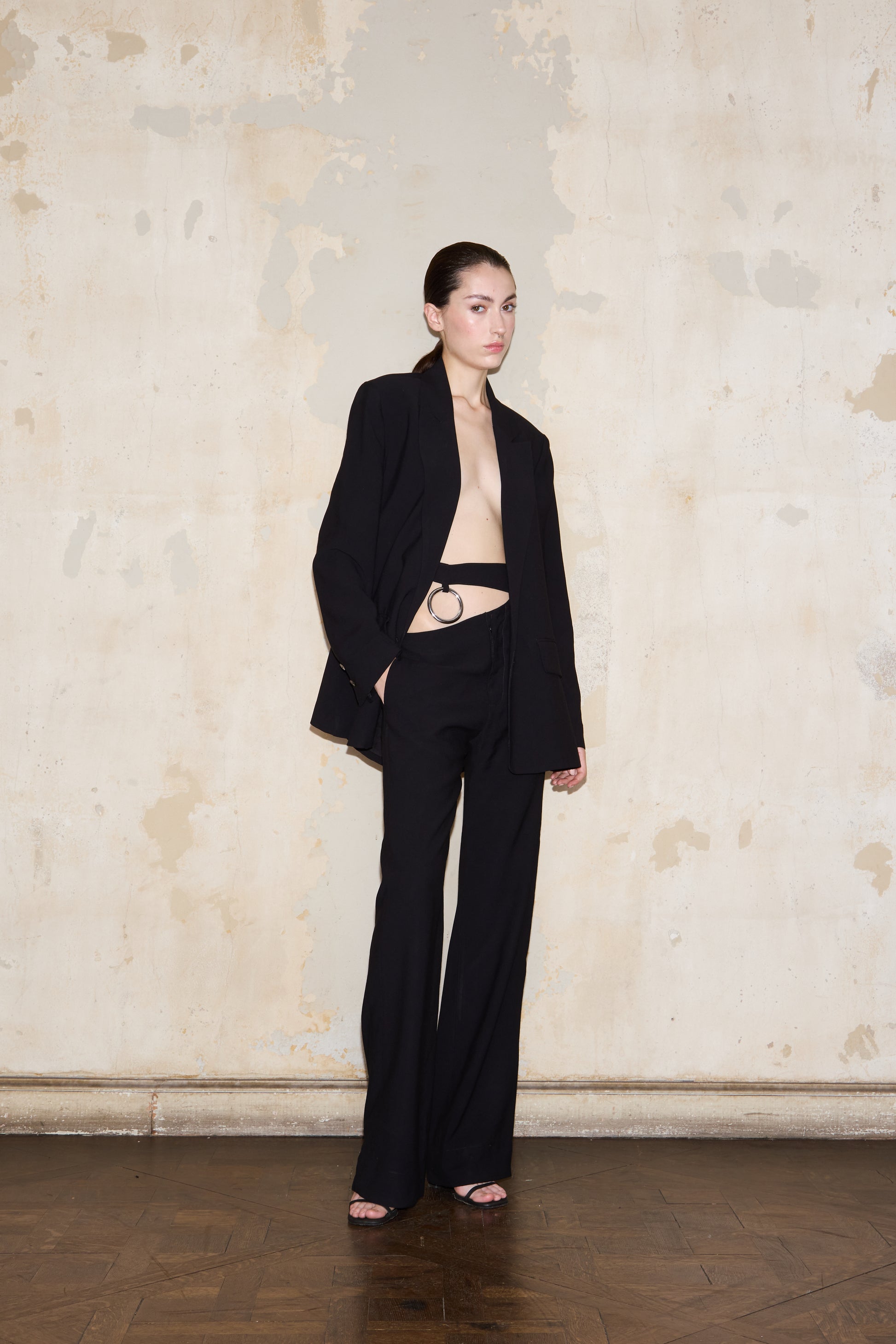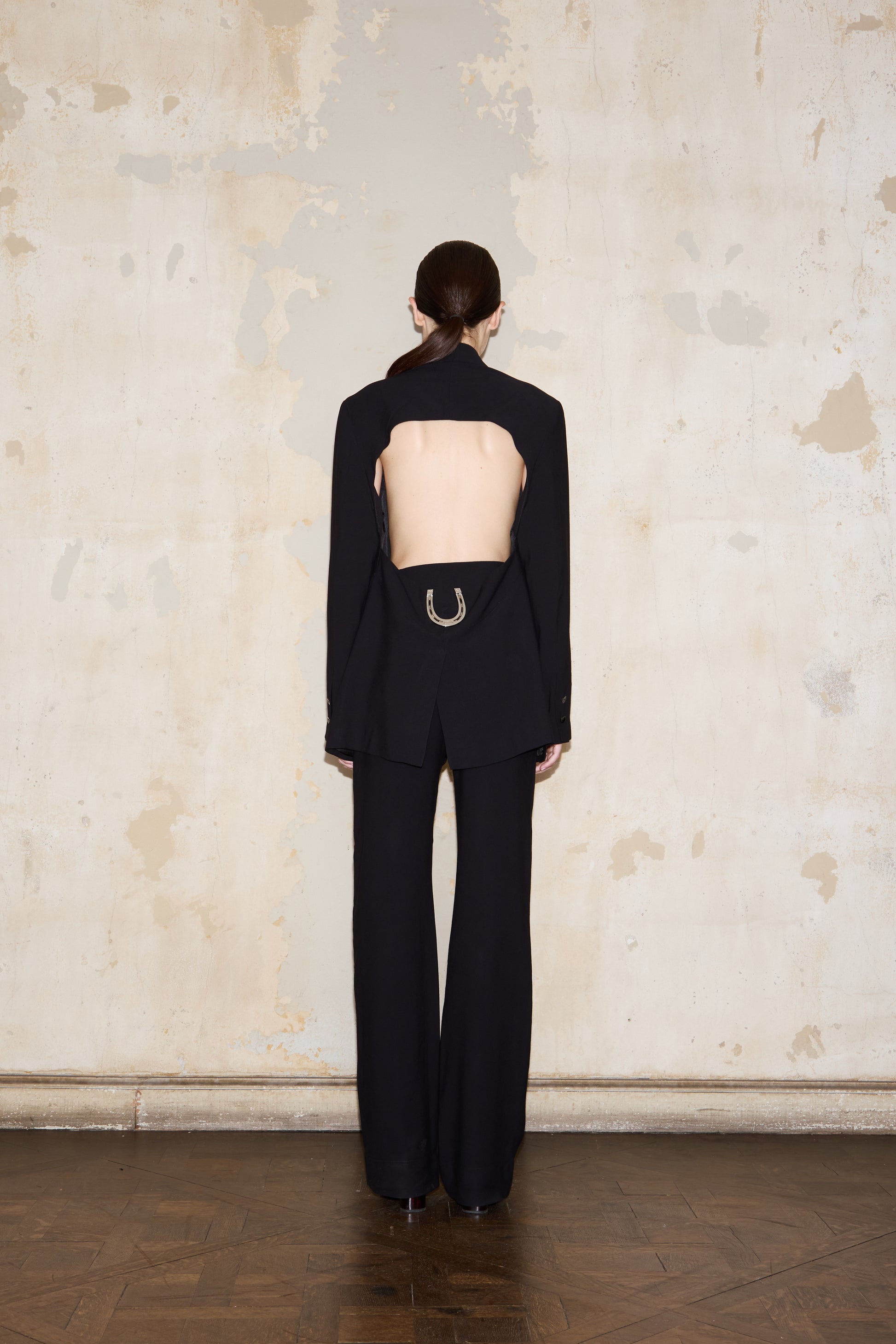 Classic double-breasted tailored blazer with a dramatic slit at the back, featuring the ESQUINA horseshoe detail.