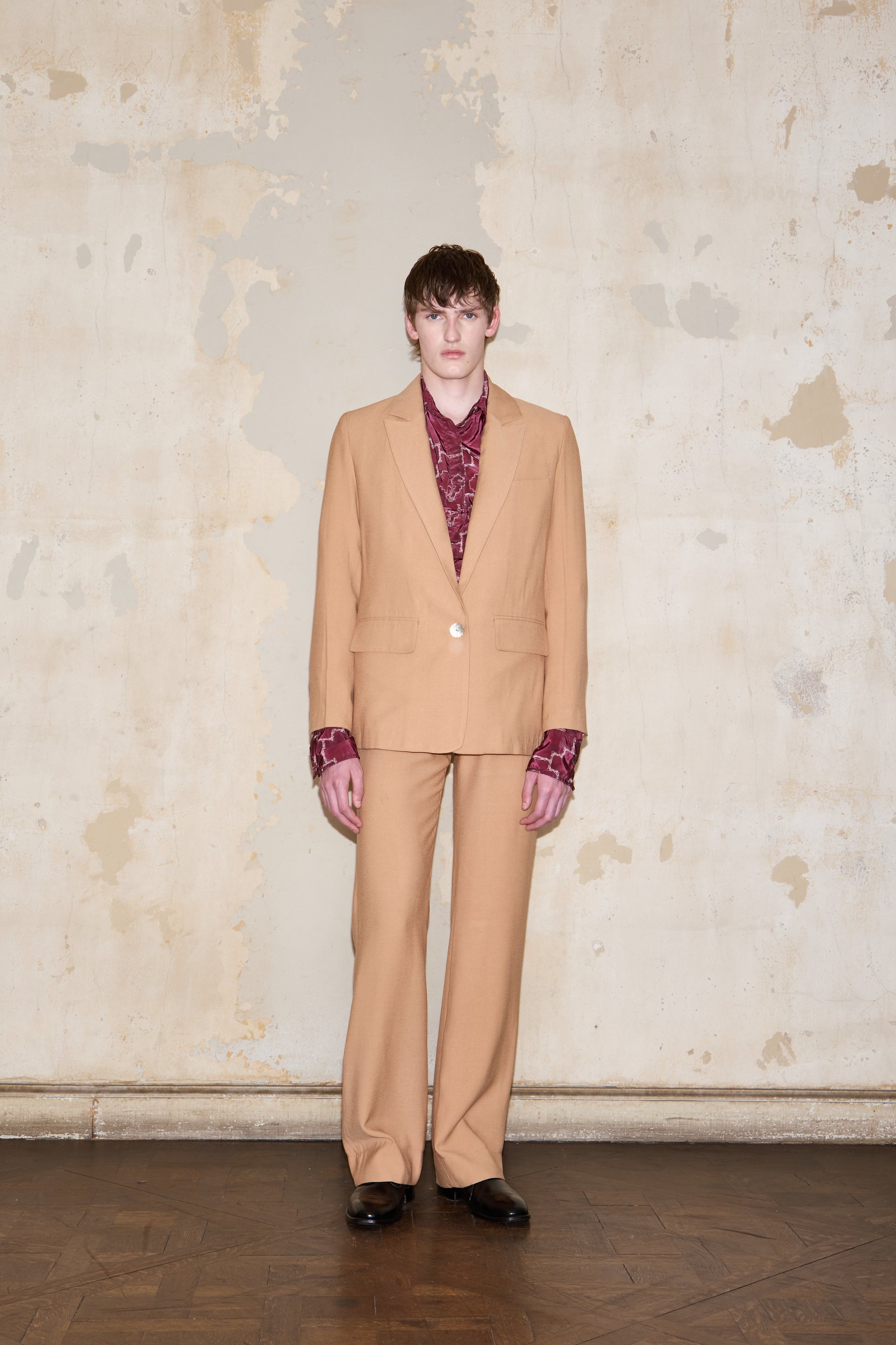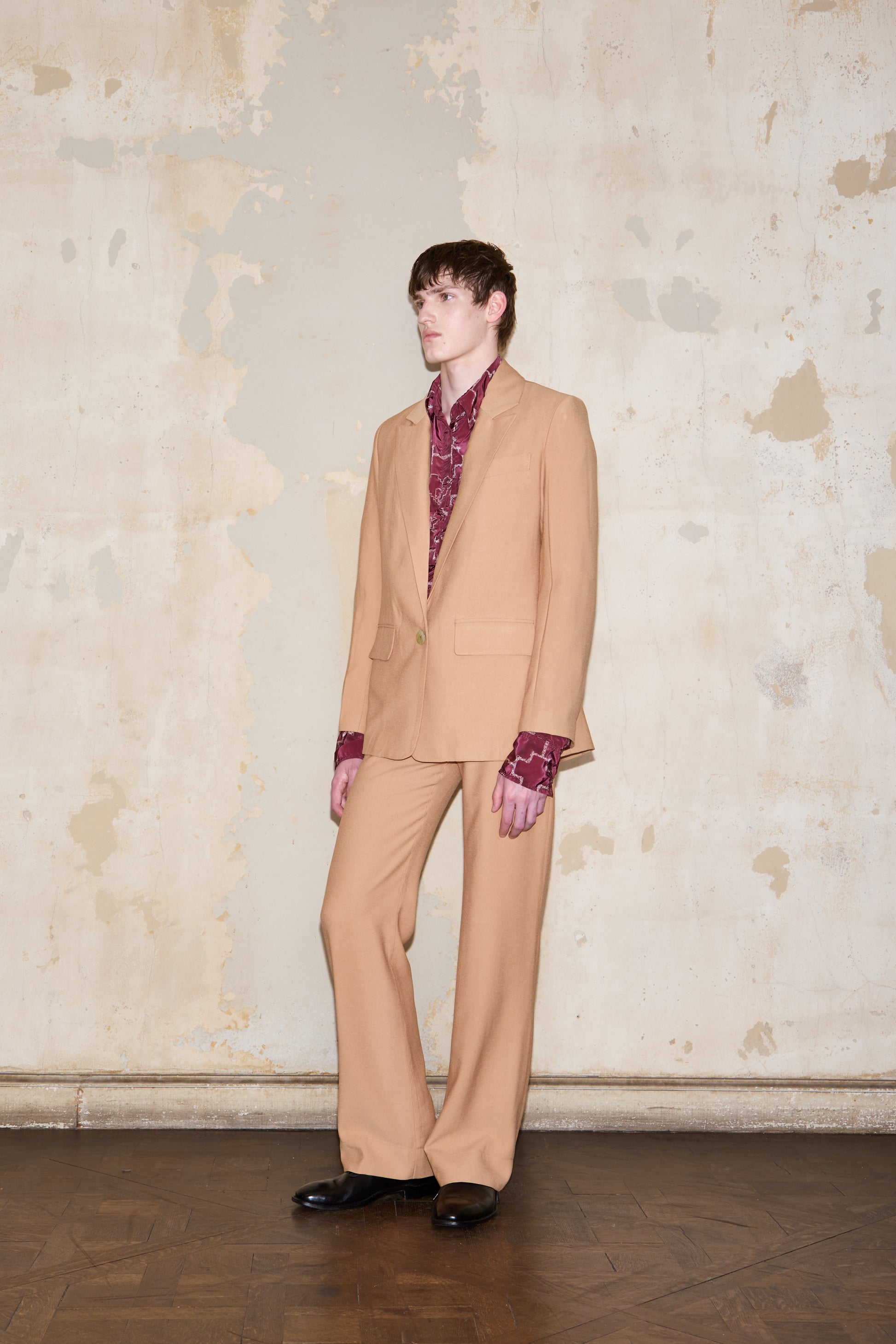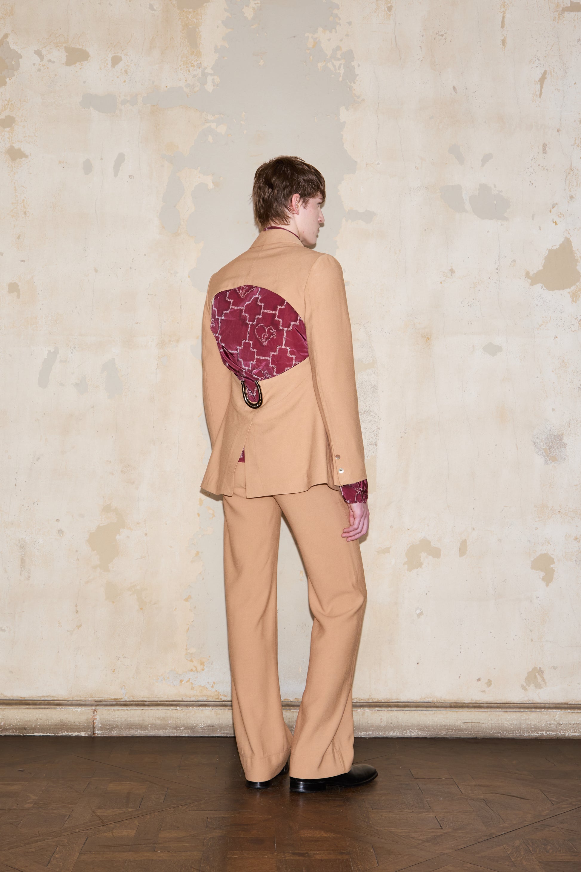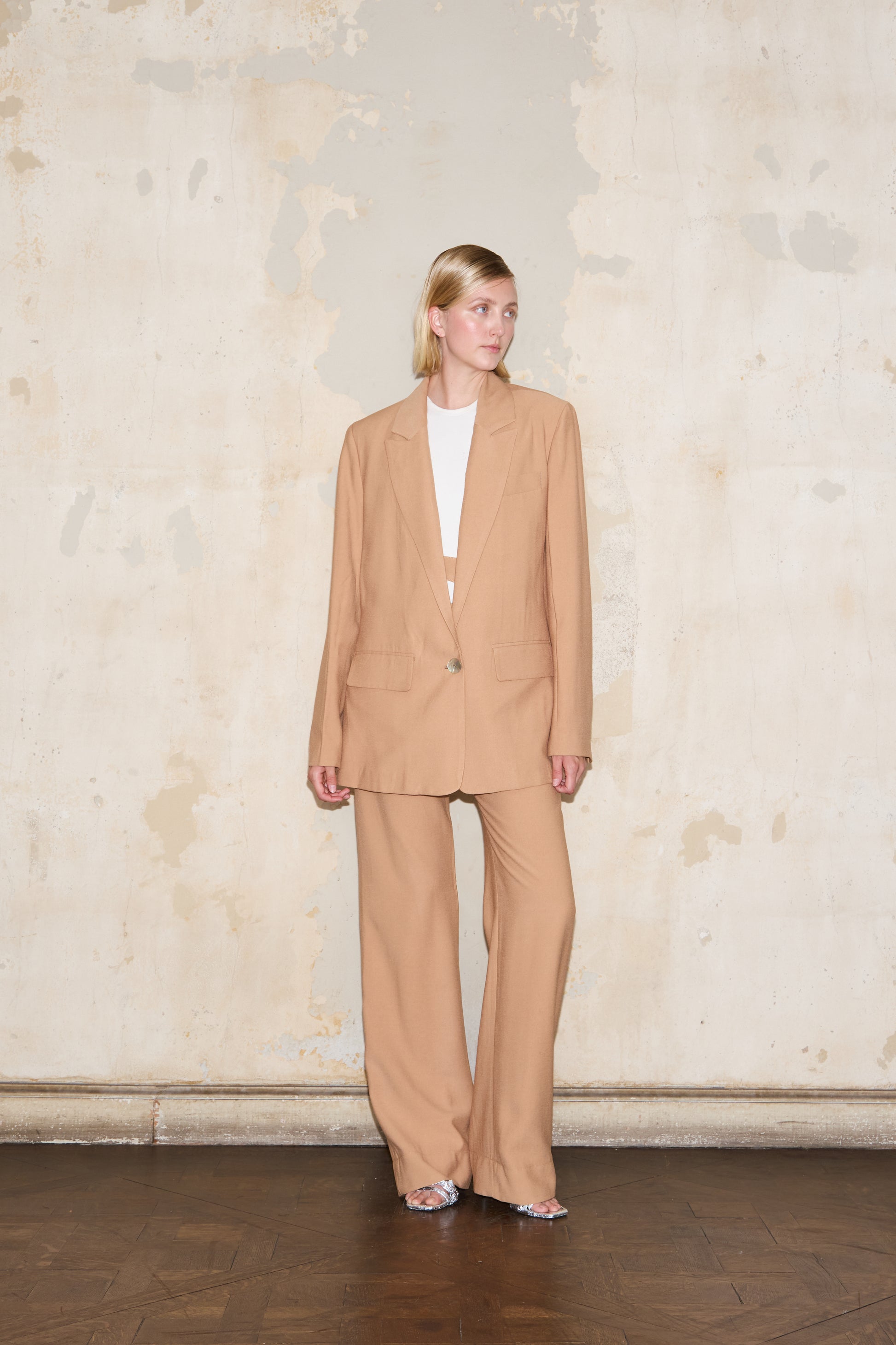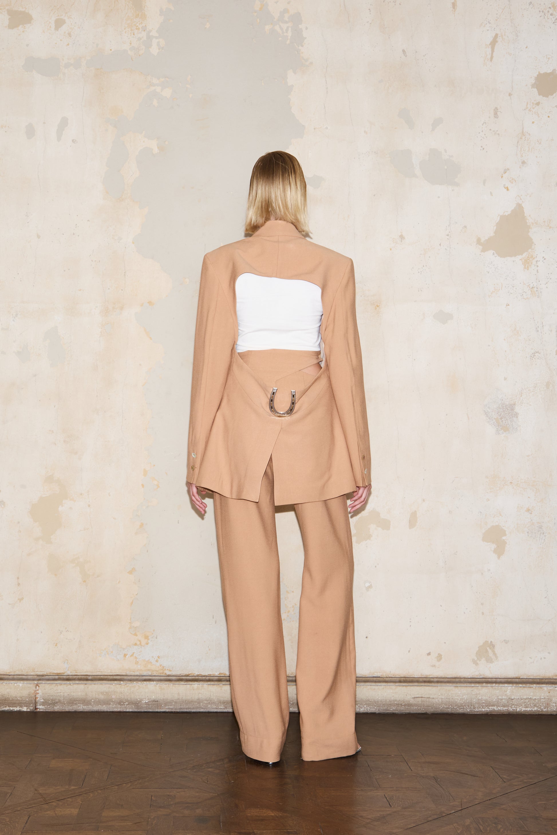 Classic double-breasted tailored blazer with a dramatic slit at the back, featuring the ESQUINA horseshoe detail.