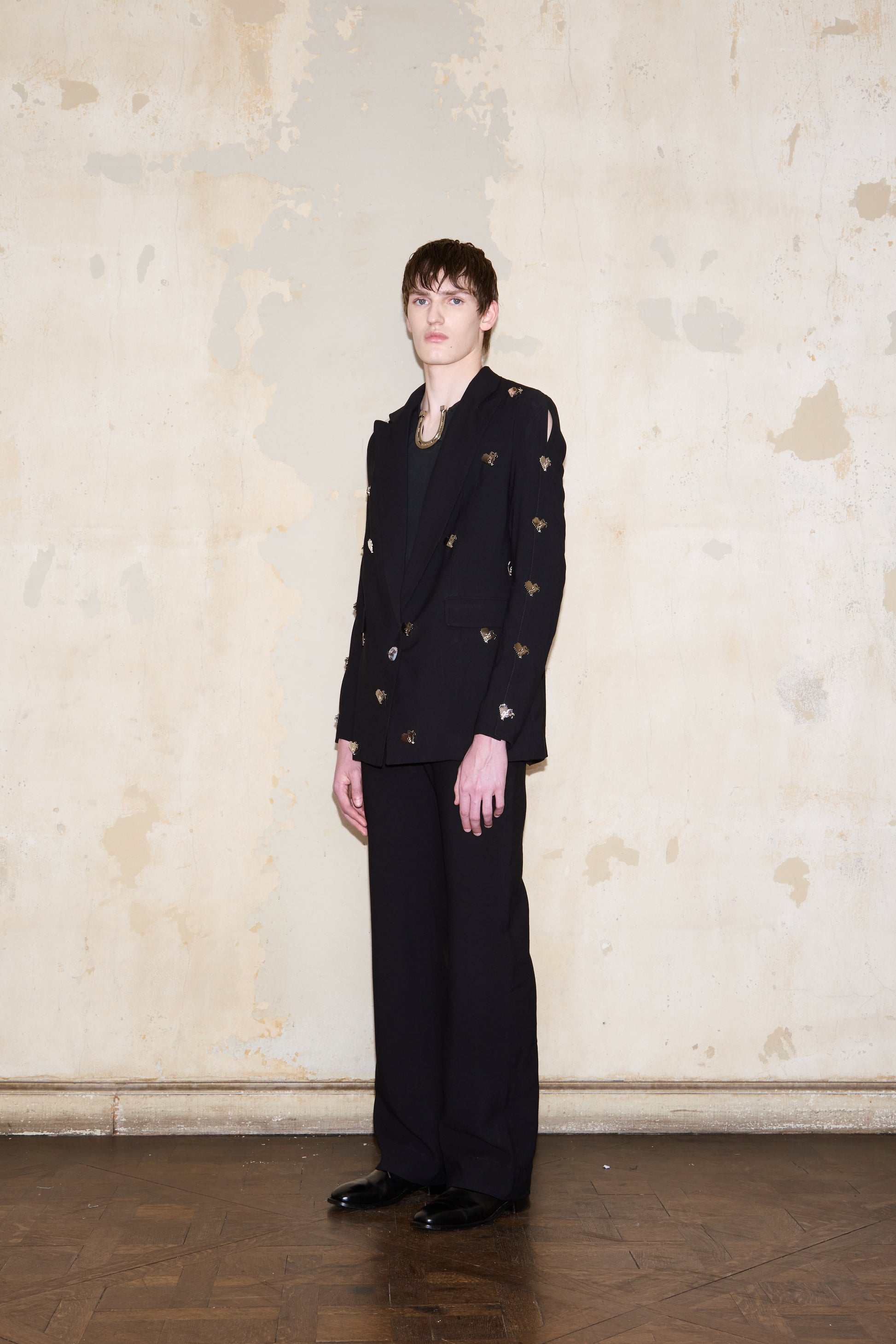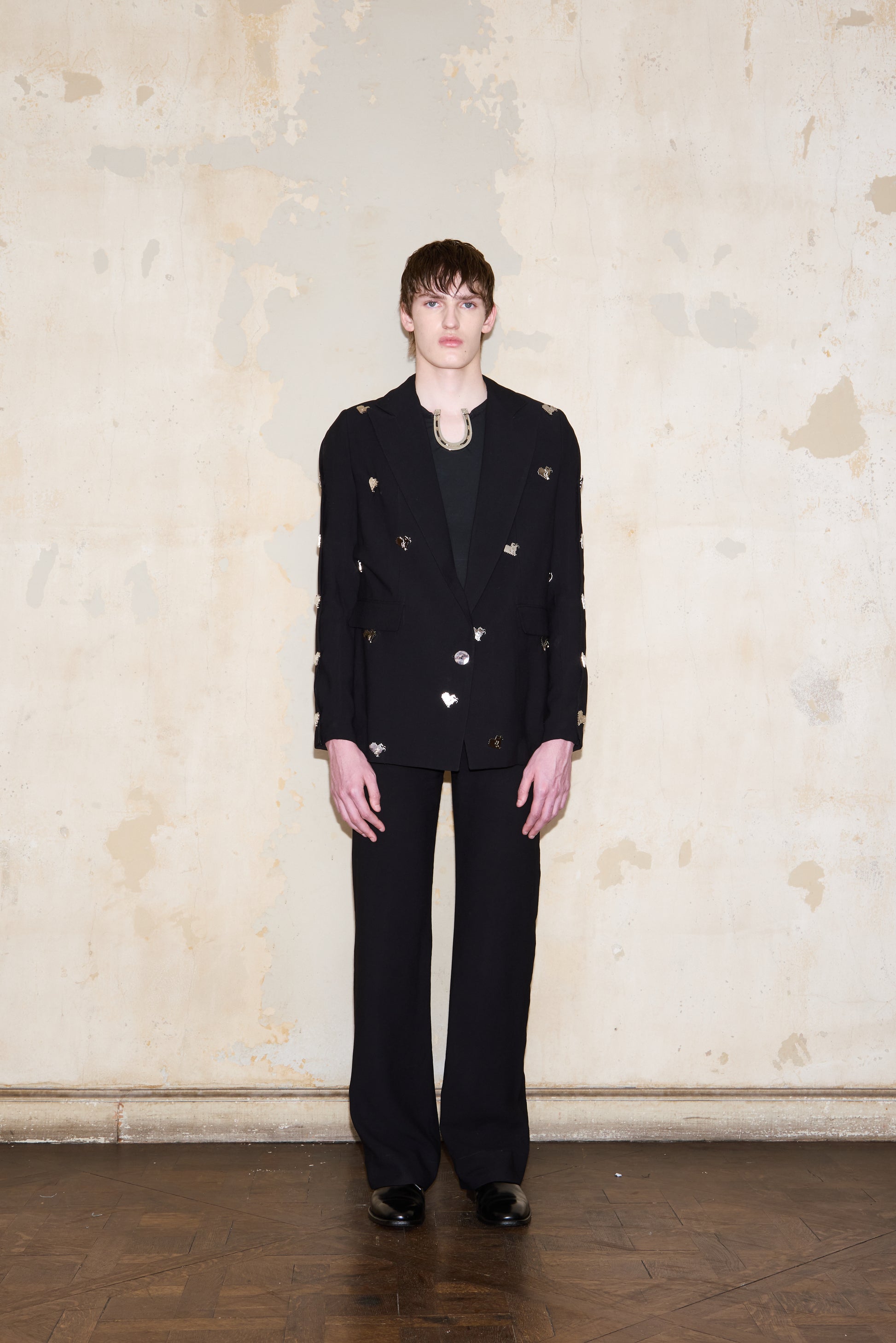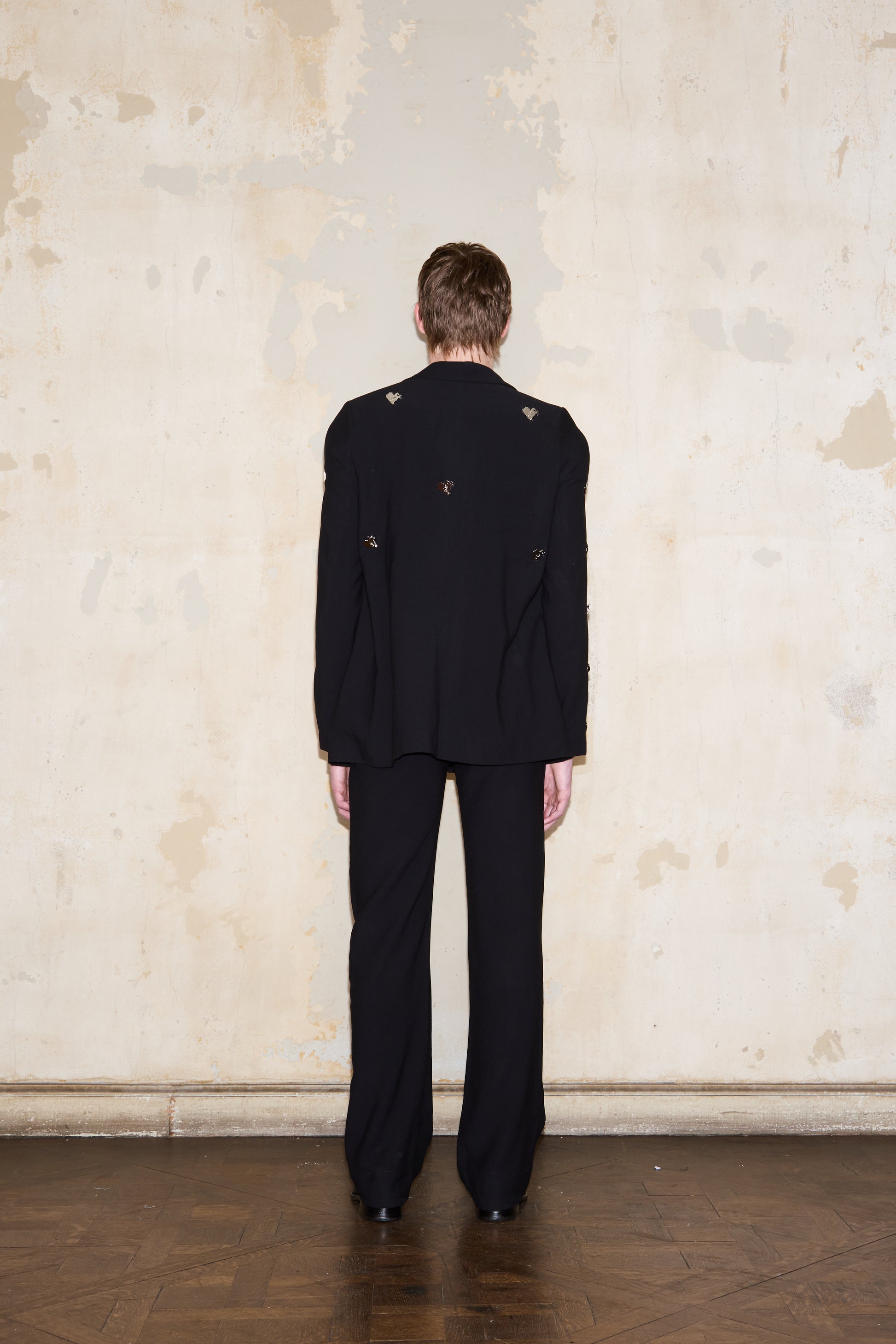 Oversized blazer in tailored fabric. The front, back, and sleeves feature ESQUINA's logo (heart + horse) in silver zemac detailing. The sleeves are open at the sides, connected by the logos.