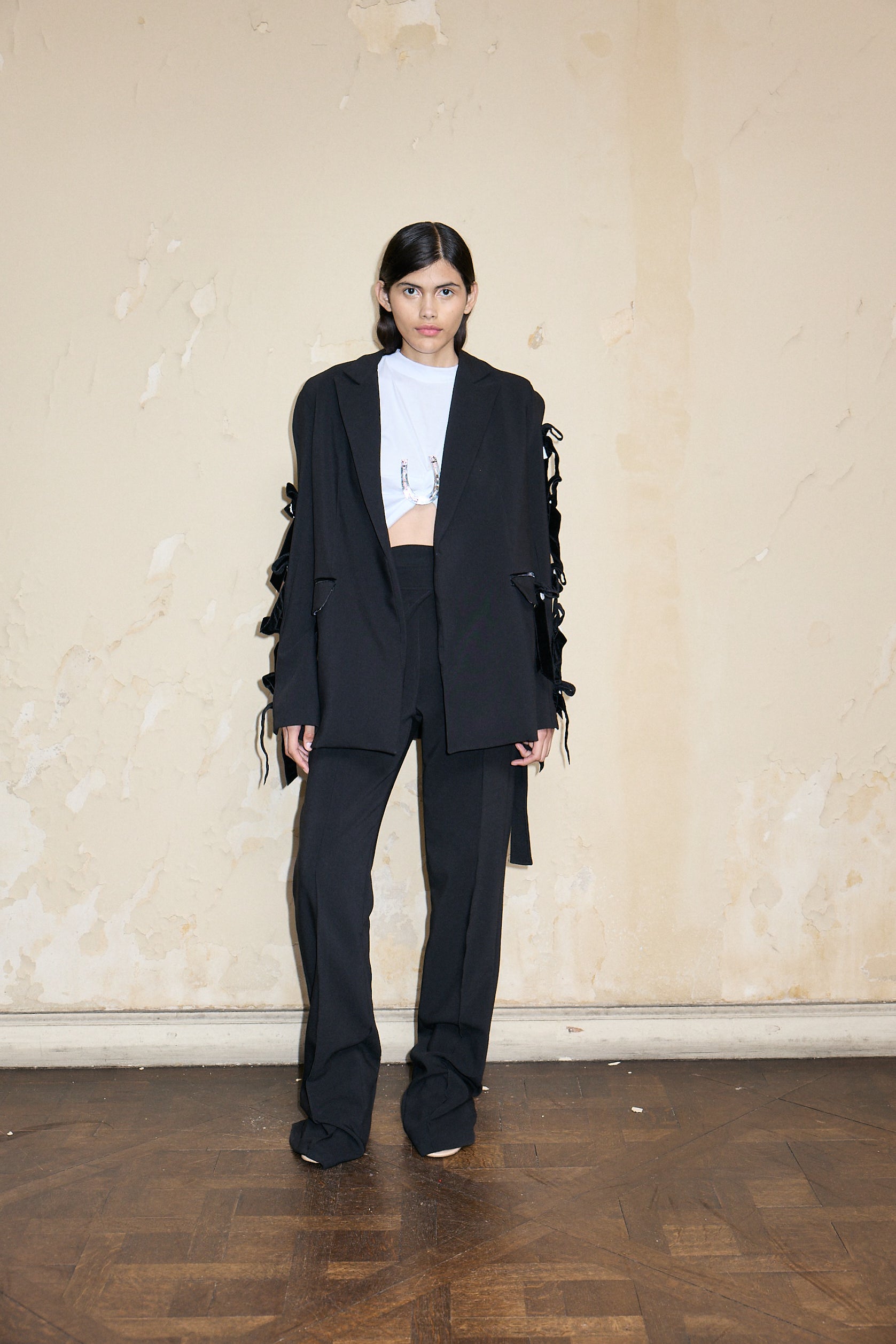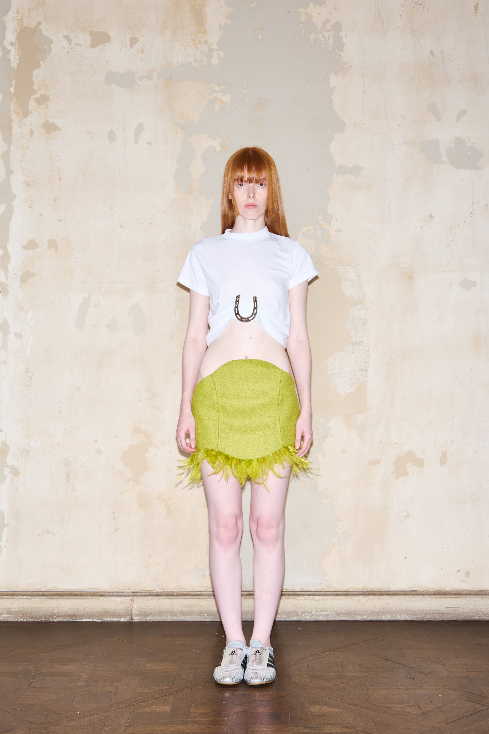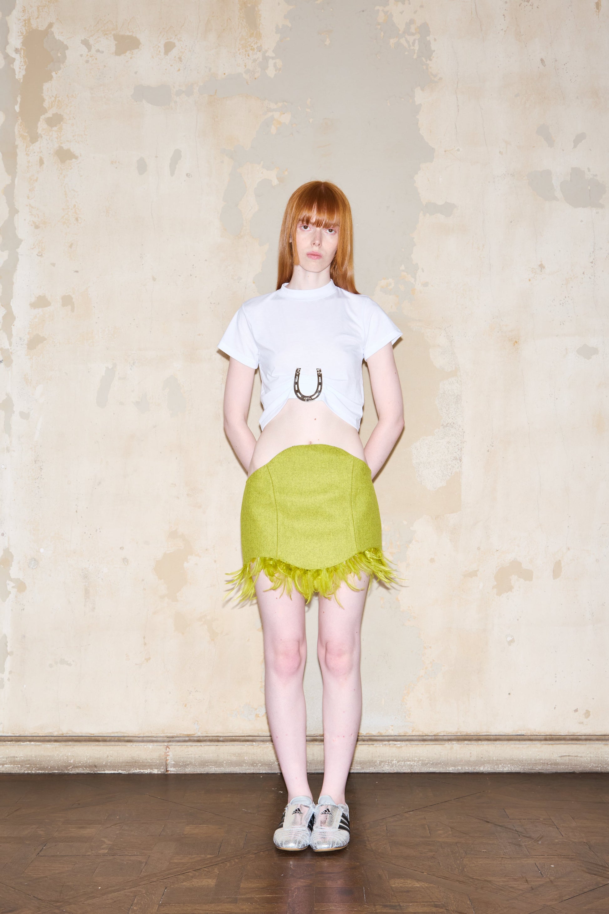 Expertly draped front crop t-shirt featuring hand-stitched ESQUINA horseshoe emblem. Crafted from premium 100% cotton fabric. Maintain quality with cold water hand washing for optimal longevity.