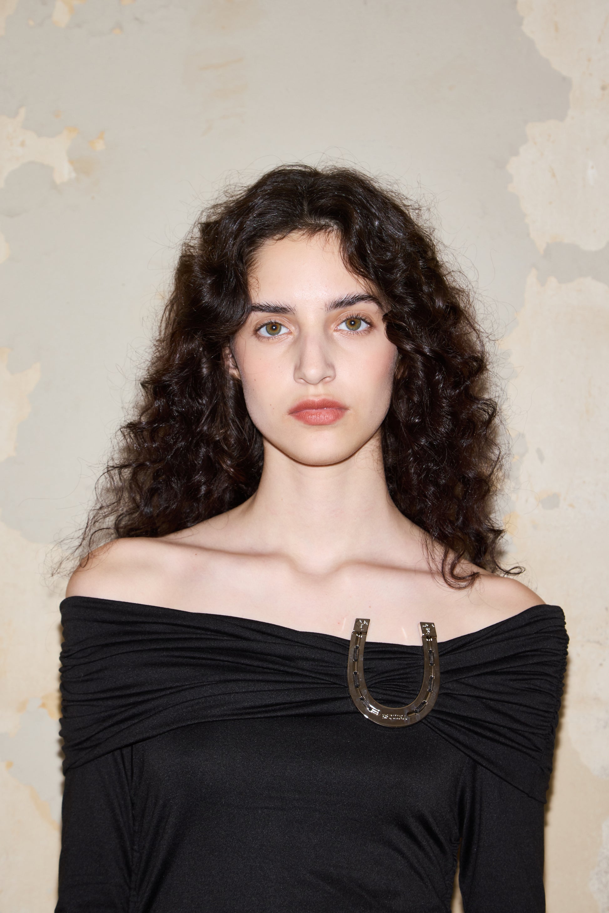 Sophisticated long-sleeve boat neck dress featuring ESQUINA's signature horseshoe detail. Side gathering straps allow adjustable length customization, while sleeves include practical thumb holes. Crafted from sueded jersey fabric requiring hand washing.