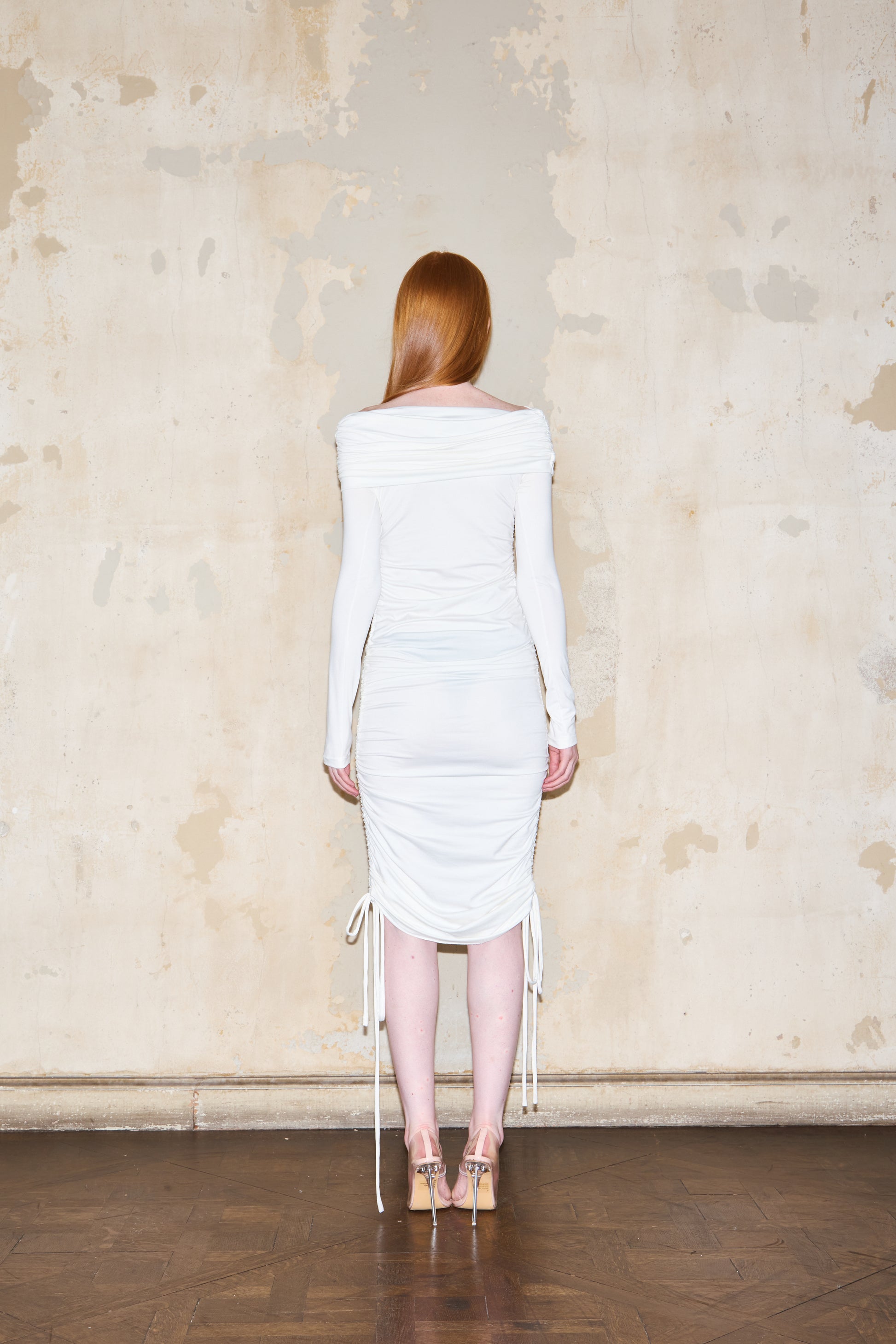 Sophisticated long-sleeve boat neck dress featuring ESQUINA's signature horseshoe detail. Side gathering straps allow adjustable length customization, while sleeves include practical thumb holes. Crafted from sueded jersey fabric requiring hand washing.