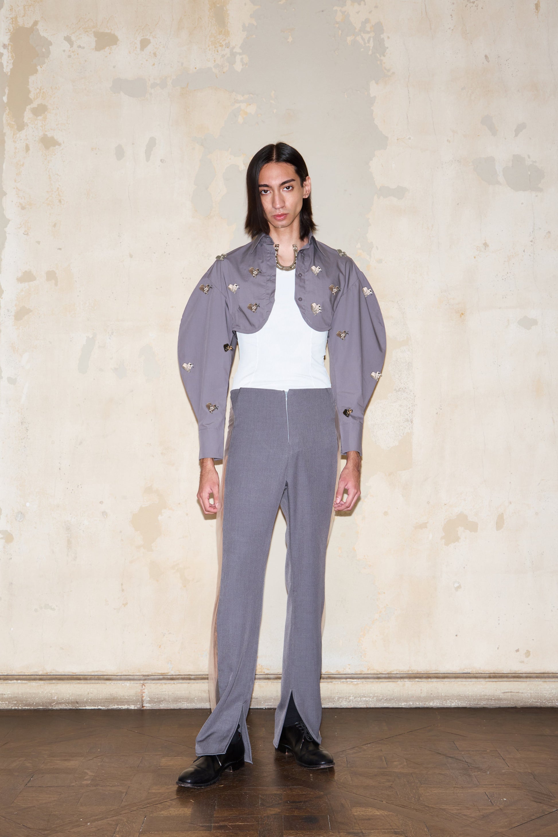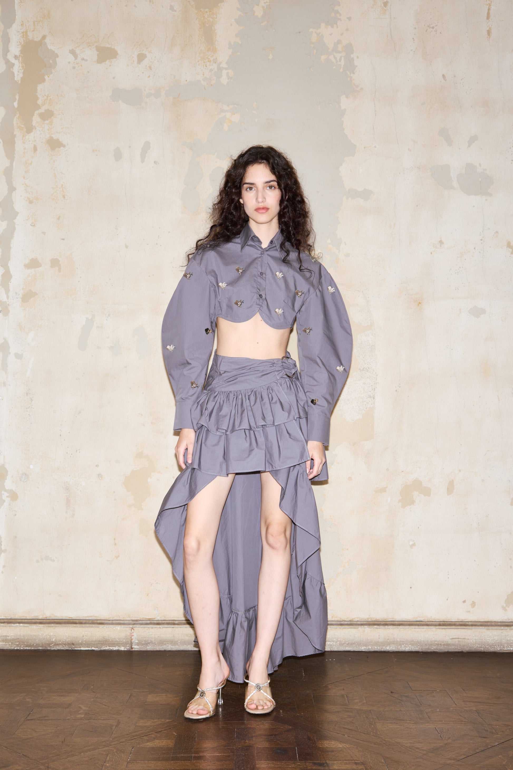 Sophisticated crop shirt crafted from premium Italian poplin. Features a distinctive undulating front hem, voluminous sleeves, and signature Esquina Logos in zemac (heart + horse). The tailored lower section creates an elegant silhouette. Italian-made poplin requires dry cleaning only.