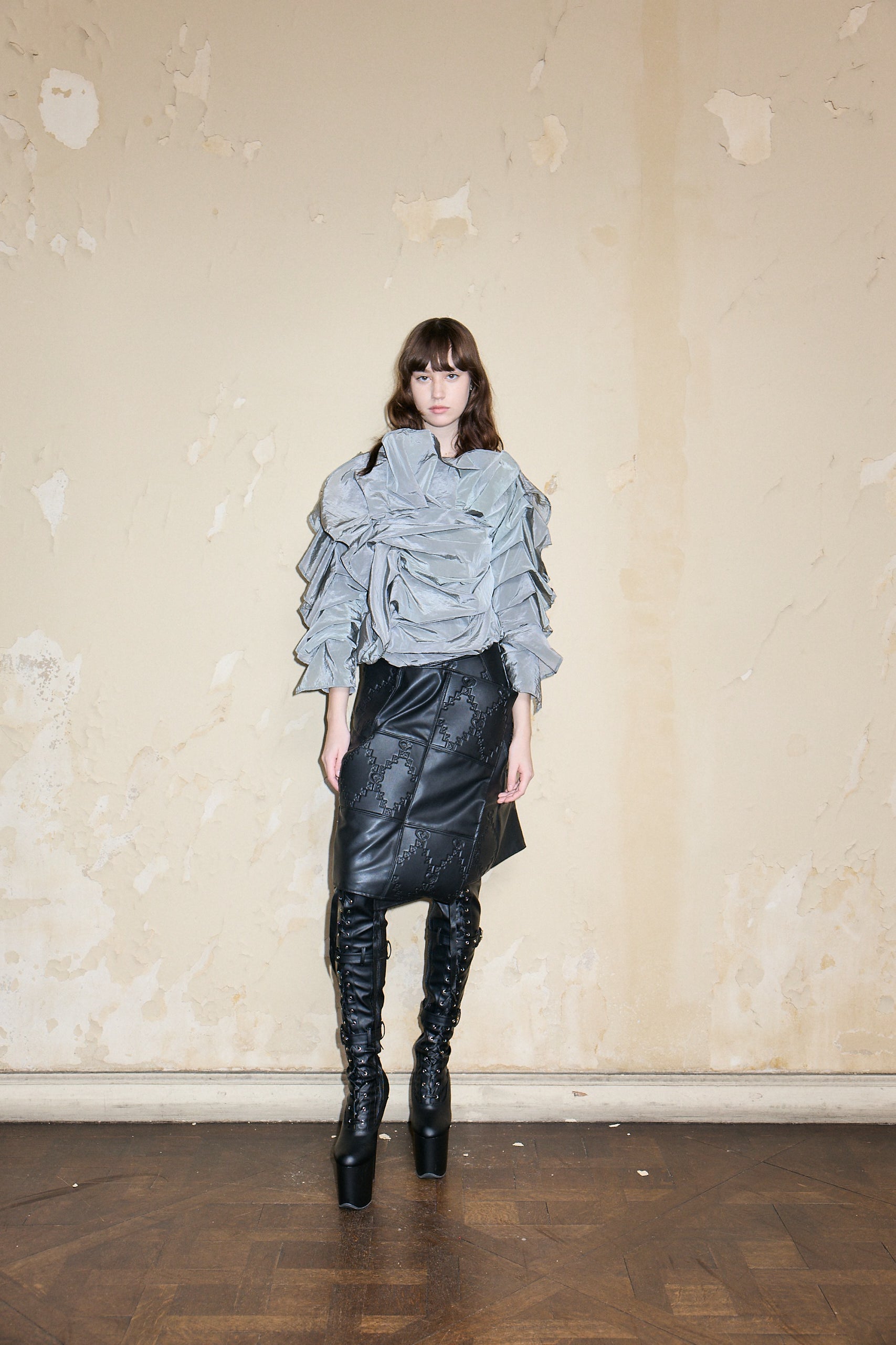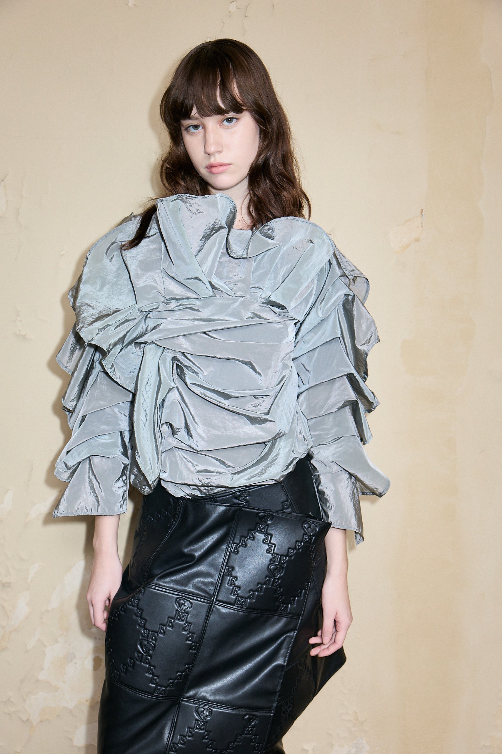Packed with volume, draping, and ruffles, this long sleeves blouse is crafted with technical fabric and requires hand washing in cold water.