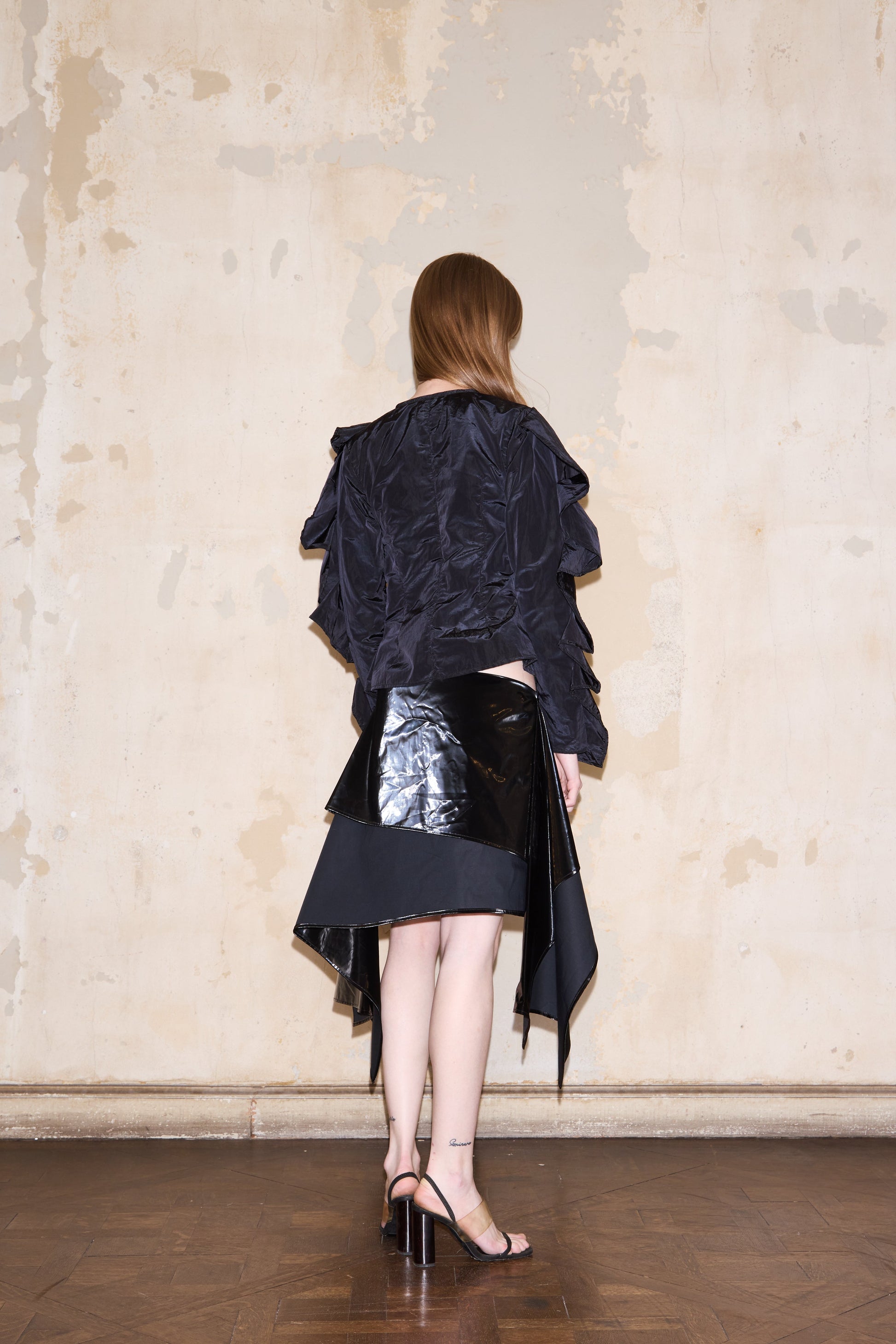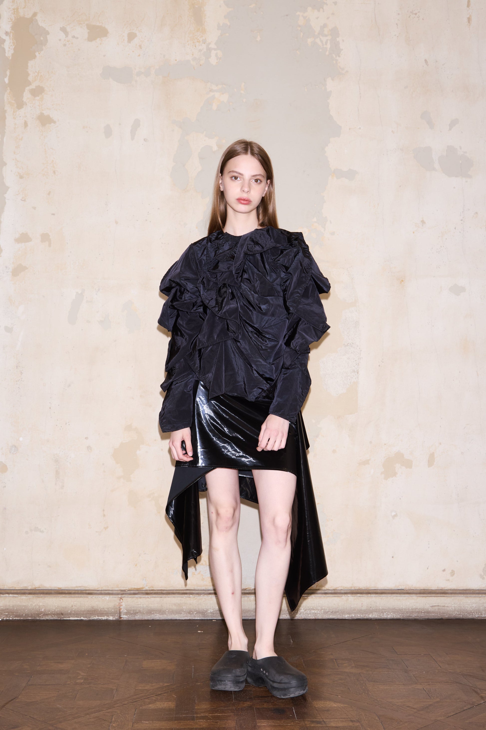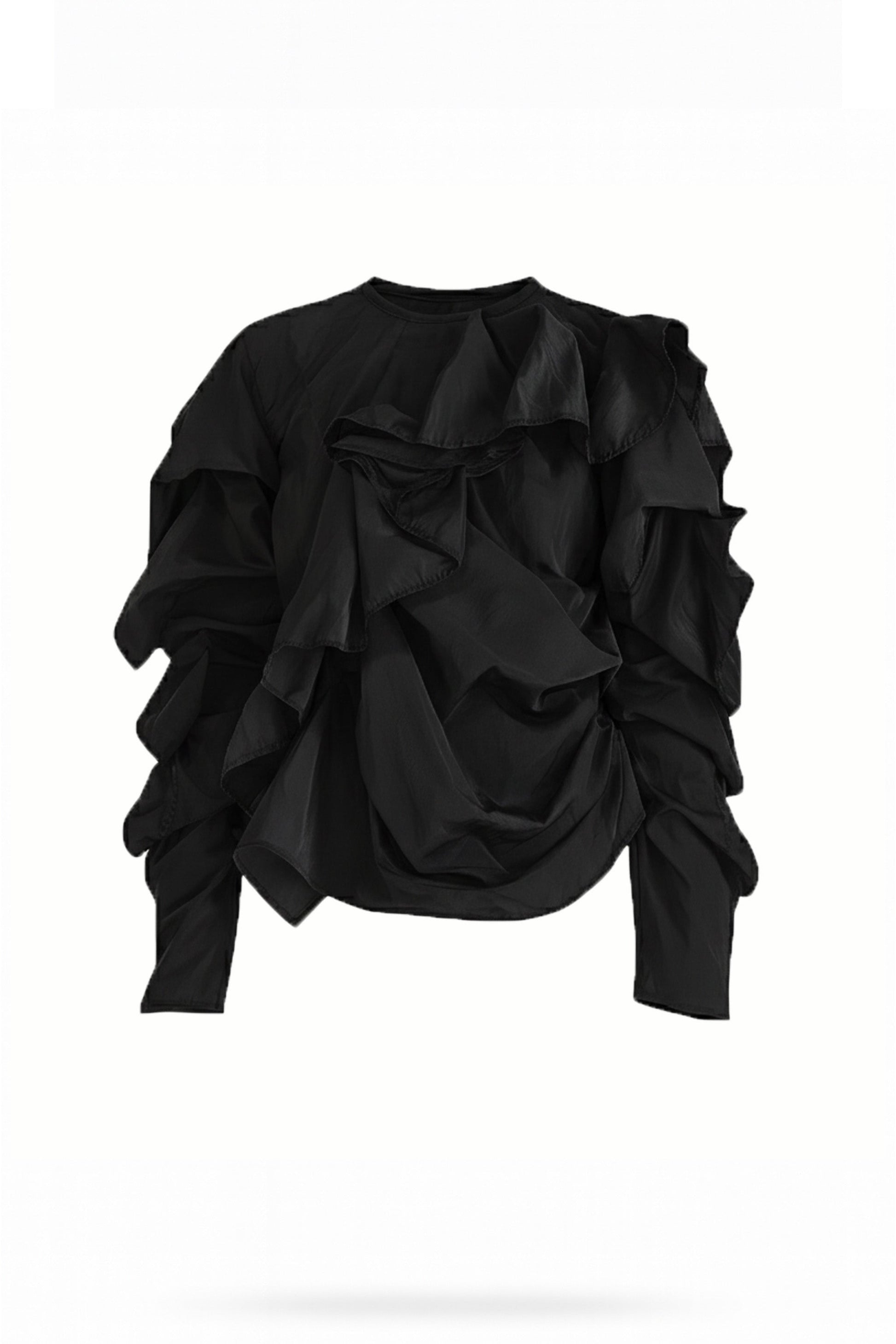 Blusa con volúmen, drapeada y con volados en frente y mangas.