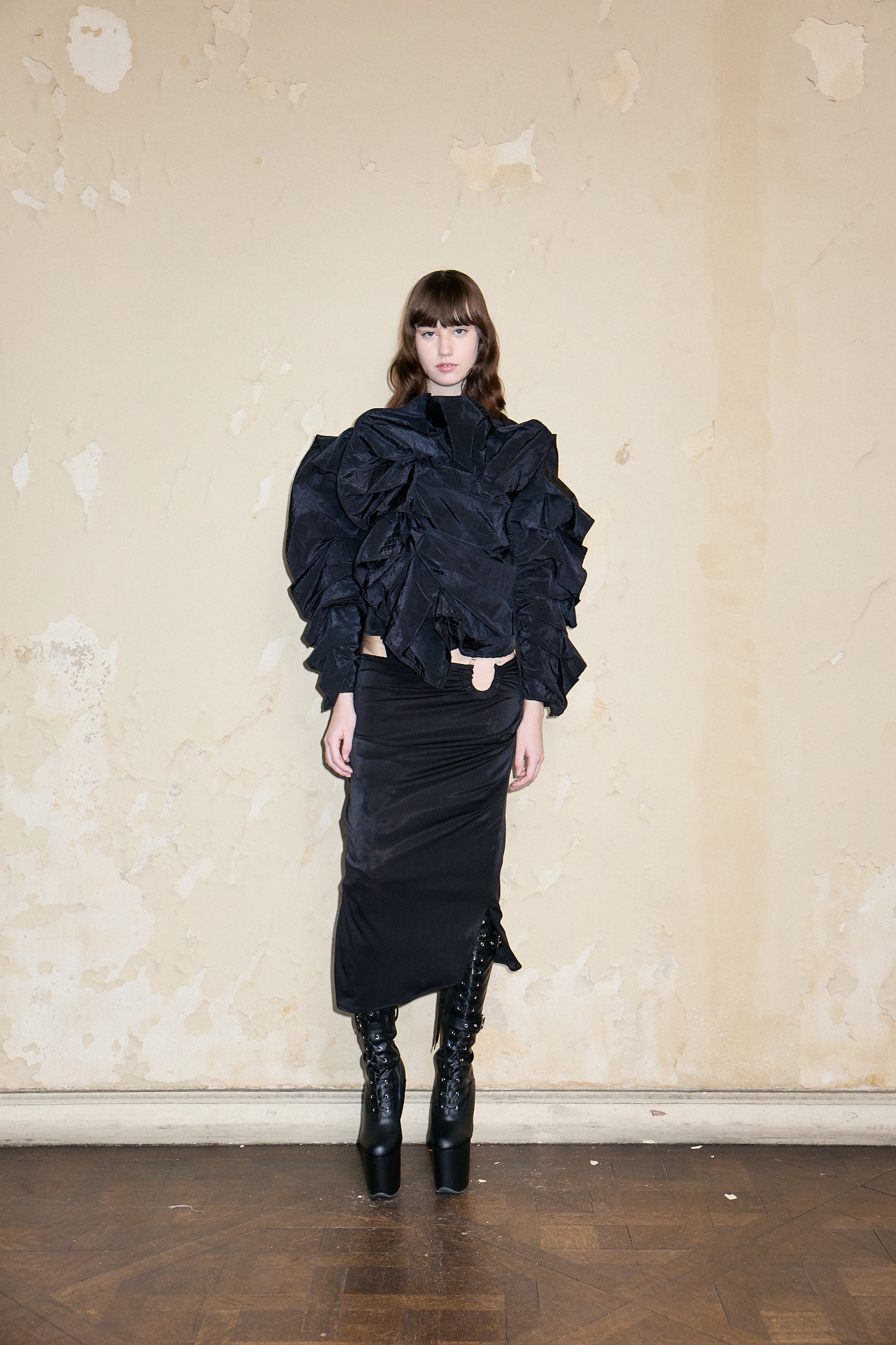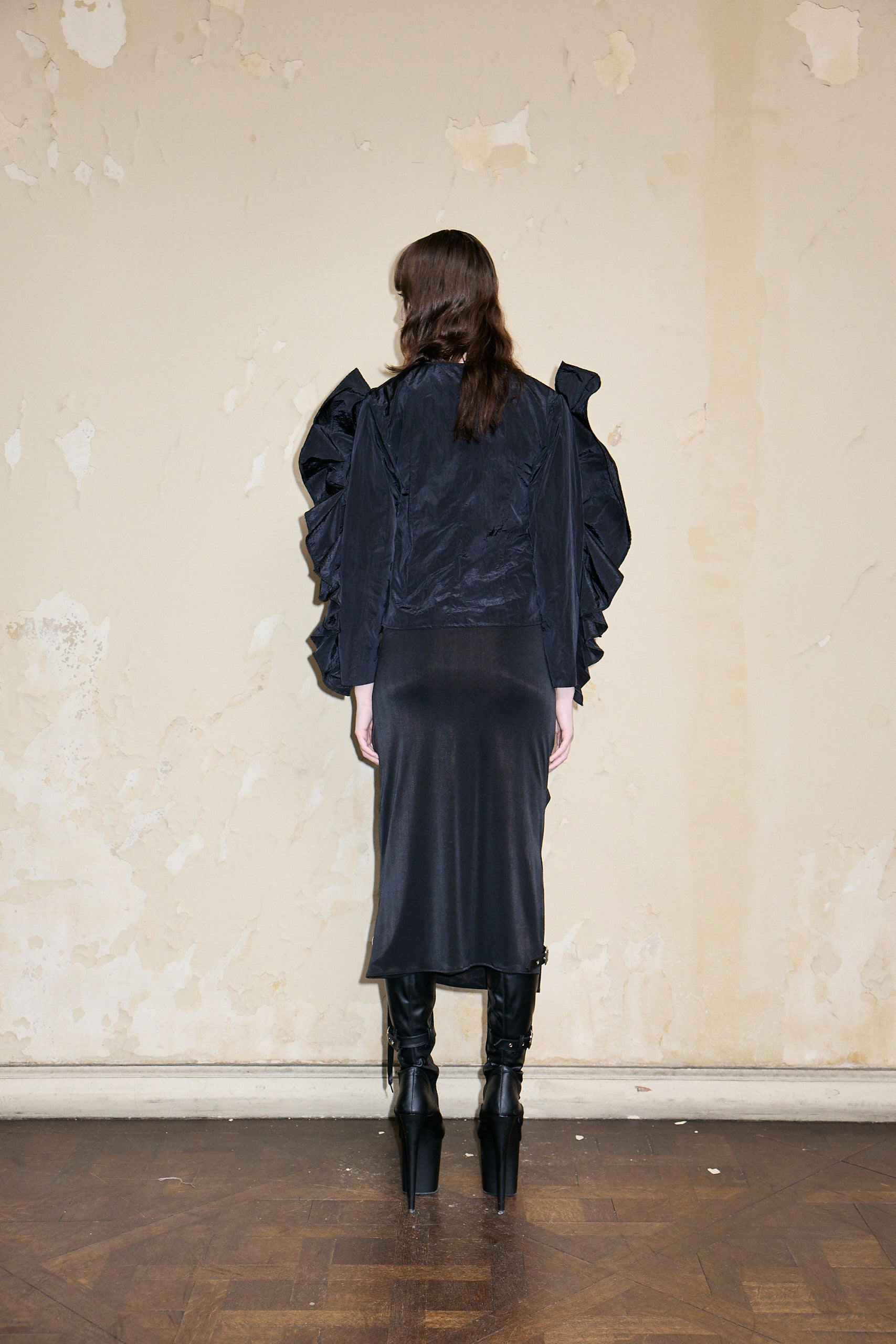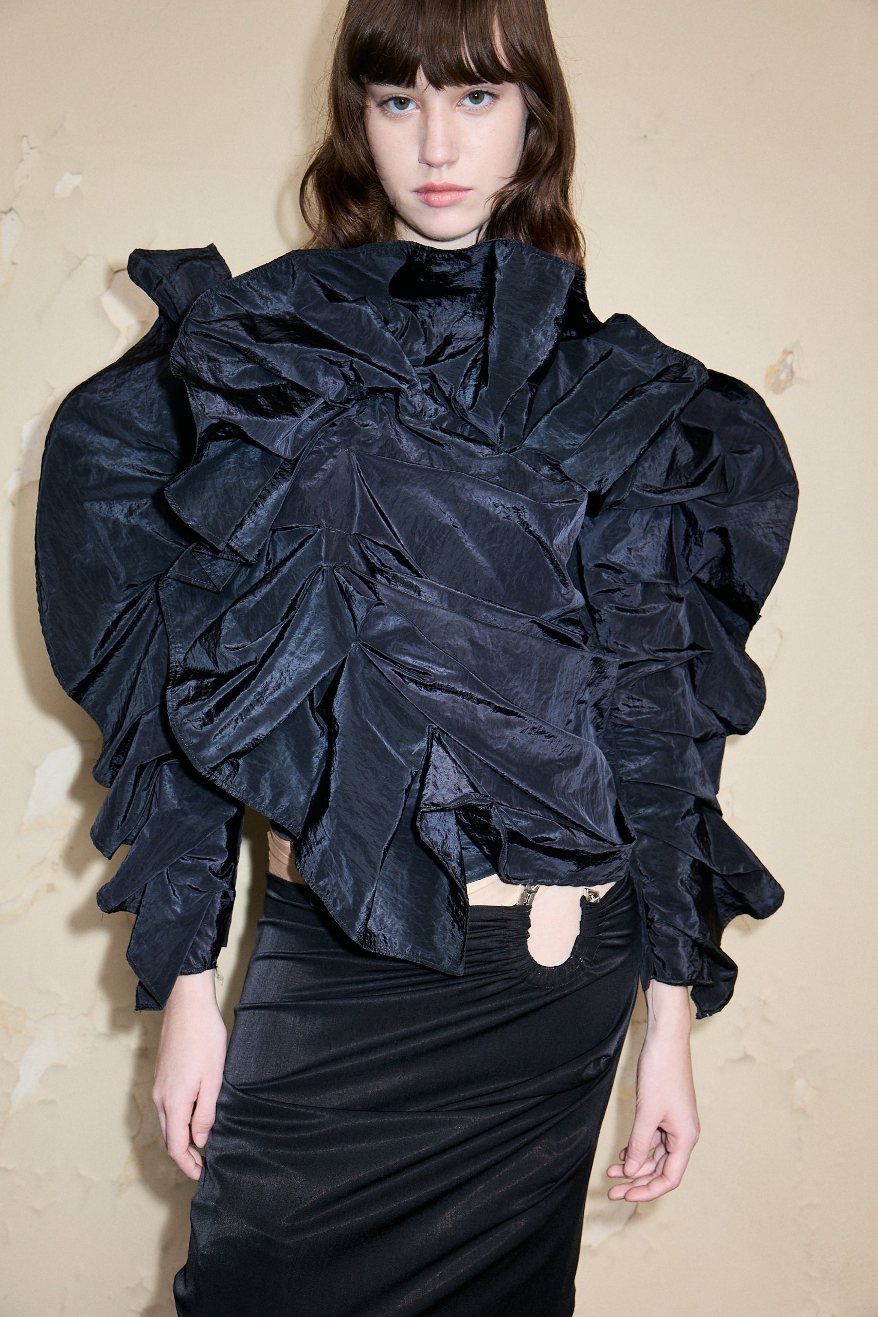 Packed with volume, draping, and ruffles, this long sleeves blouse is crafted with technical fabric and requires hand washing in cold water.