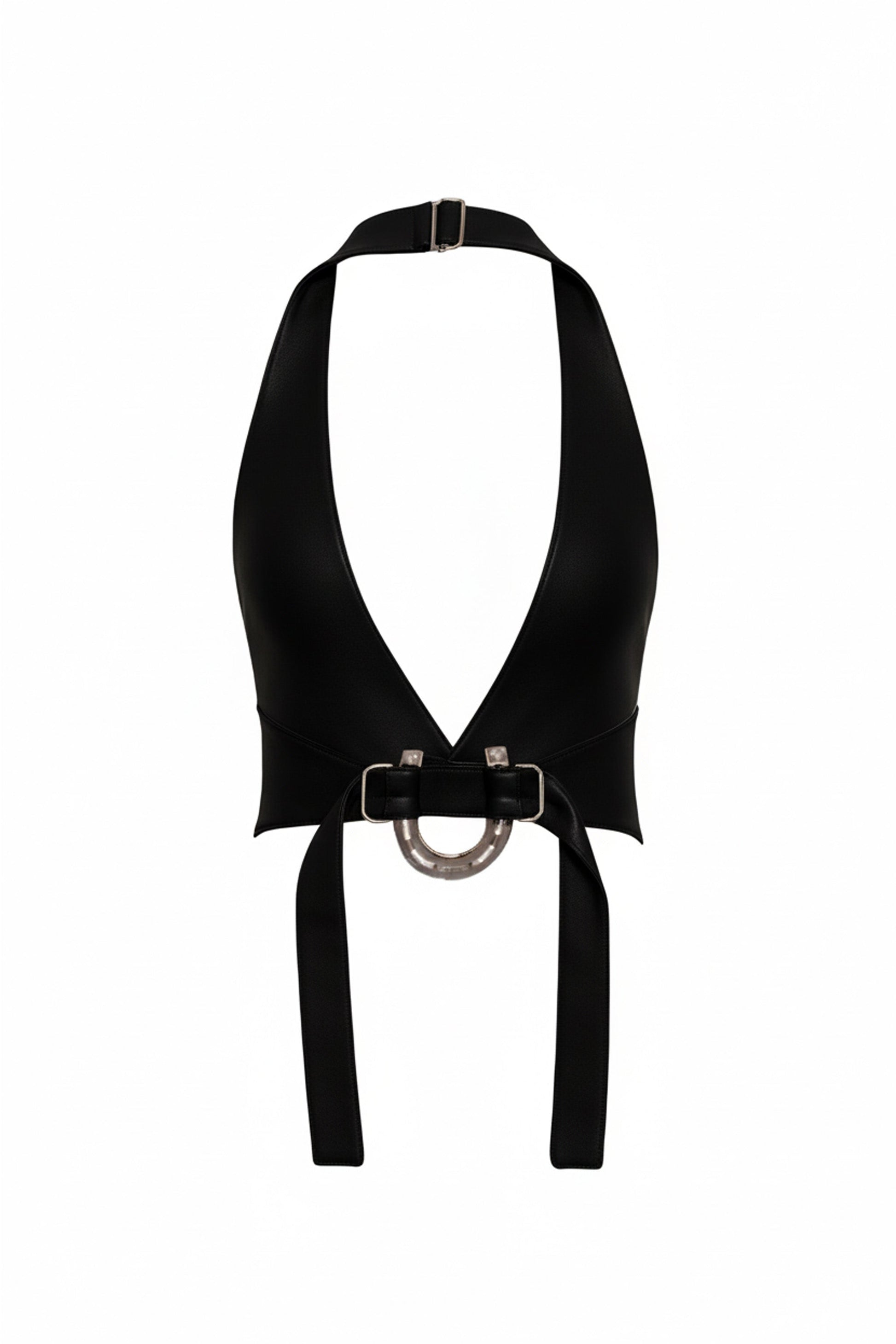 Sophisticated sleeveless layer crafted from Italian crepe with expert tailoring. Features an open back design secured by a neck buckle and adjustable waist drawstrings, accented with a distinctive horseshoe corner detail.