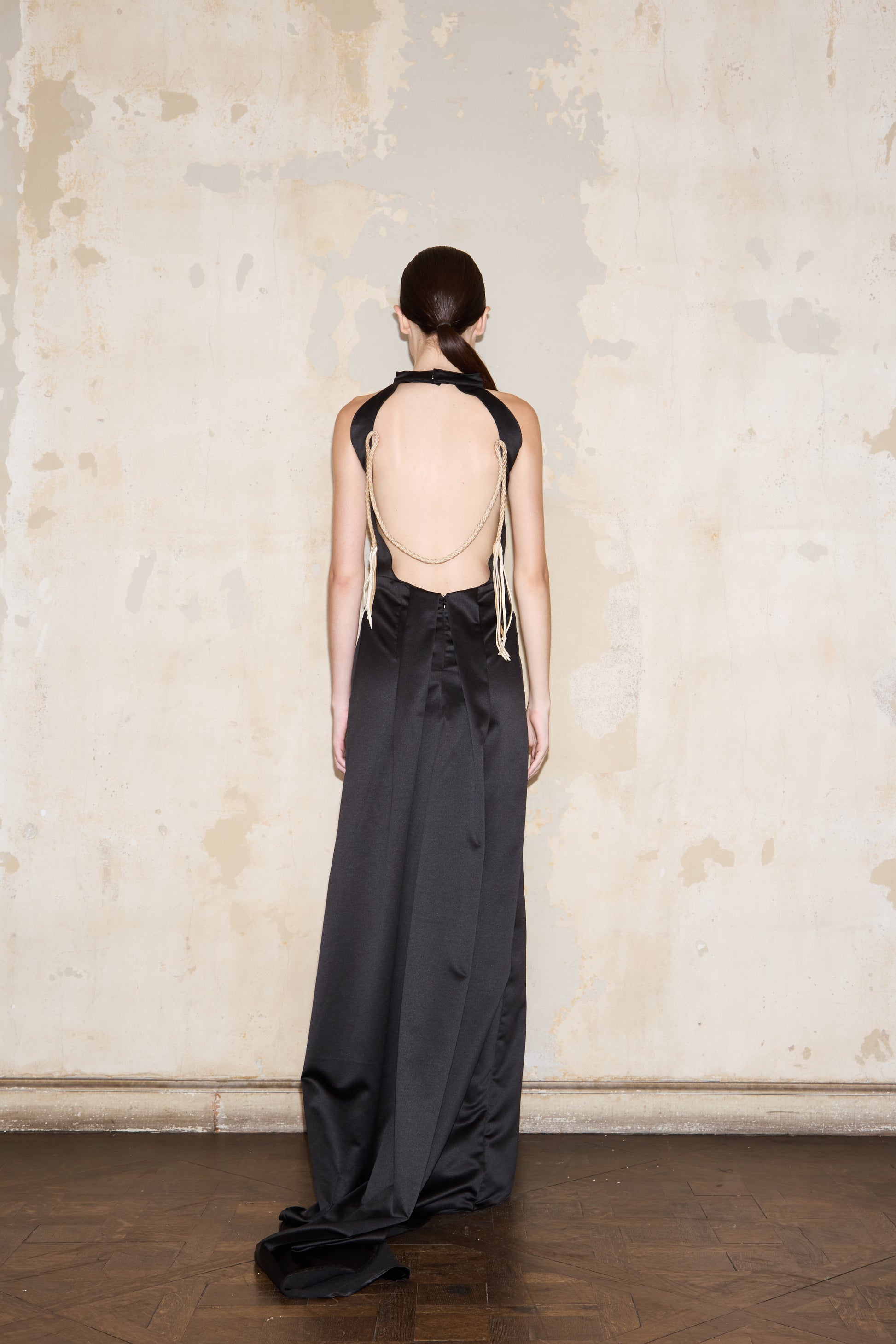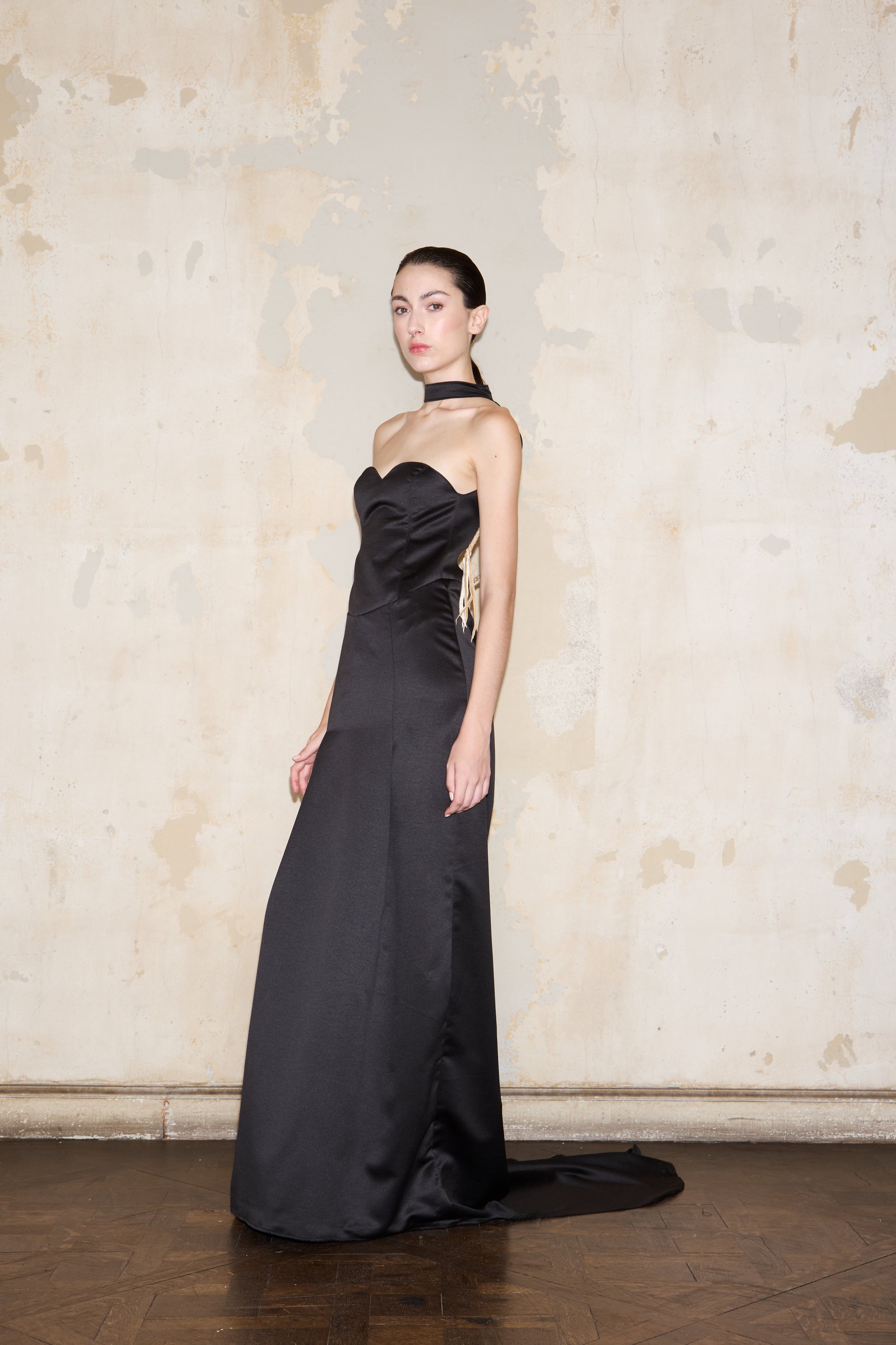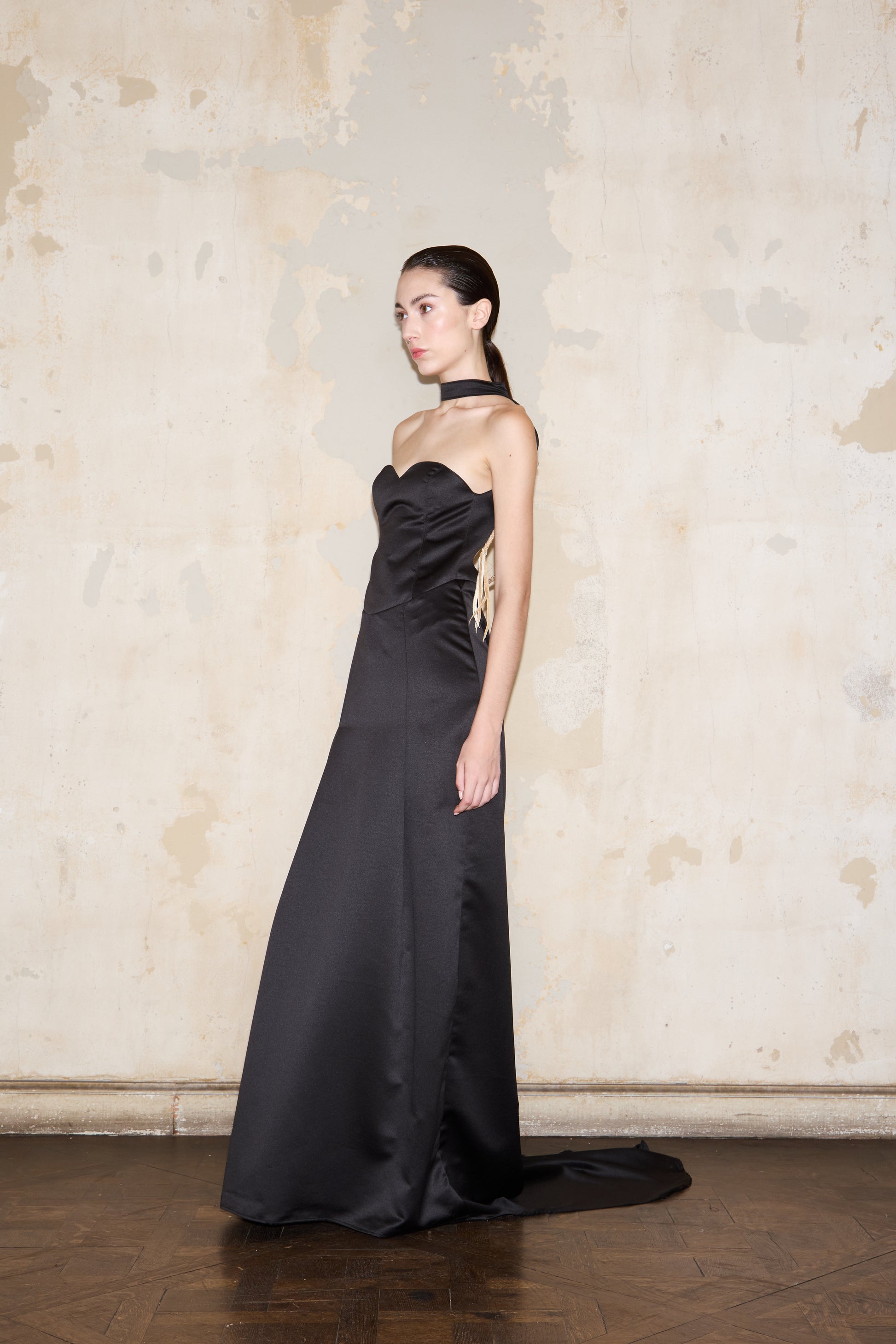 Long strapless dress with a heart-shaped neckline. The fitted bodice transitions into a straight skirt at the front, while the back features two pleats that open into a dramatic train. It also includes a strap that crosses over the shoulders and neck, with a traditional criolla lacing detail at the back.