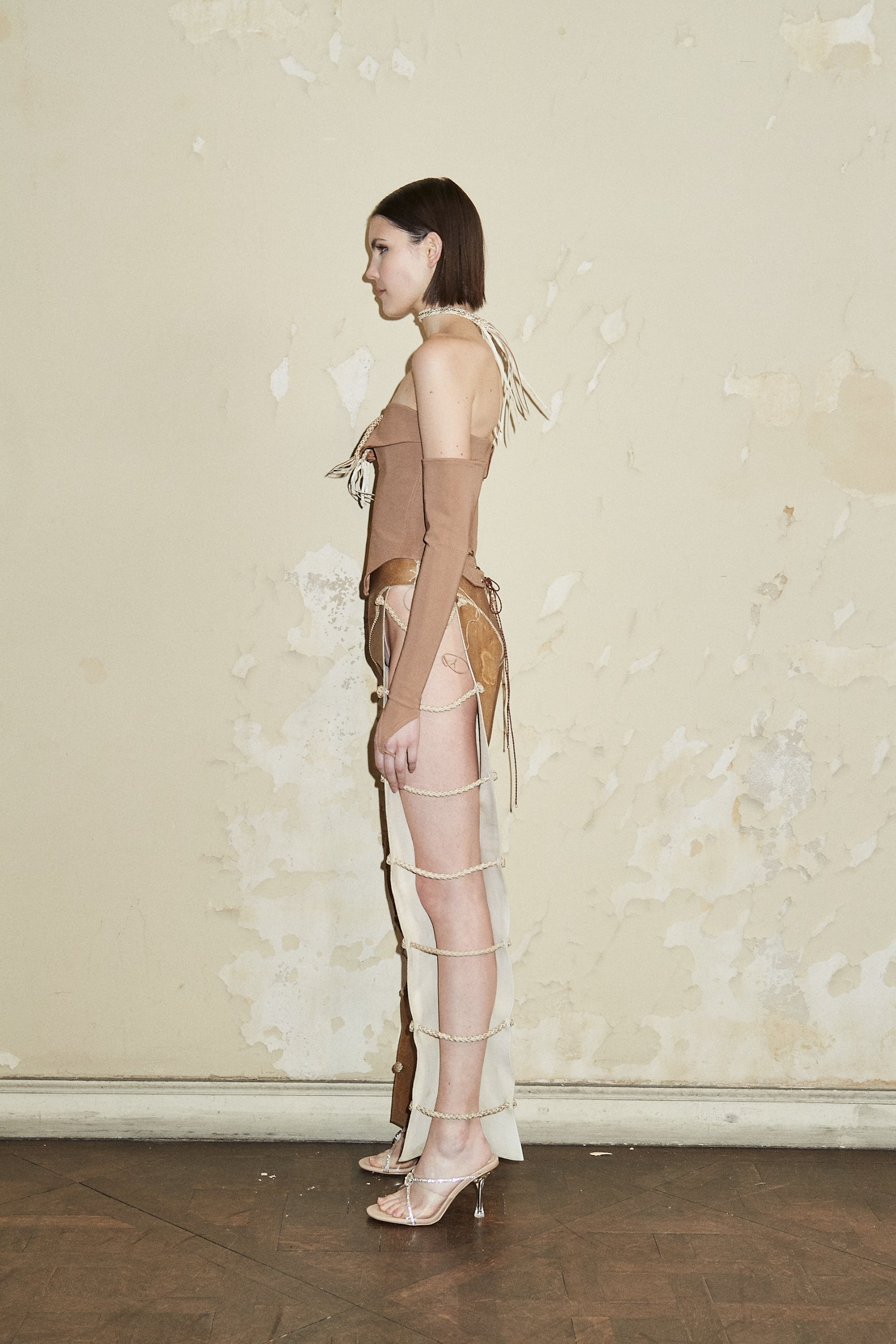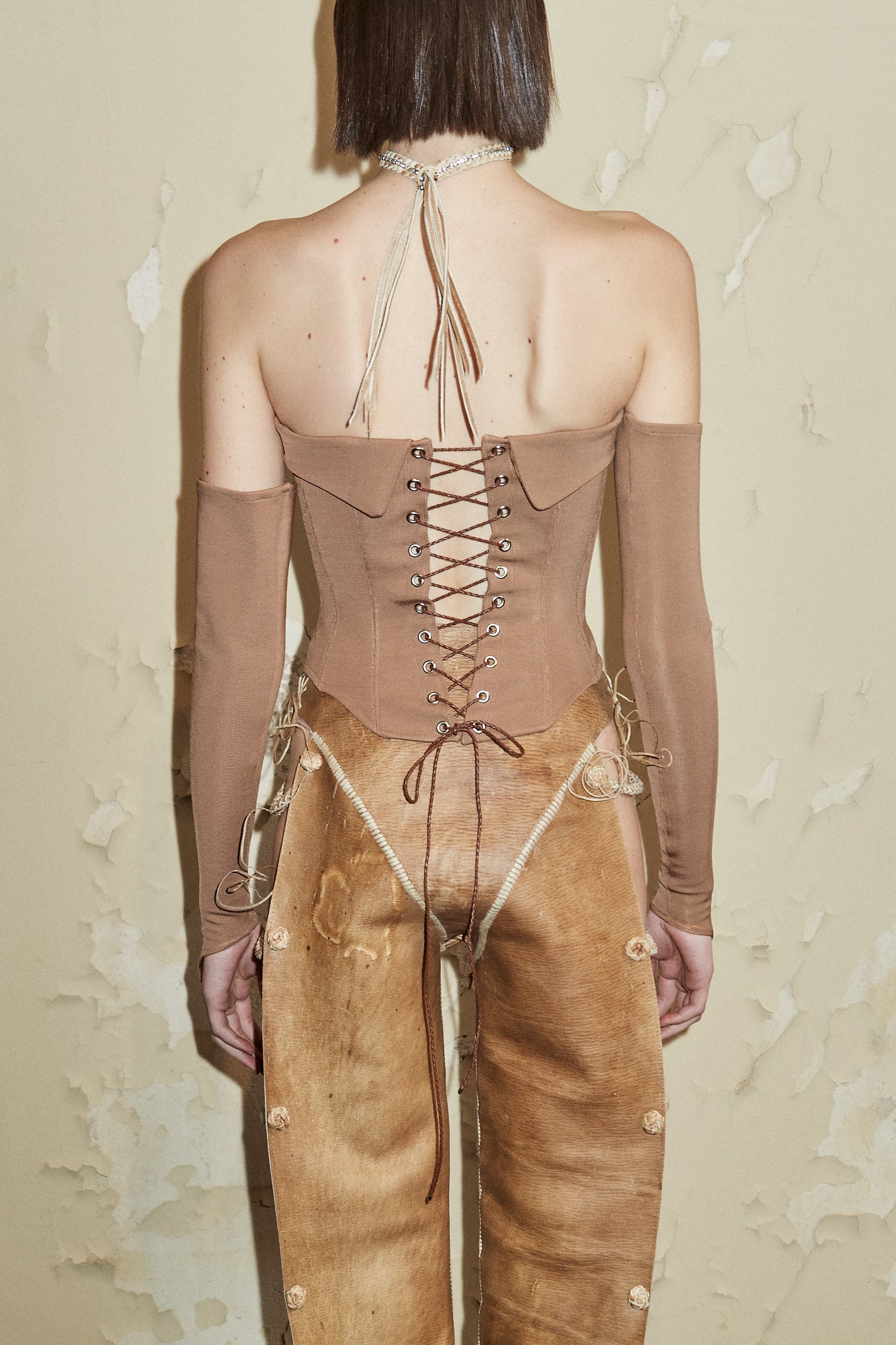 Strapless corset of Italian technical fabric. Straight neckline, opening in the center of the chest contoured with a leather braid made by artisan Jerónimo Coll. The back closes with crisscross straps.