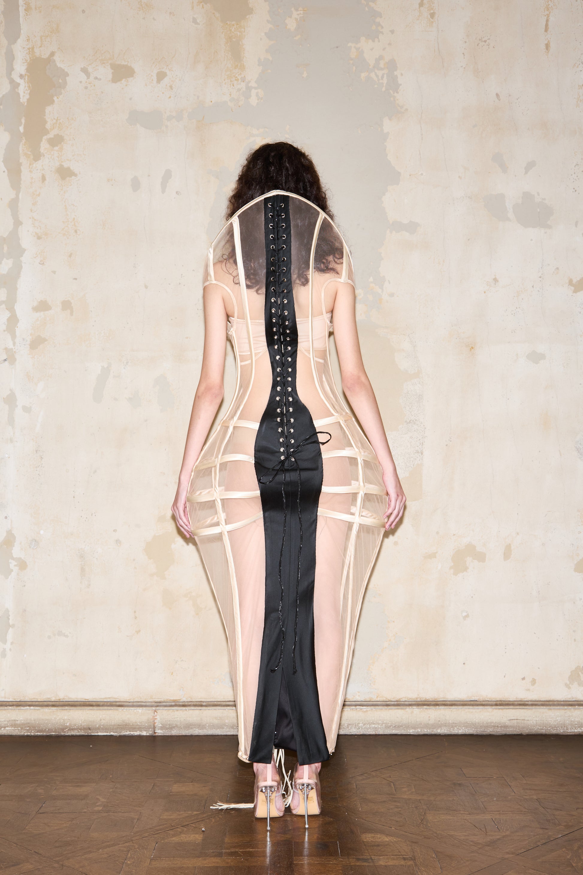 Sophisticated floor-length gown featuring a structured nude mesh with boning, complemented by heavy silk front and back panels. The back closure consists of eyelets with interlaced ribbon. Handcrafted flat leather braids adorn the silk front panel. Composed of mesh, heavy silk, and leather.