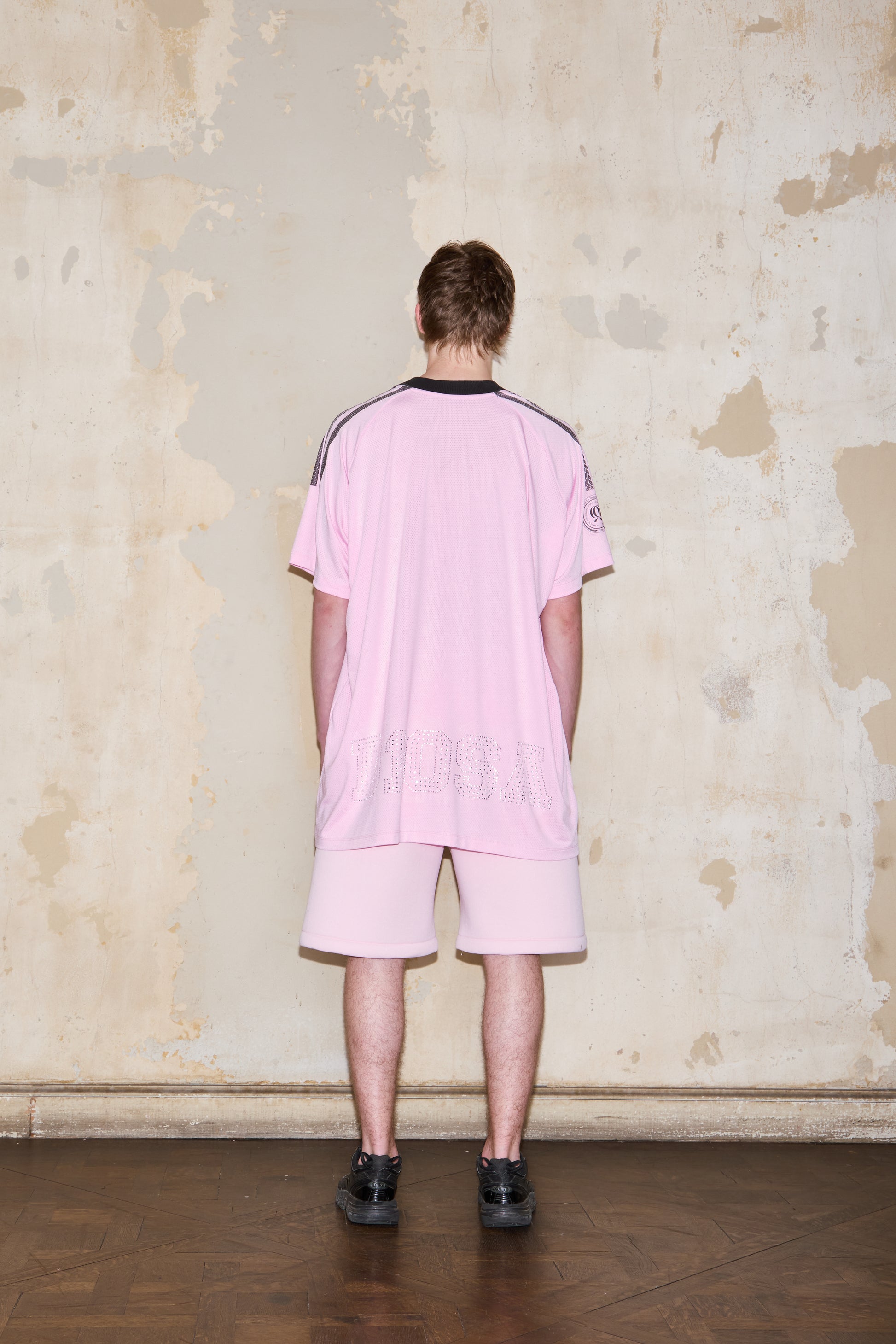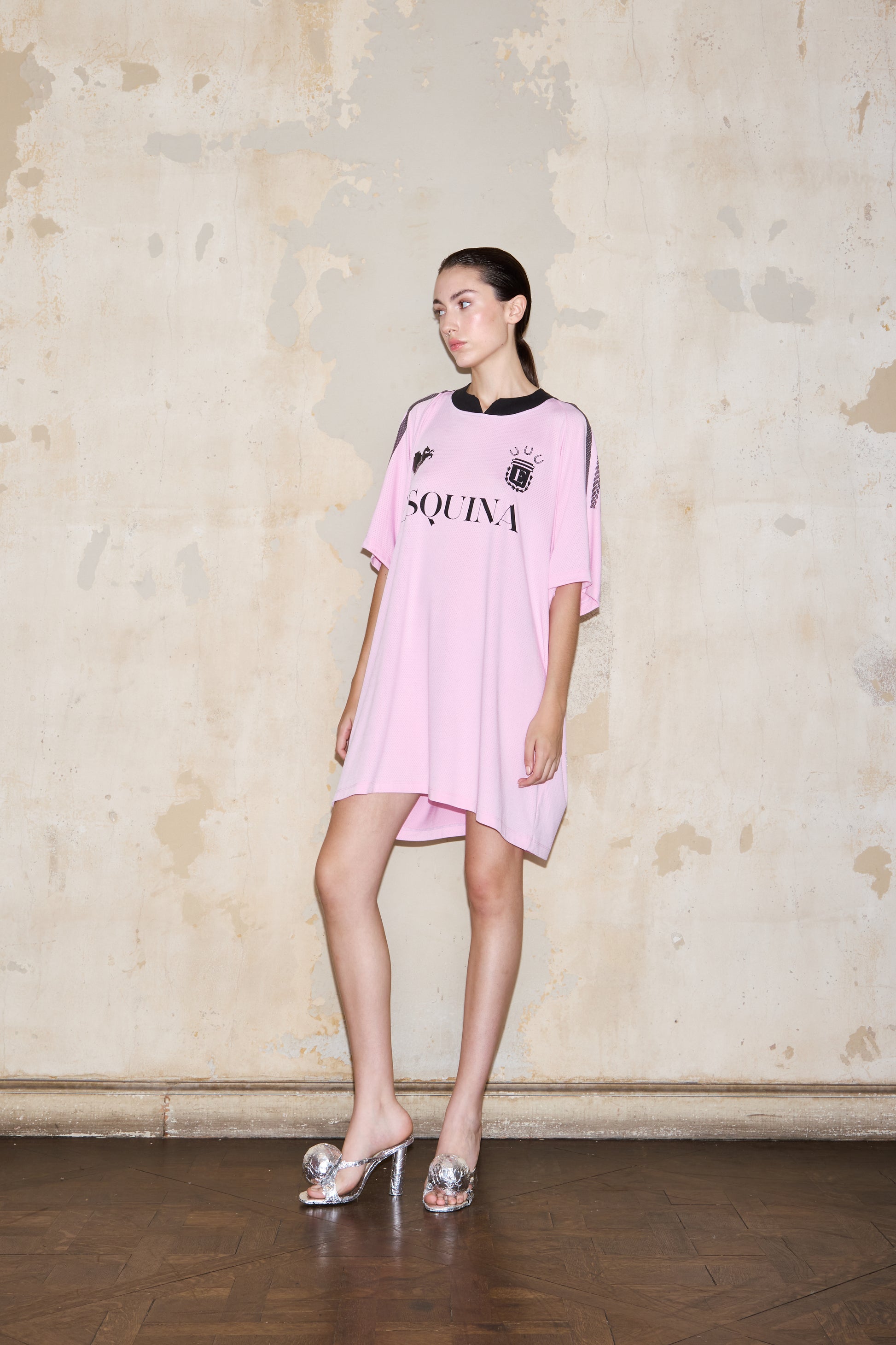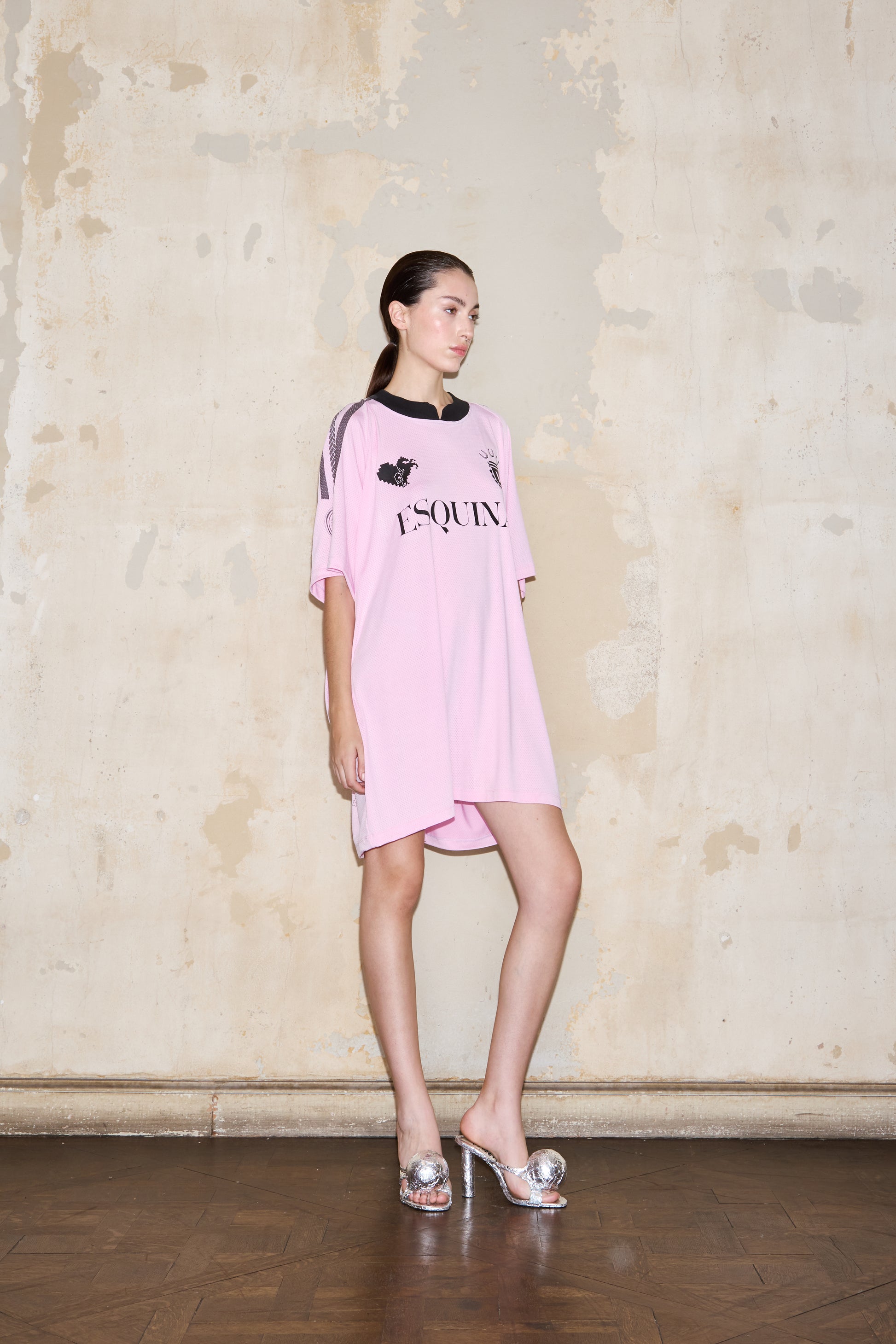 Oversized football t-shirt with short sleeves and ESQUINA's logos on the front. The back features the inscription "D10SA" in rhinestones, and a white ribbed neckline.
