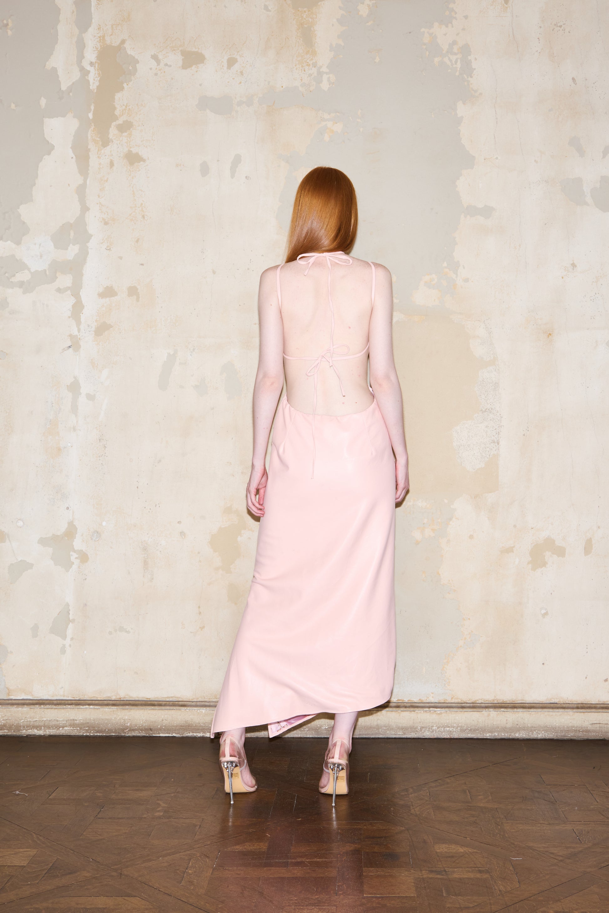 Sleek eco-leather dress featuring an inverted sweetheart neckline and sleeveless design. The asymmetrical straight skirt complements its open back with crossover tie closure. Requires professional cleaning.