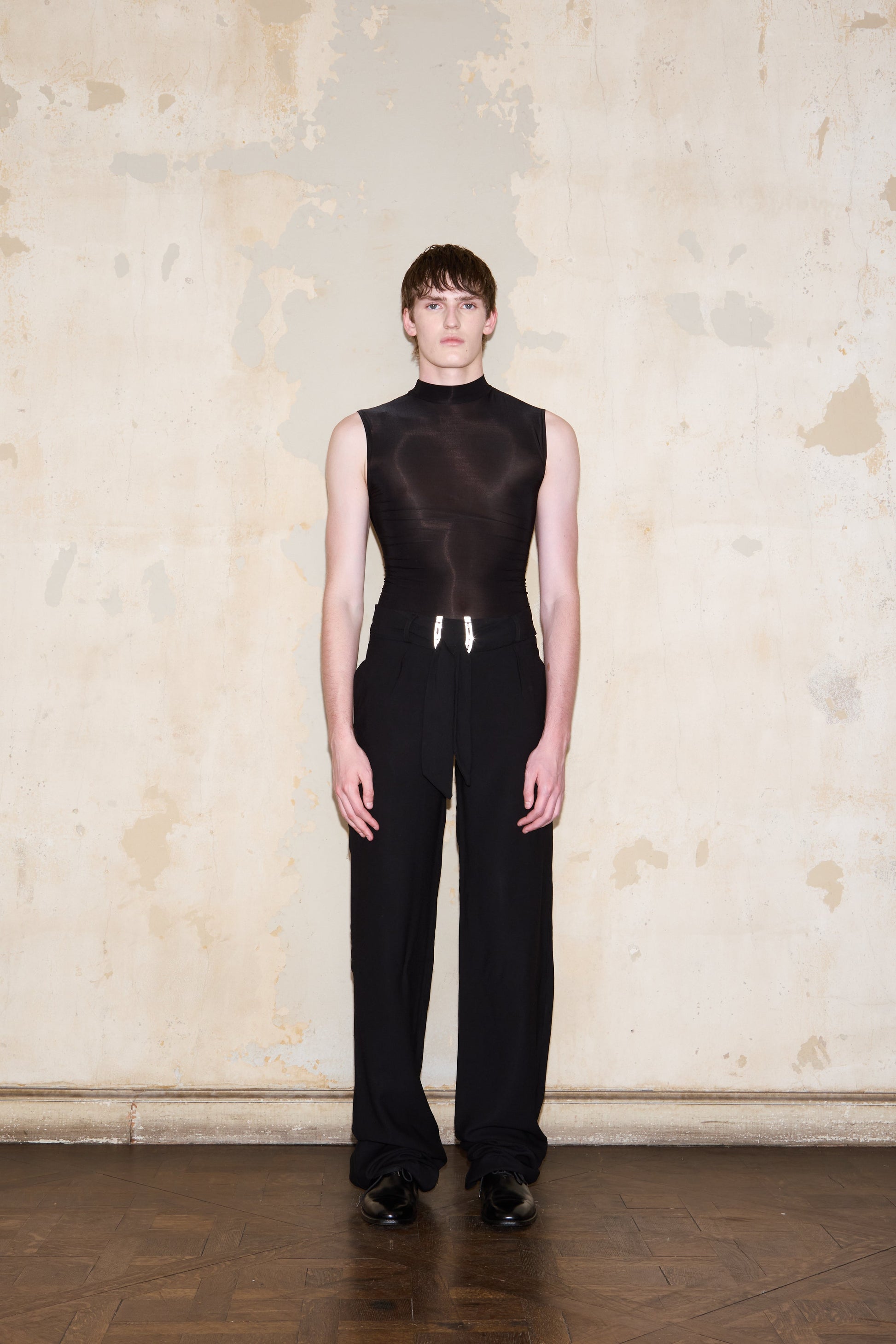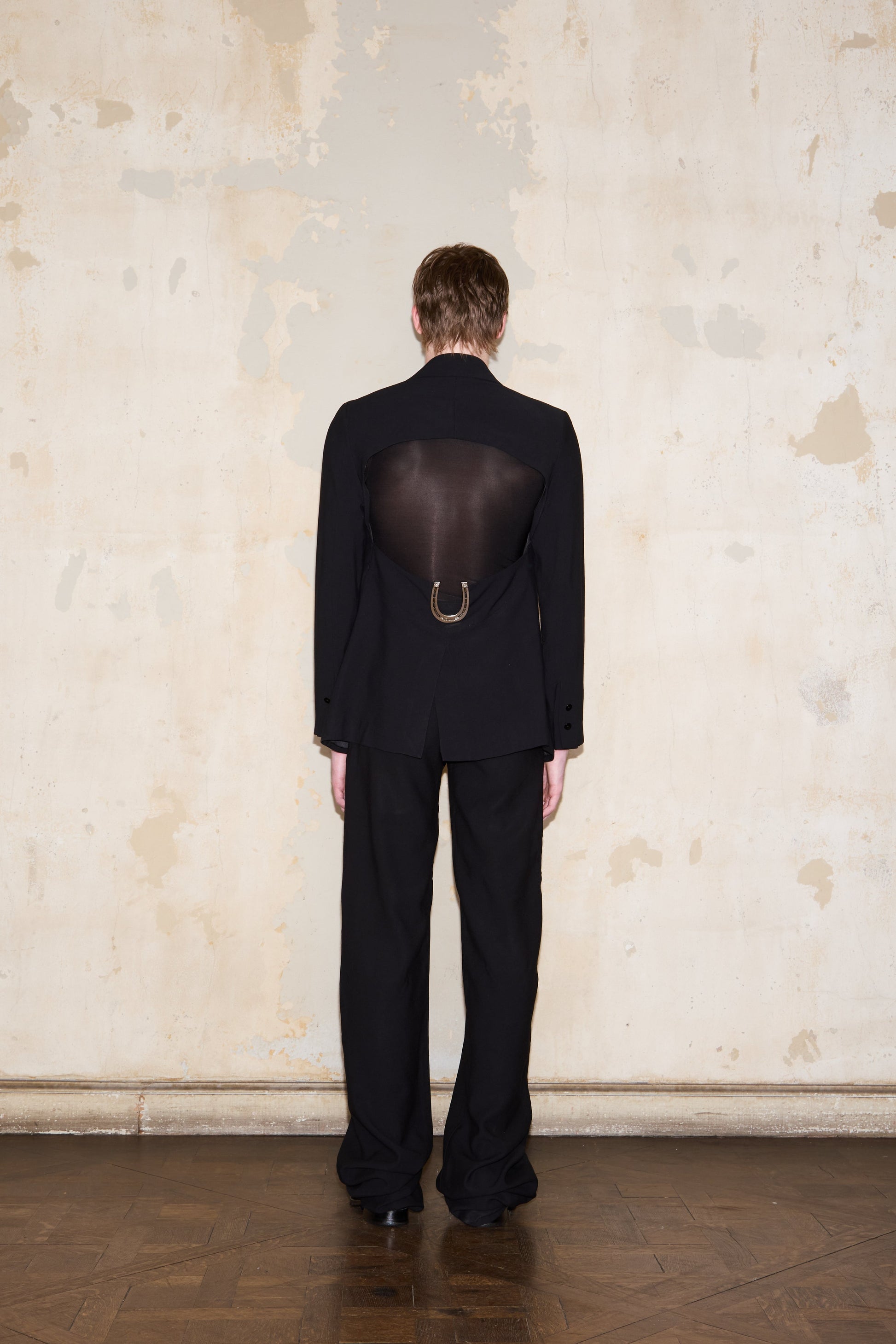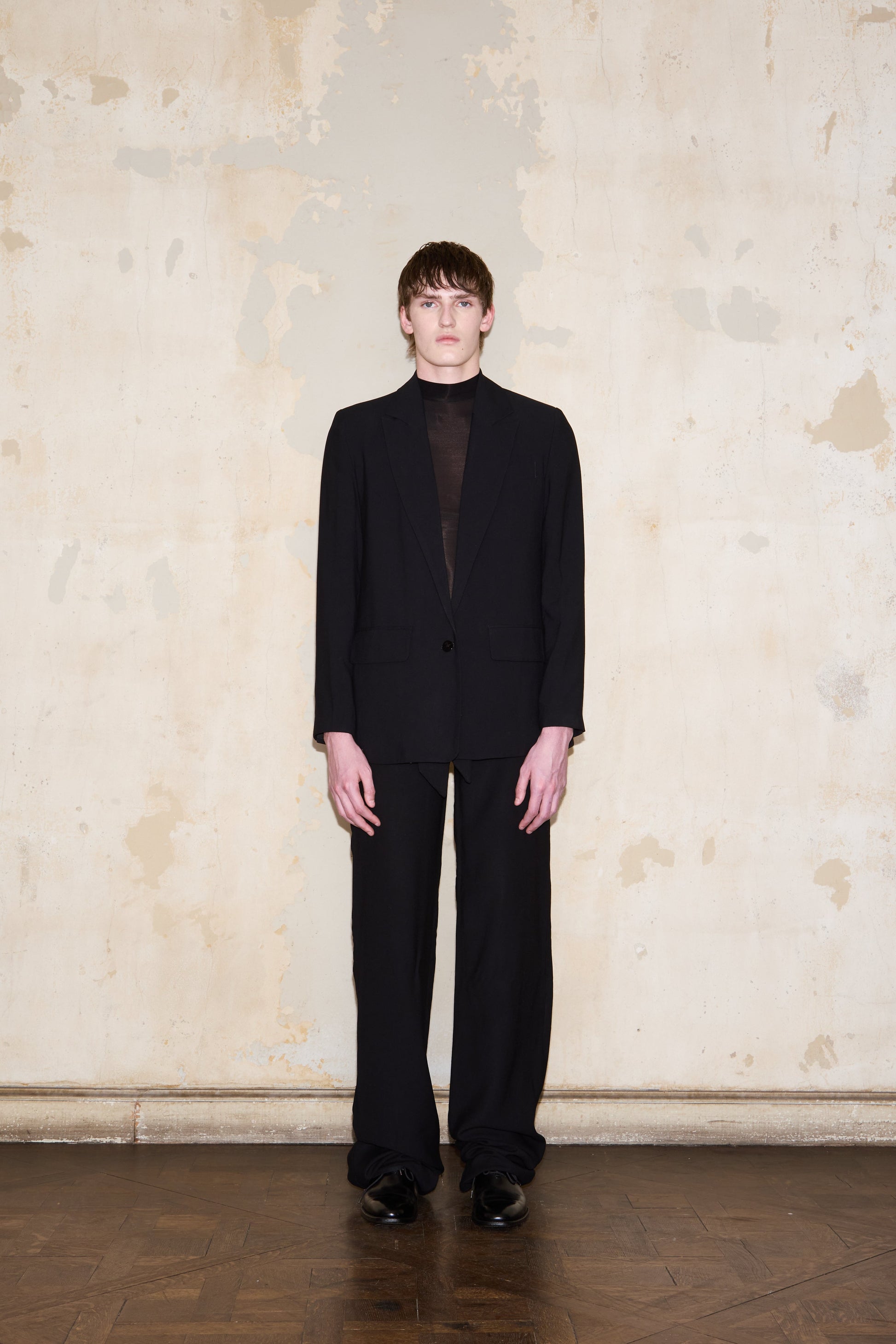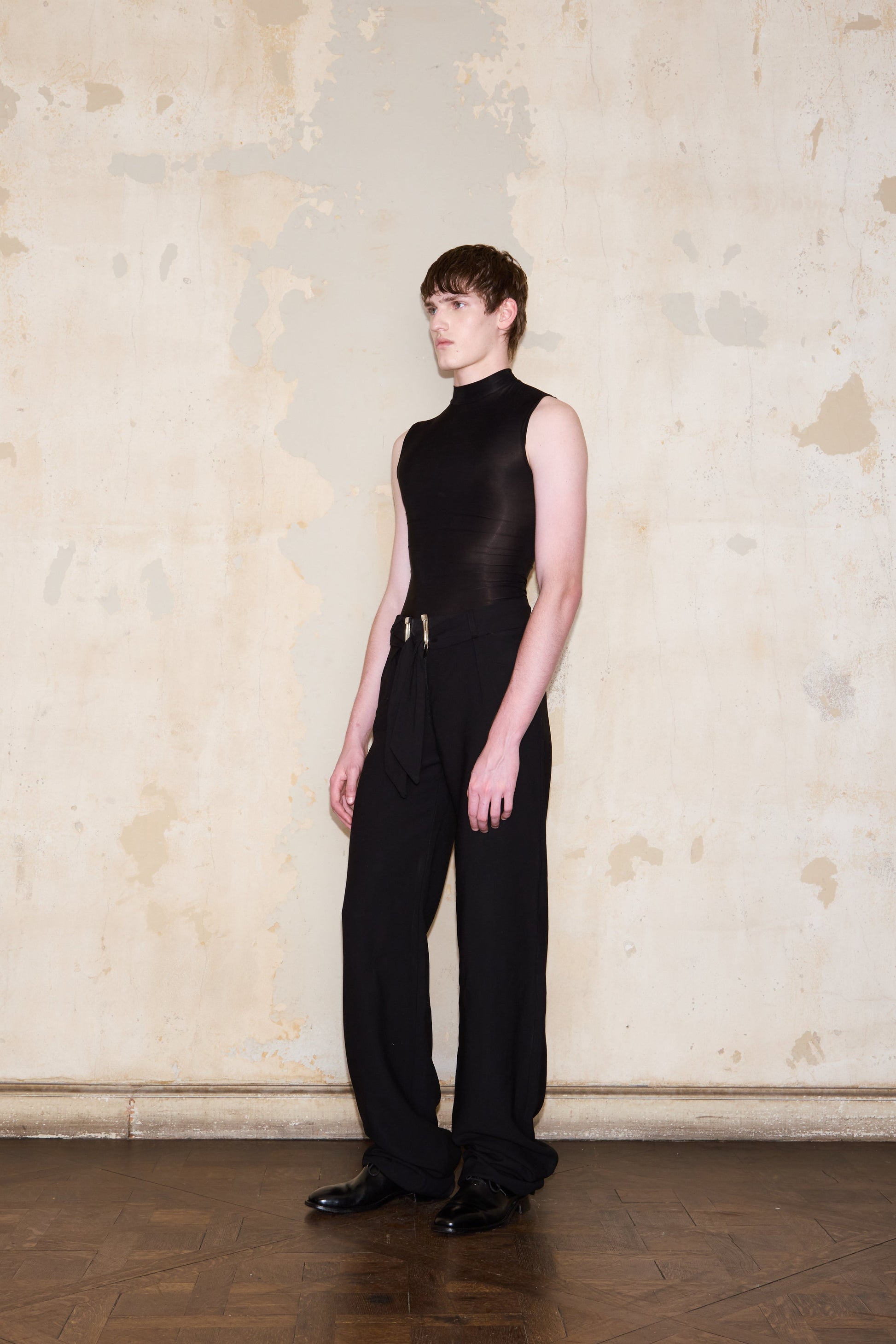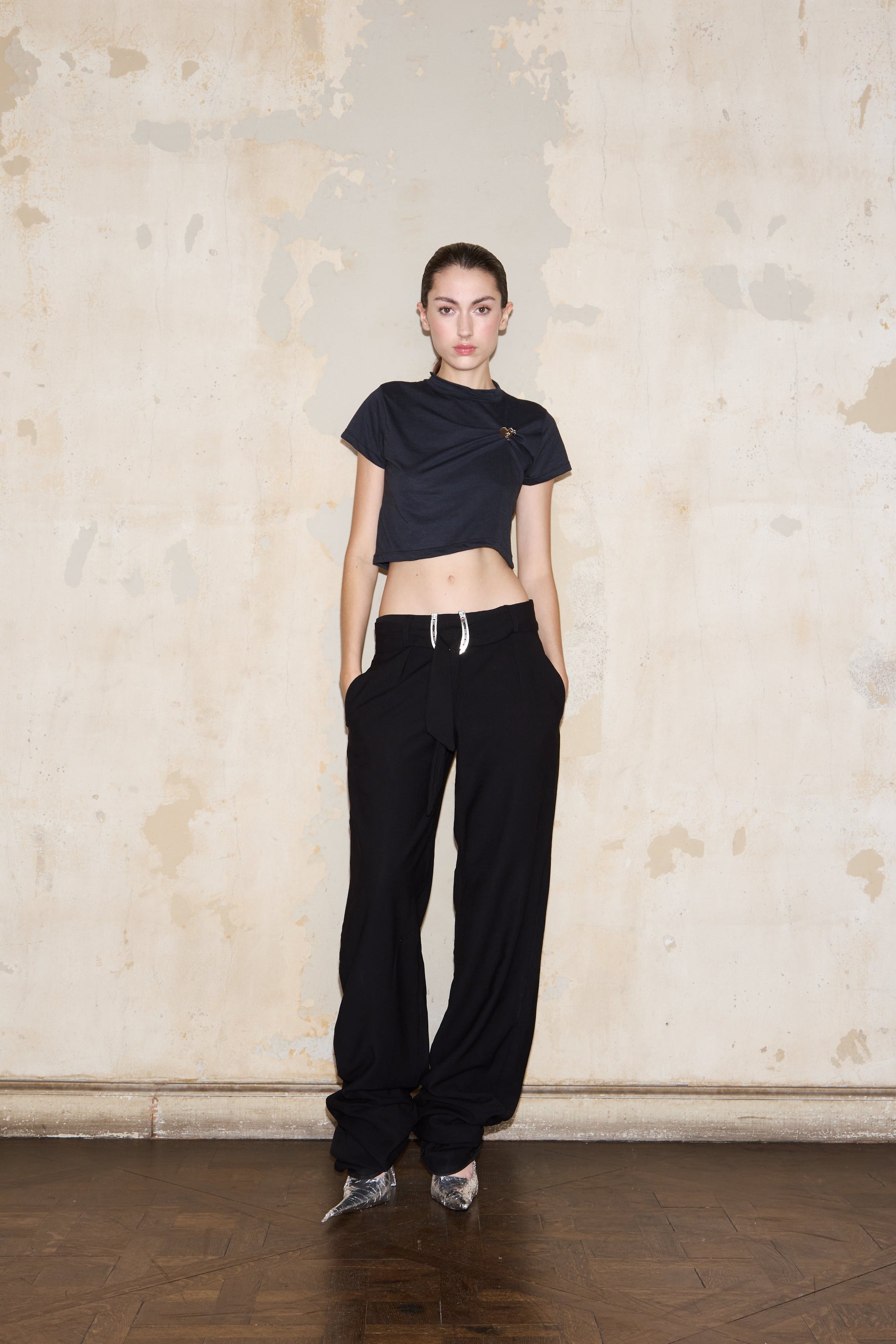 Extra-long straight pants with a matching fabric belt that fastens at the front, passing through the ESQUINA horseshoe detail.