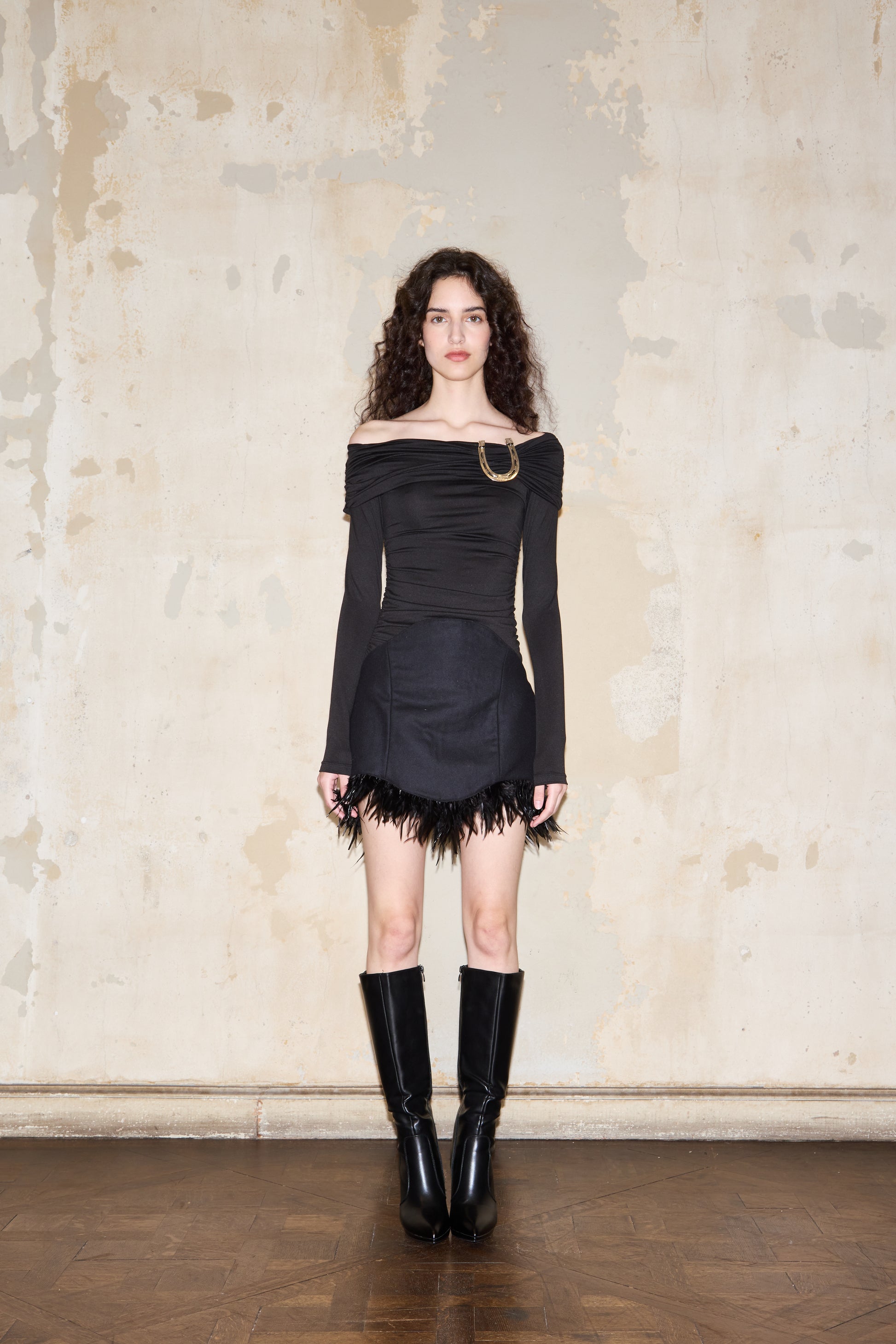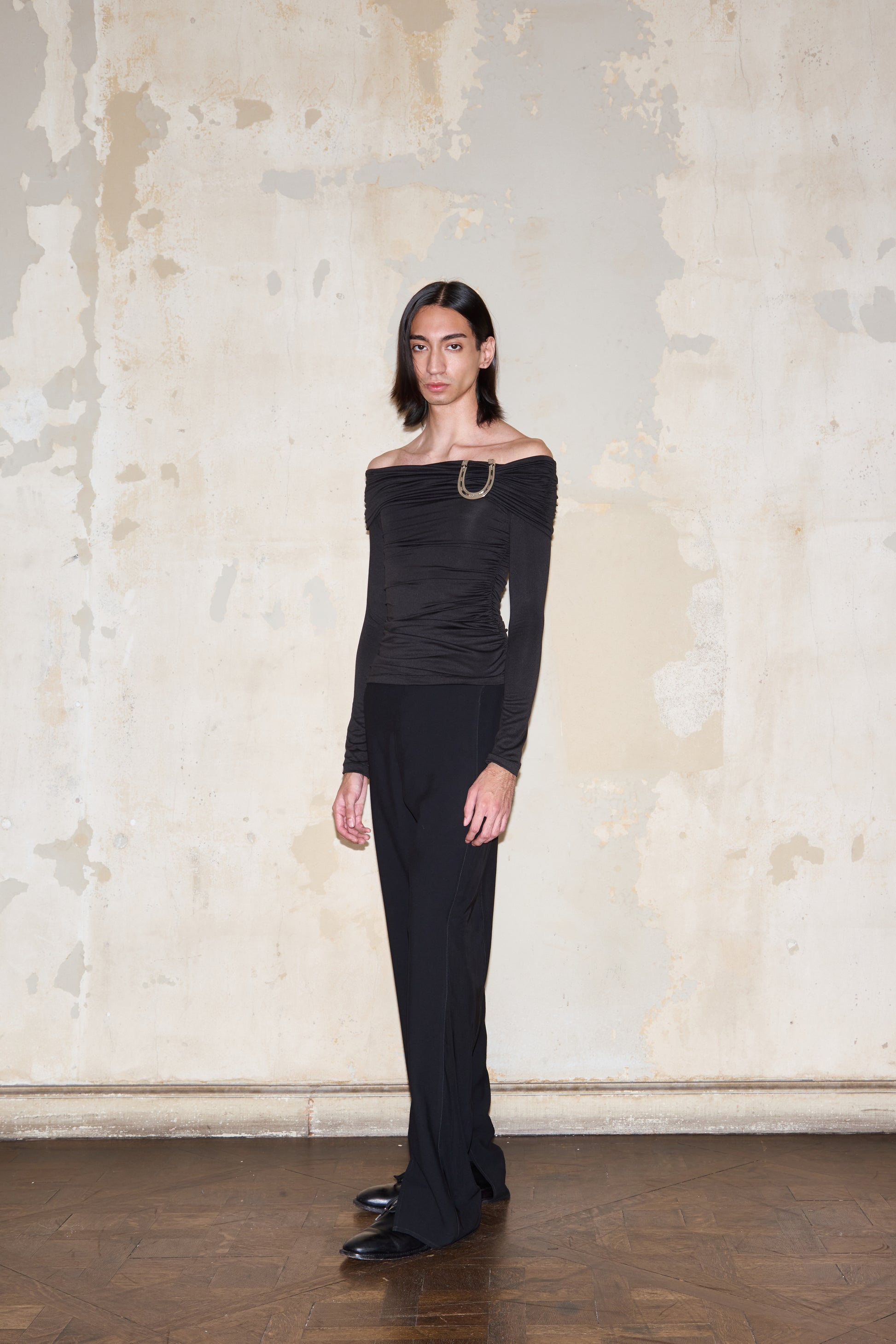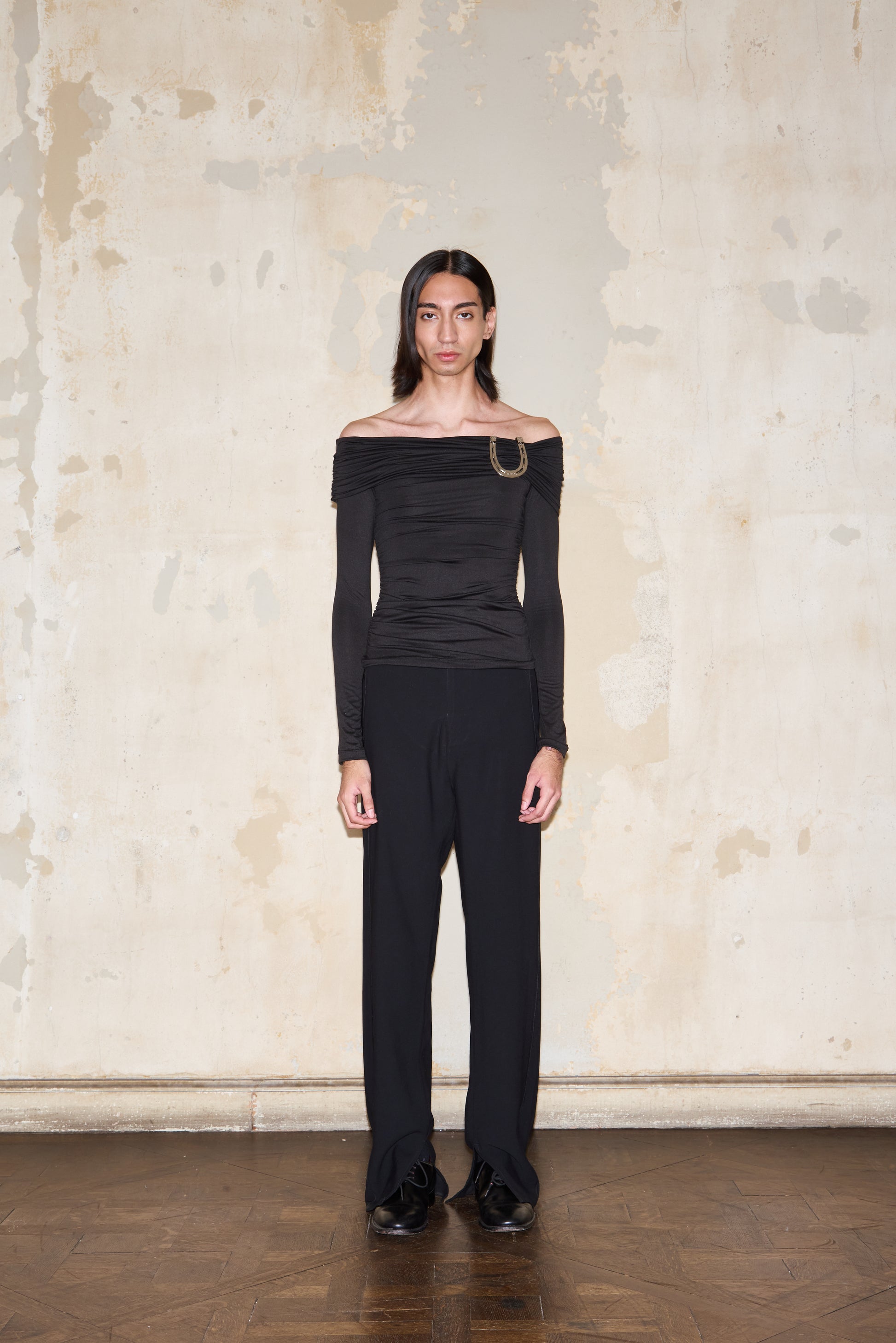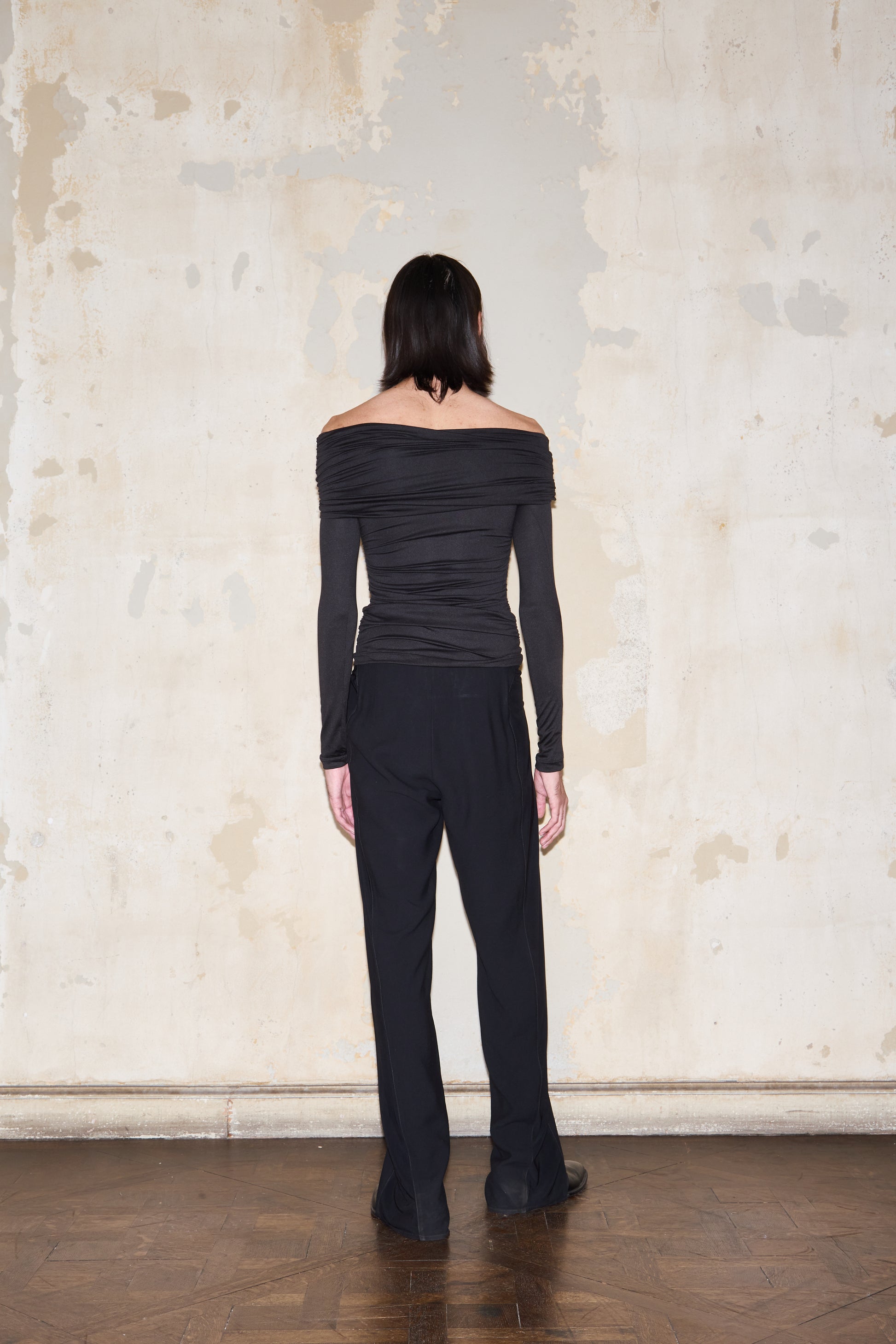 Sophisticated long-sleeve top featuring a boat neckline with distinctive ESQUINA horseshoe detail. Side draping creates elegant silhouette, while thumbhole sleeve openings add functional style. Crafted from sueded jersey fabric.