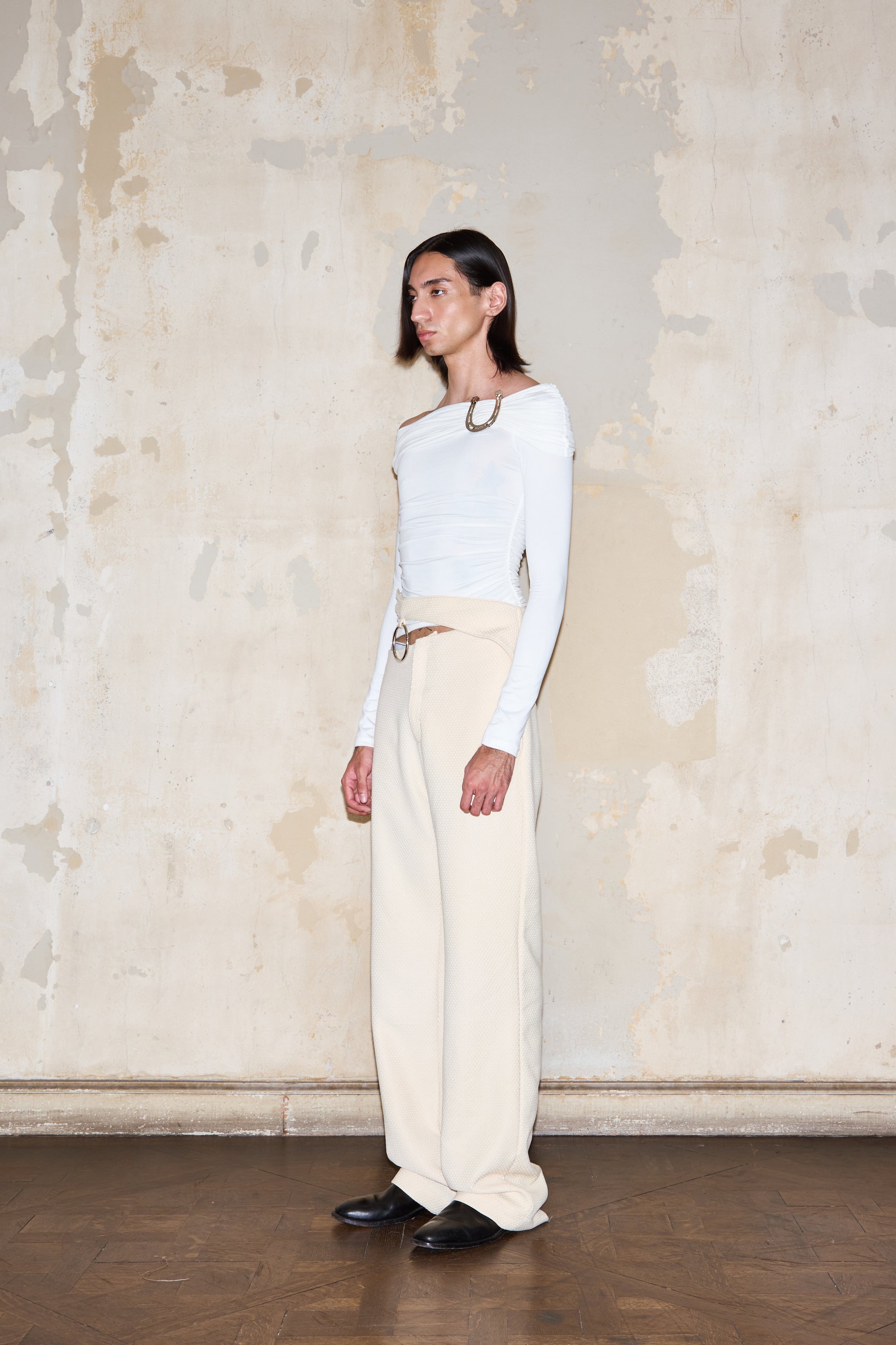 Sophisticated long-sleeve top featuring a boat neckline with distinctive ESQUINA horseshoe detail. Side draping creates elegant silhouette, while thumbhole sleeve openings add functional style. Crafted from sueded jersey fabric.