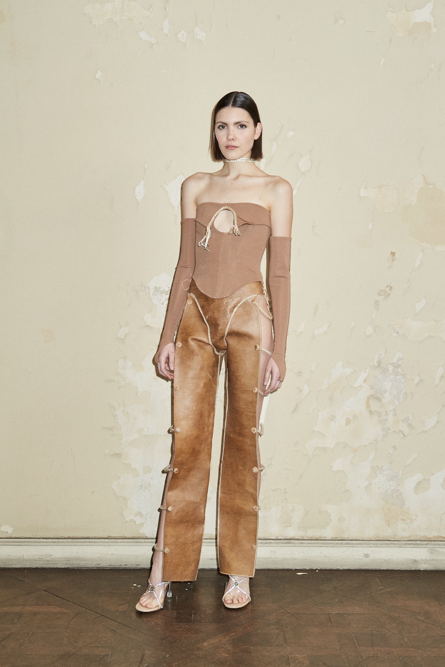 Straight leather pants with opening on the sides that close through strips of hand-braided rope. Made by the craftsman Jerónimo Coll with the classic argentinian. Sogueria Criolla technique