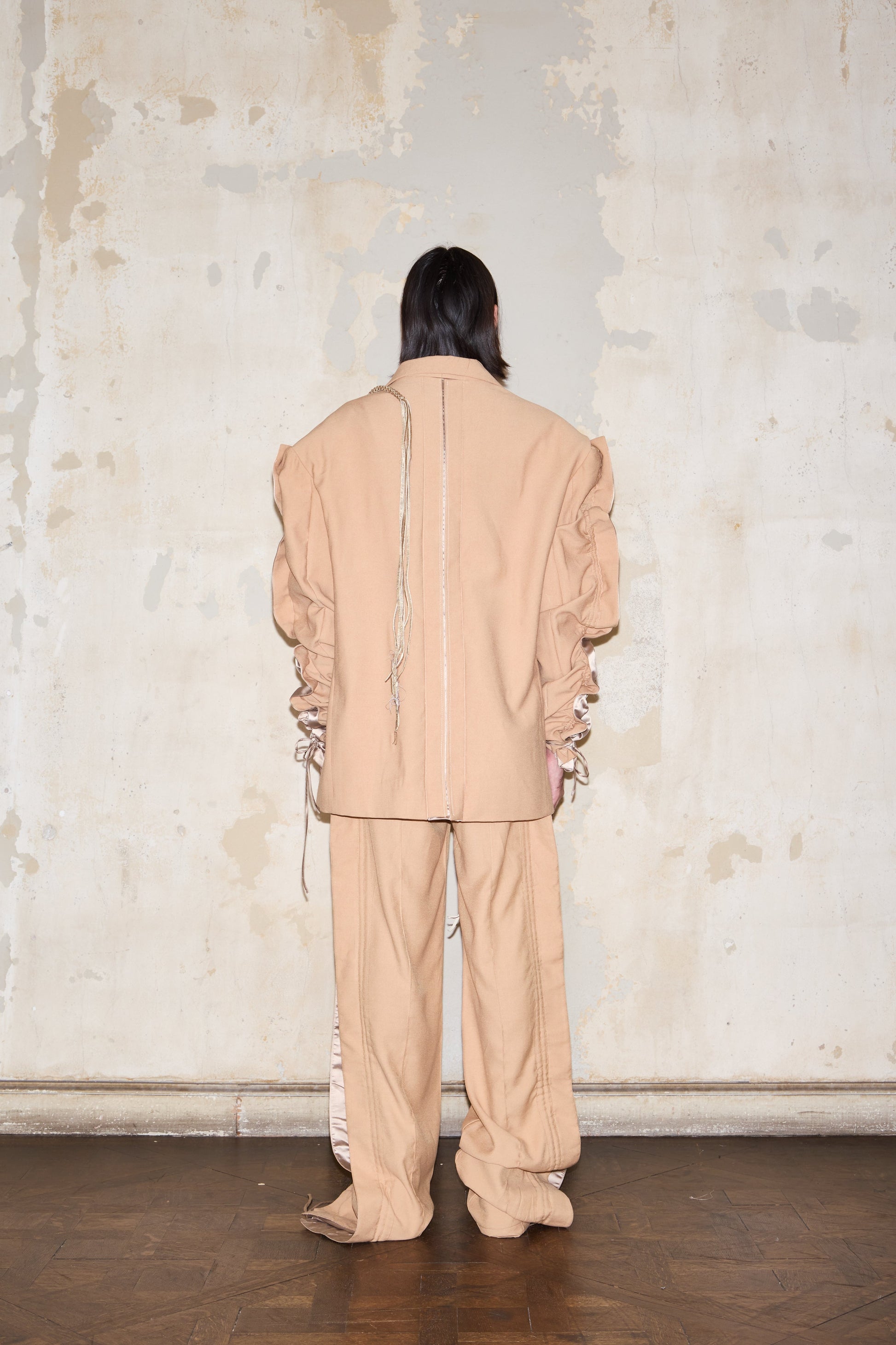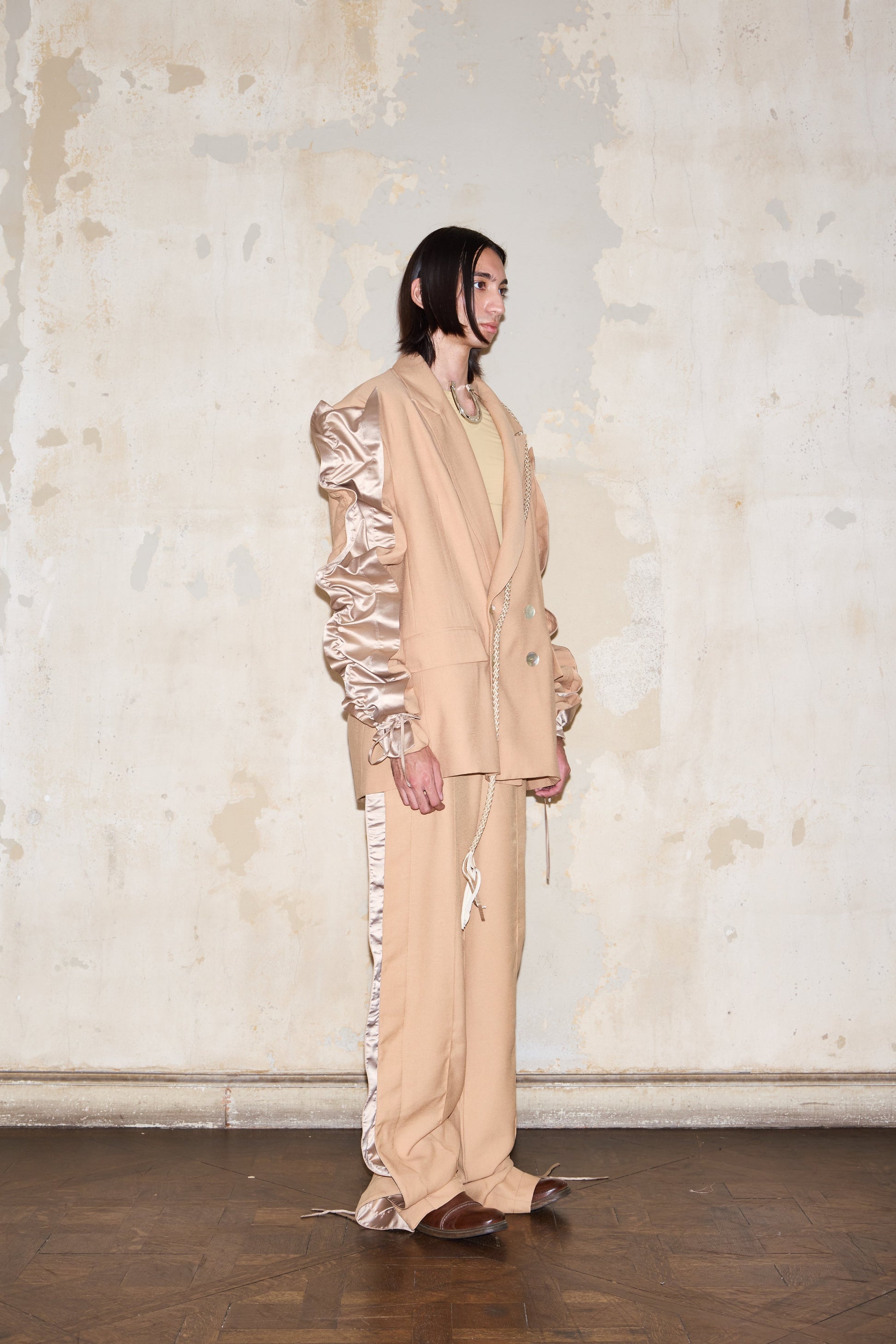 Tailored straight-leg trousers featuring an innovative overskirt reminiscent of a saddle, elegantly trimmed with artisanal flat raw leather braid. Extended satin side panels incorporate internal drawstrings for adjustable length customization. Crafted from premium suiting fabric and satin.