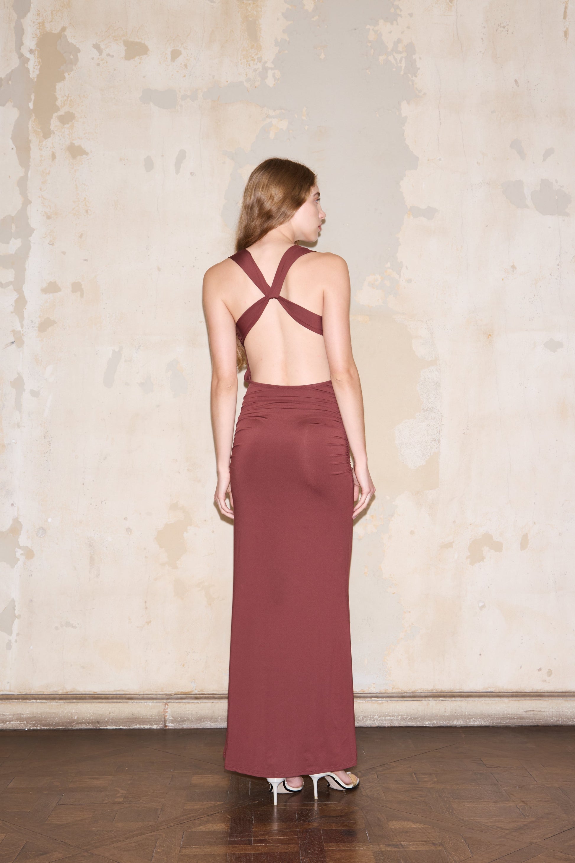 Crafted from luxurious Italian silk jersey, this elongated silhouette features distinctive horseshoe-shaped corner straps that anchor at the front neckline, creating a refined architectural detail.