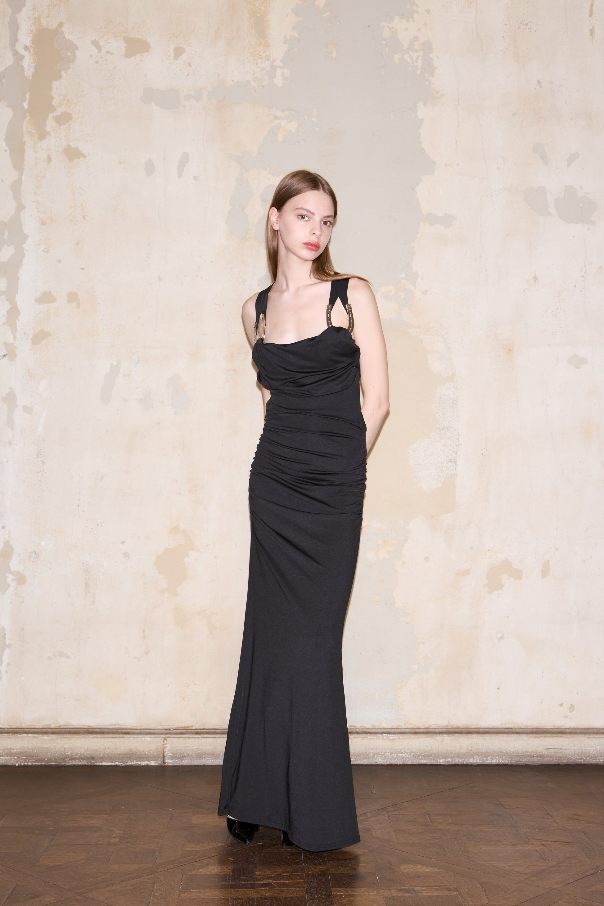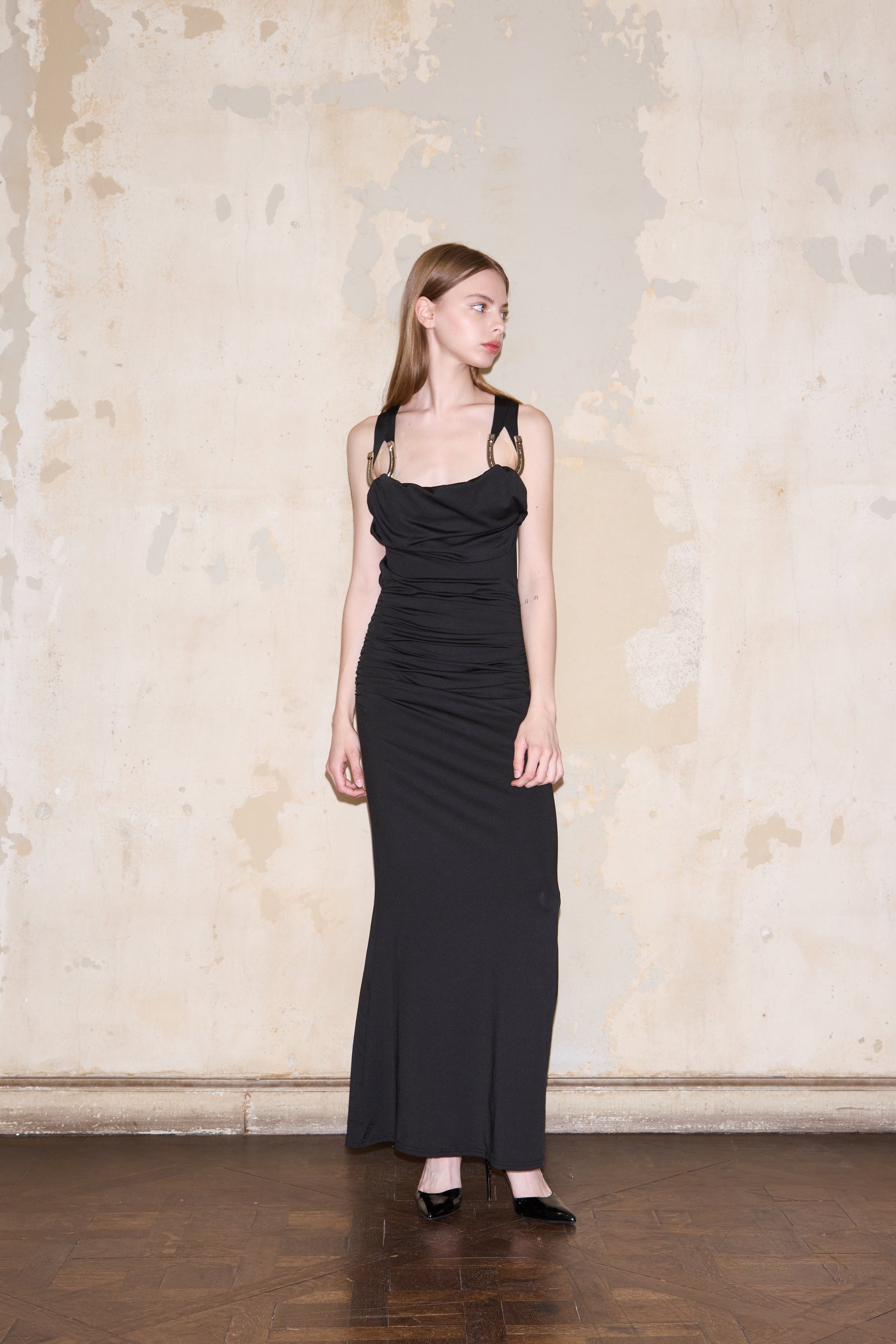 Crafted from luxurious Italian silk jersey, this elongated silhouette features distinctive horseshoe-shaped corner straps that anchor at the front neckline, creating a refined architectural detail.