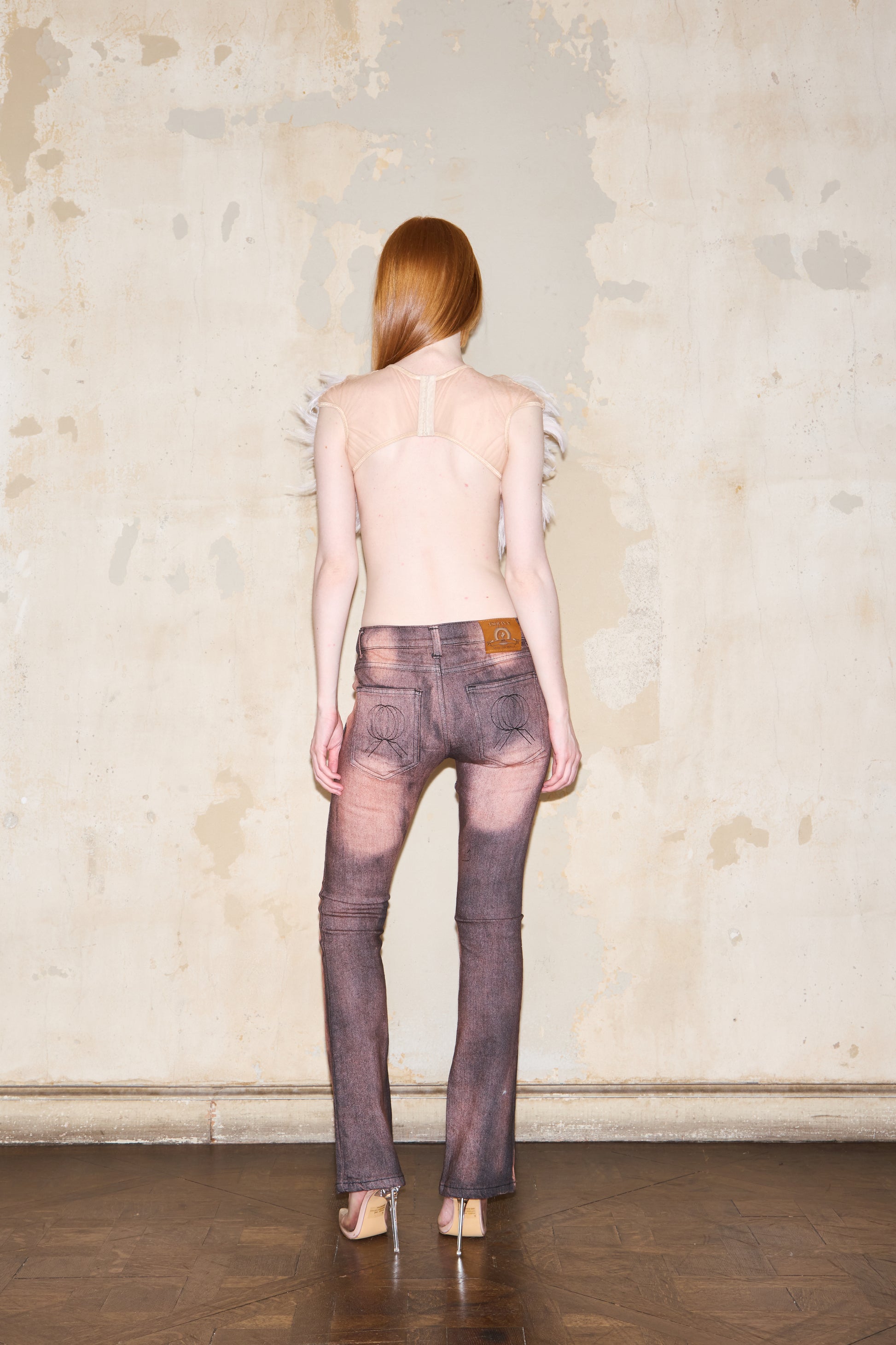 Precision-tailored low rise dark blue denim oxford with sophisticated detailing. Features exclusive laser-engraved ESQUINA print and premium hot-fused logo embellished with rhinestones. Engineered for optimal fit and contemporary style, this versatile piece combines technical craftsmanship with refined aesthetics.