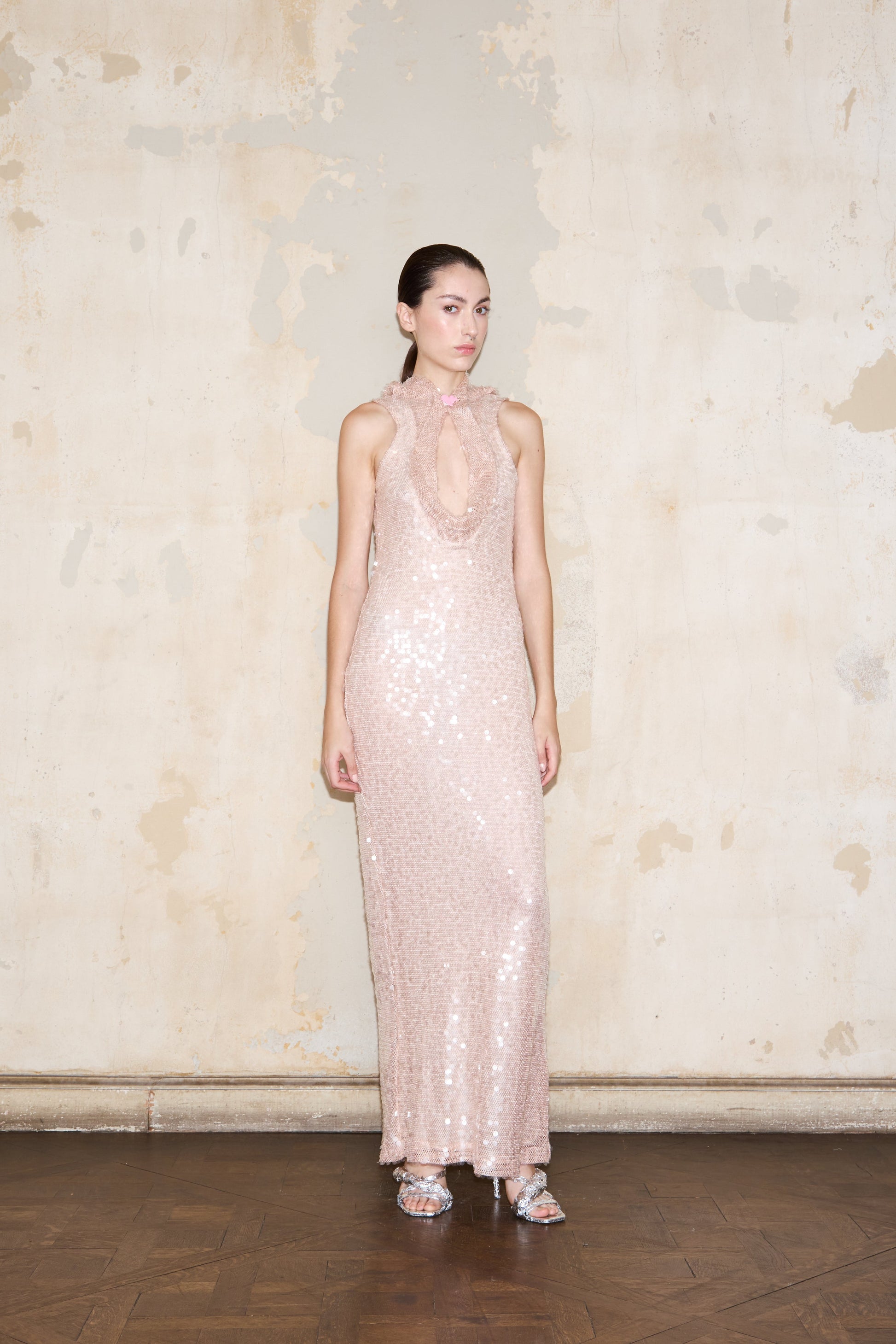 Made from a sequin-adorned mesh, this piece requires hand washing in cold water to maintain its quality.