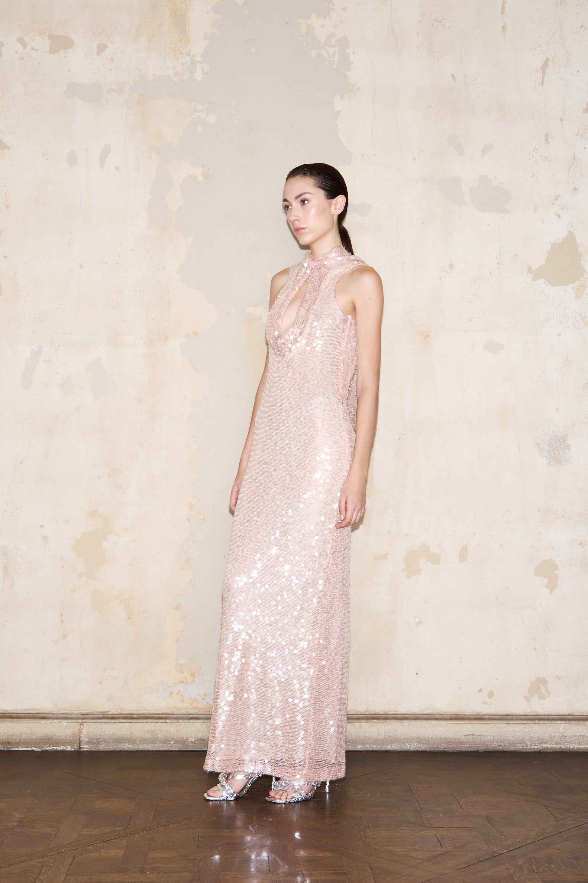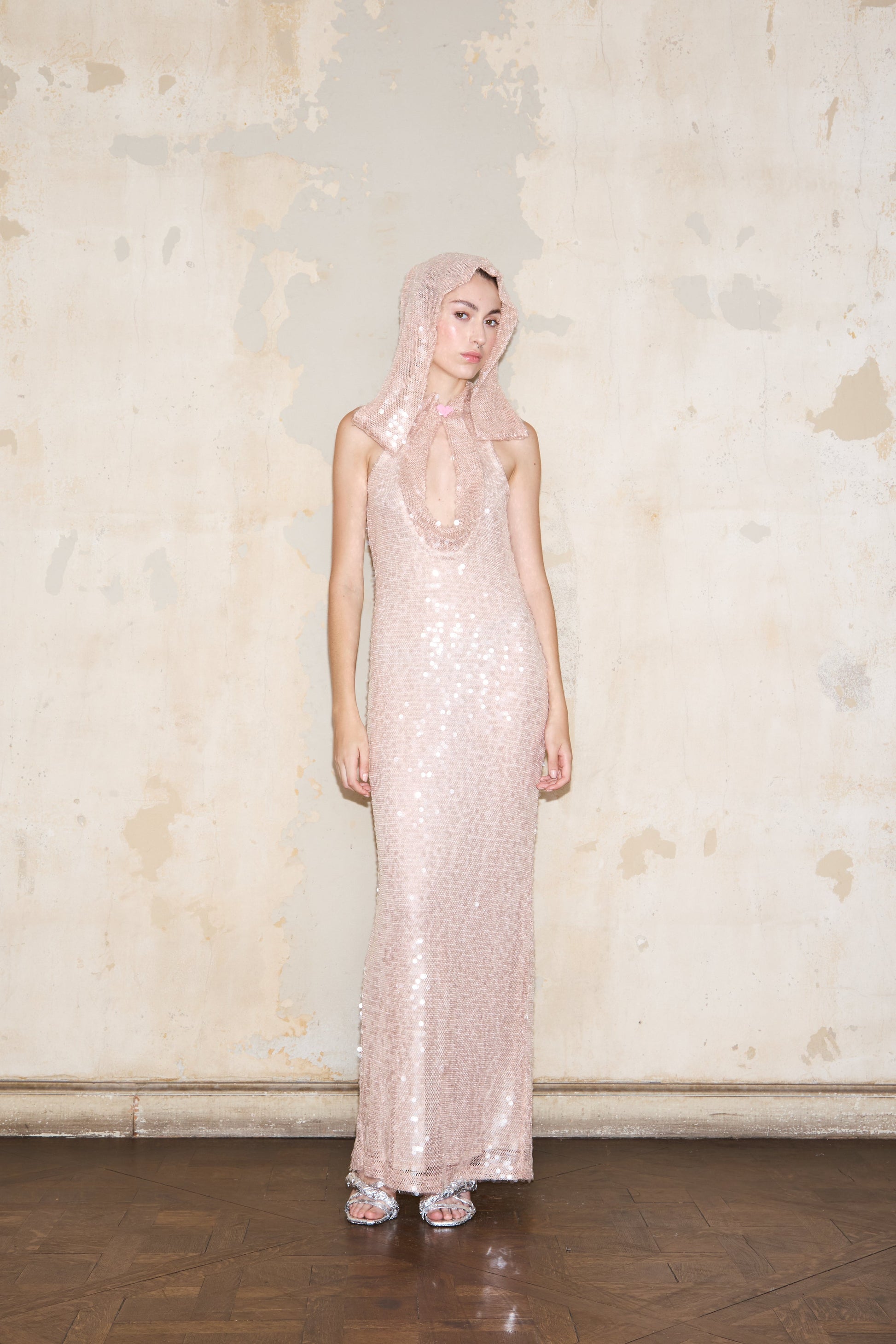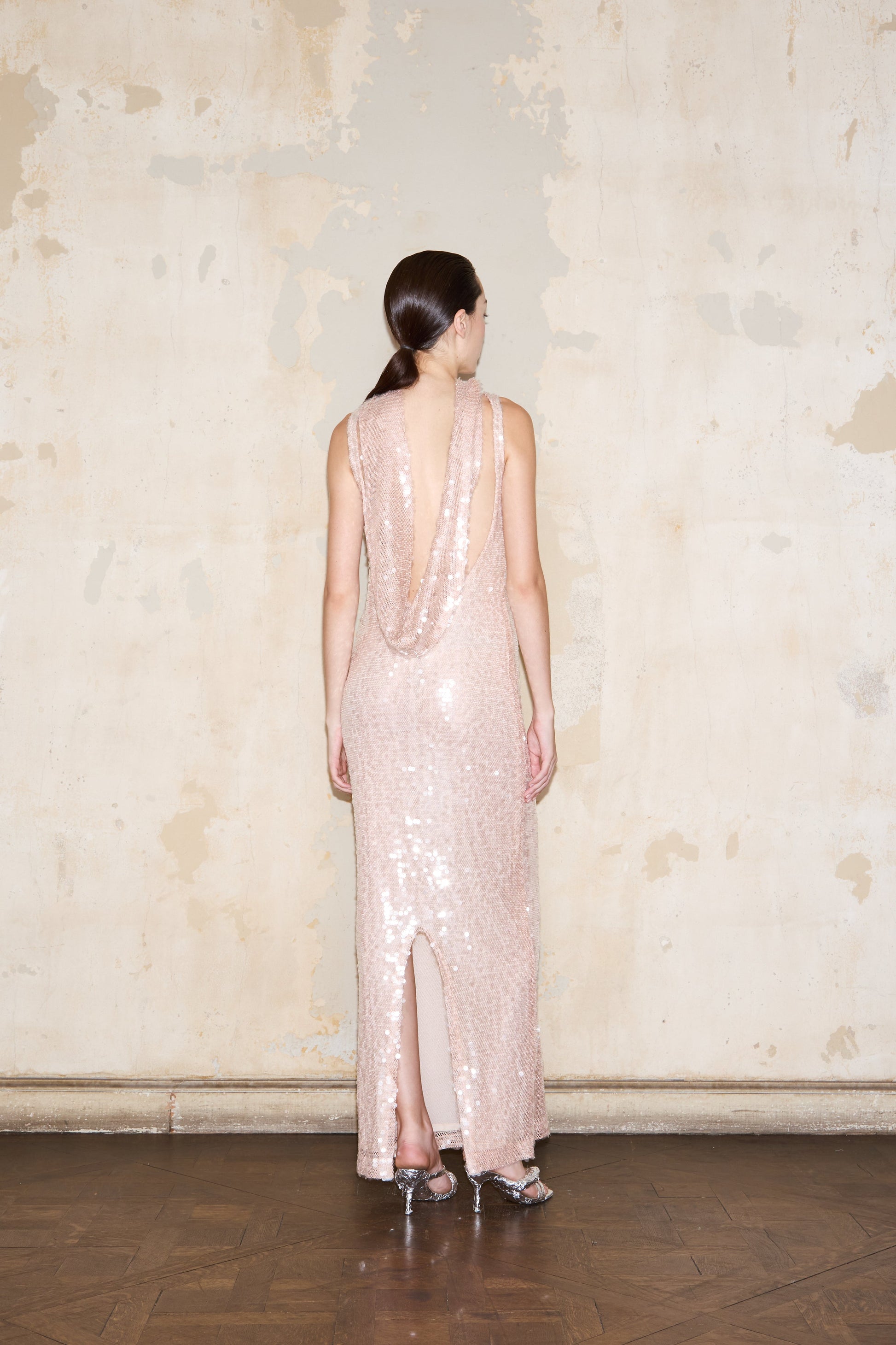 This long sequin dress features a straight, sleeveless design with a plunging neckline and a draped back detail that can also be styled as a hood. It has a back slit for added elegance.