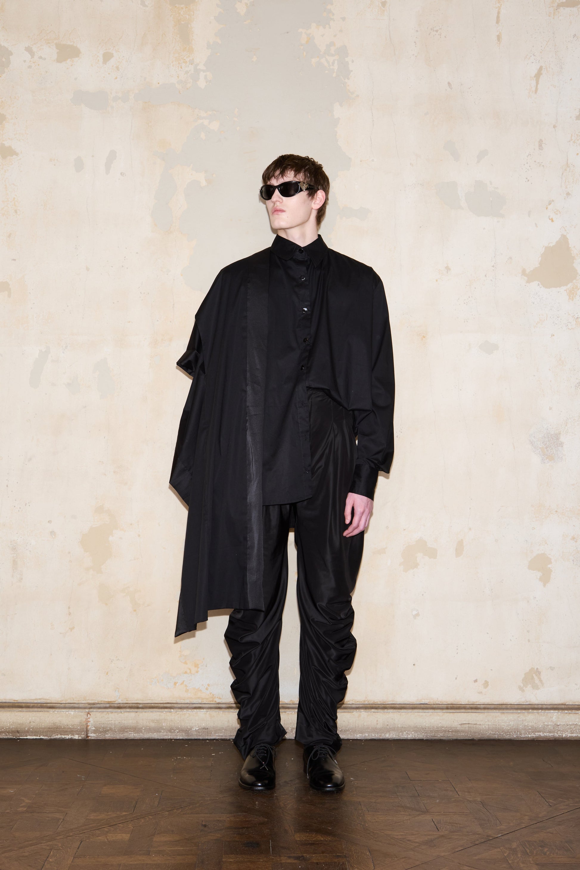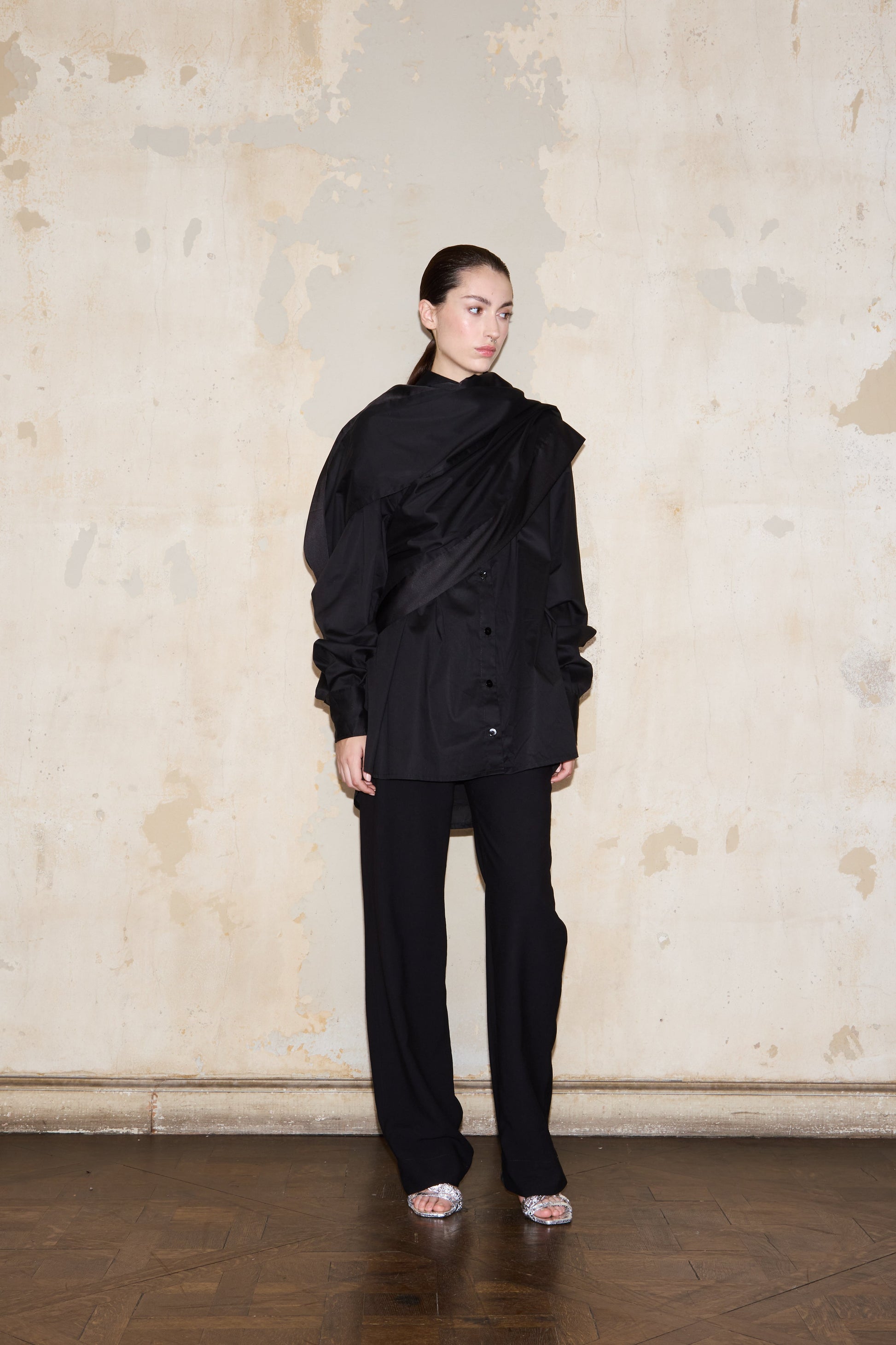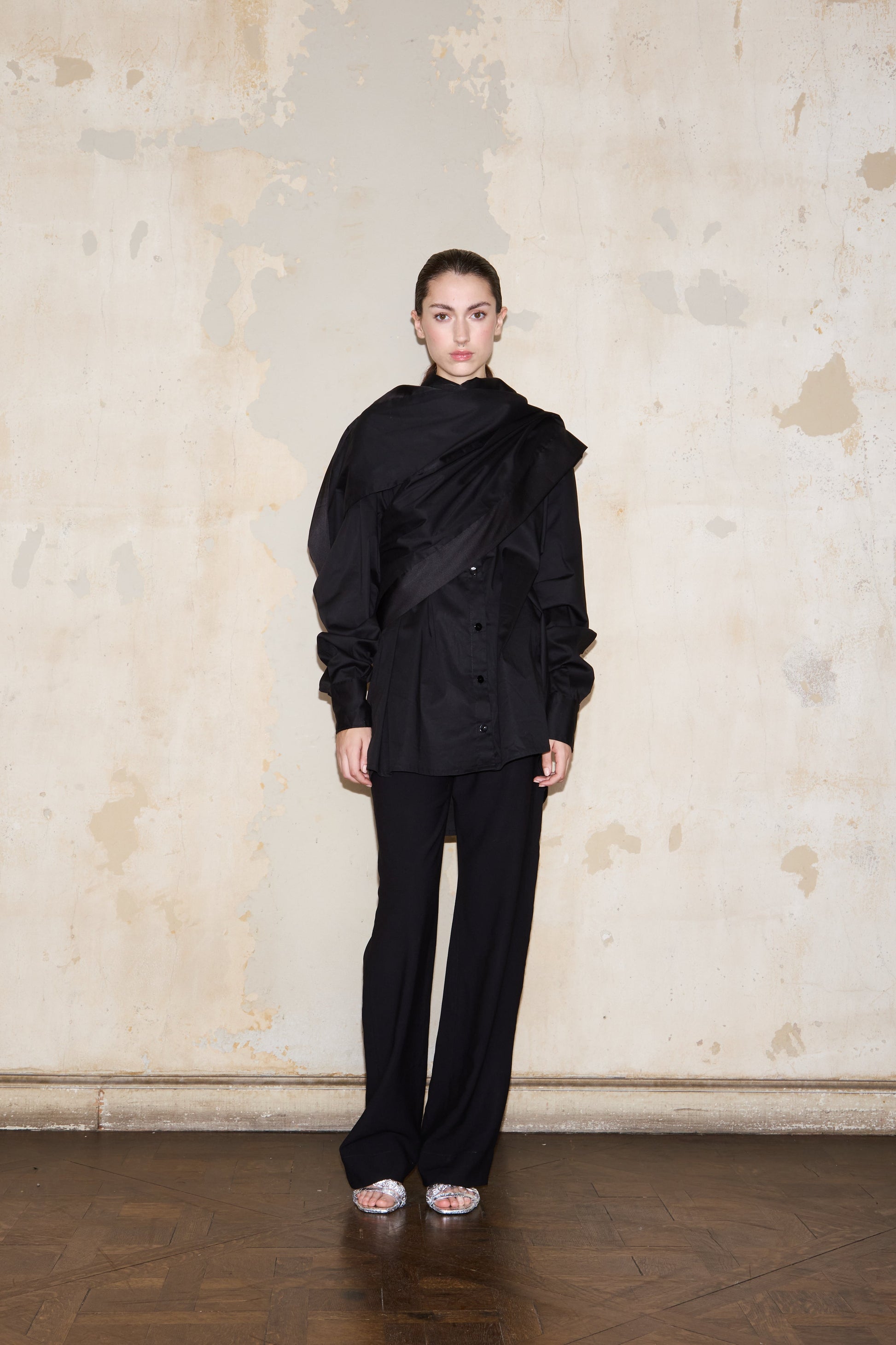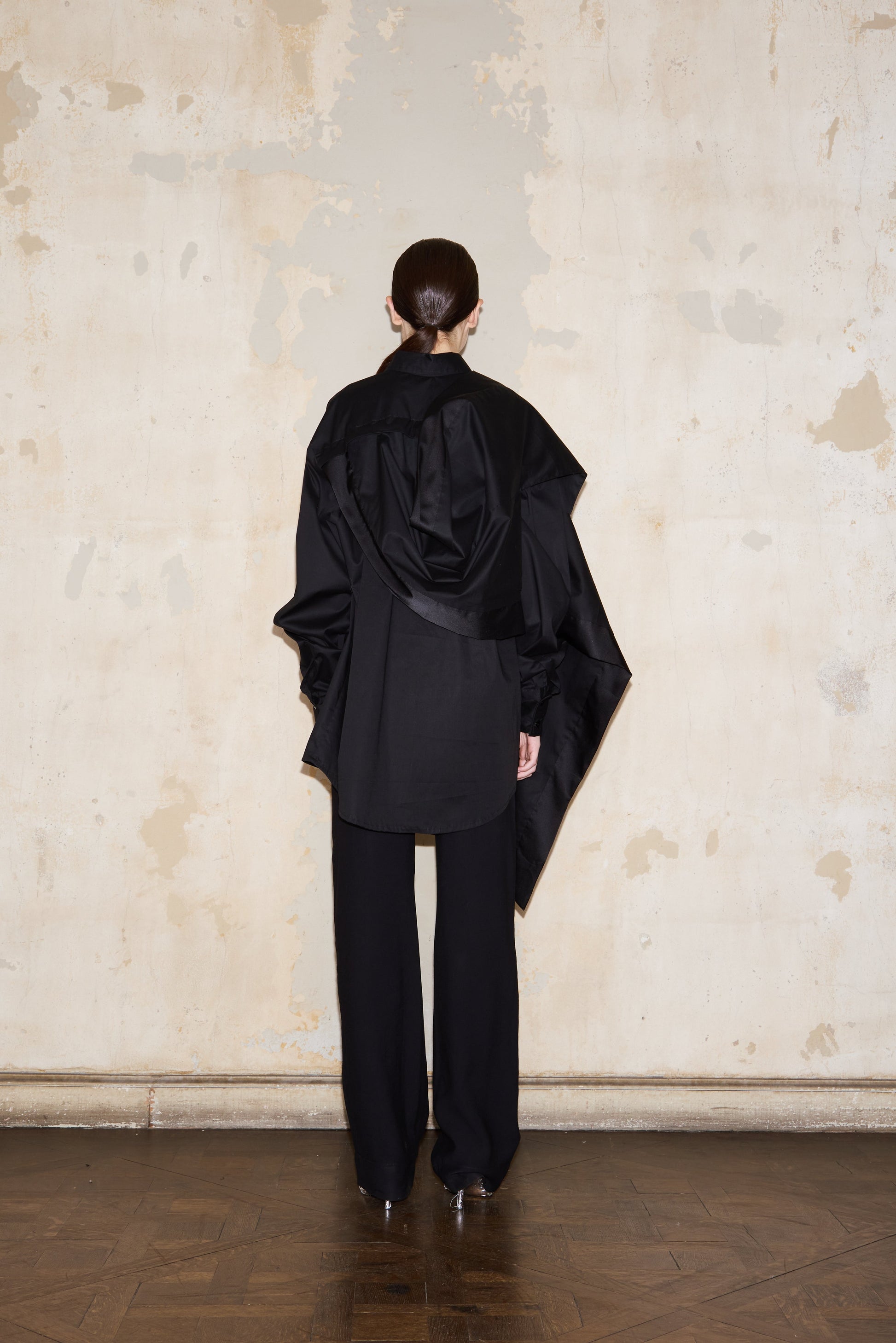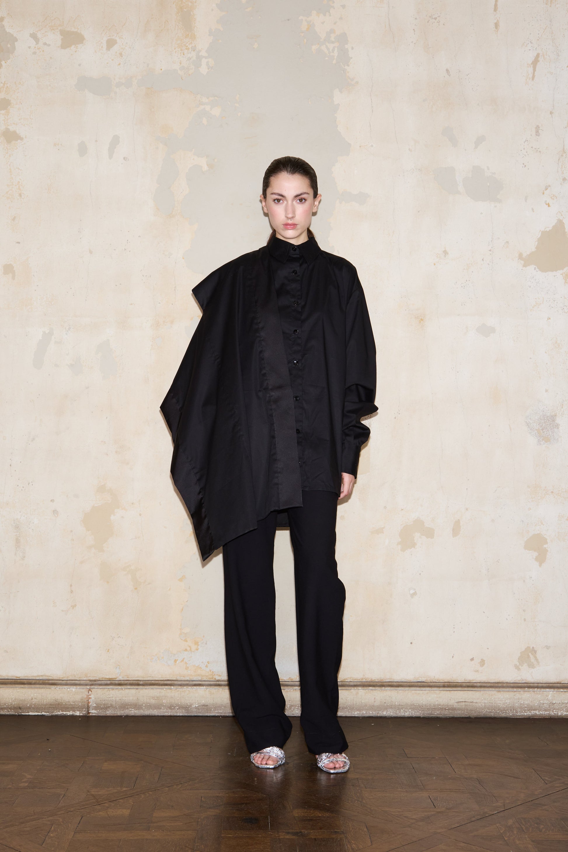 This classic oversized shirt features a unique detail on the back: a placket with eyelets designed to attach a matching poncho. The poncho, made from the same fabric with silk-trimmed edges and a Pampa-inspired print, can be styled in various ways.