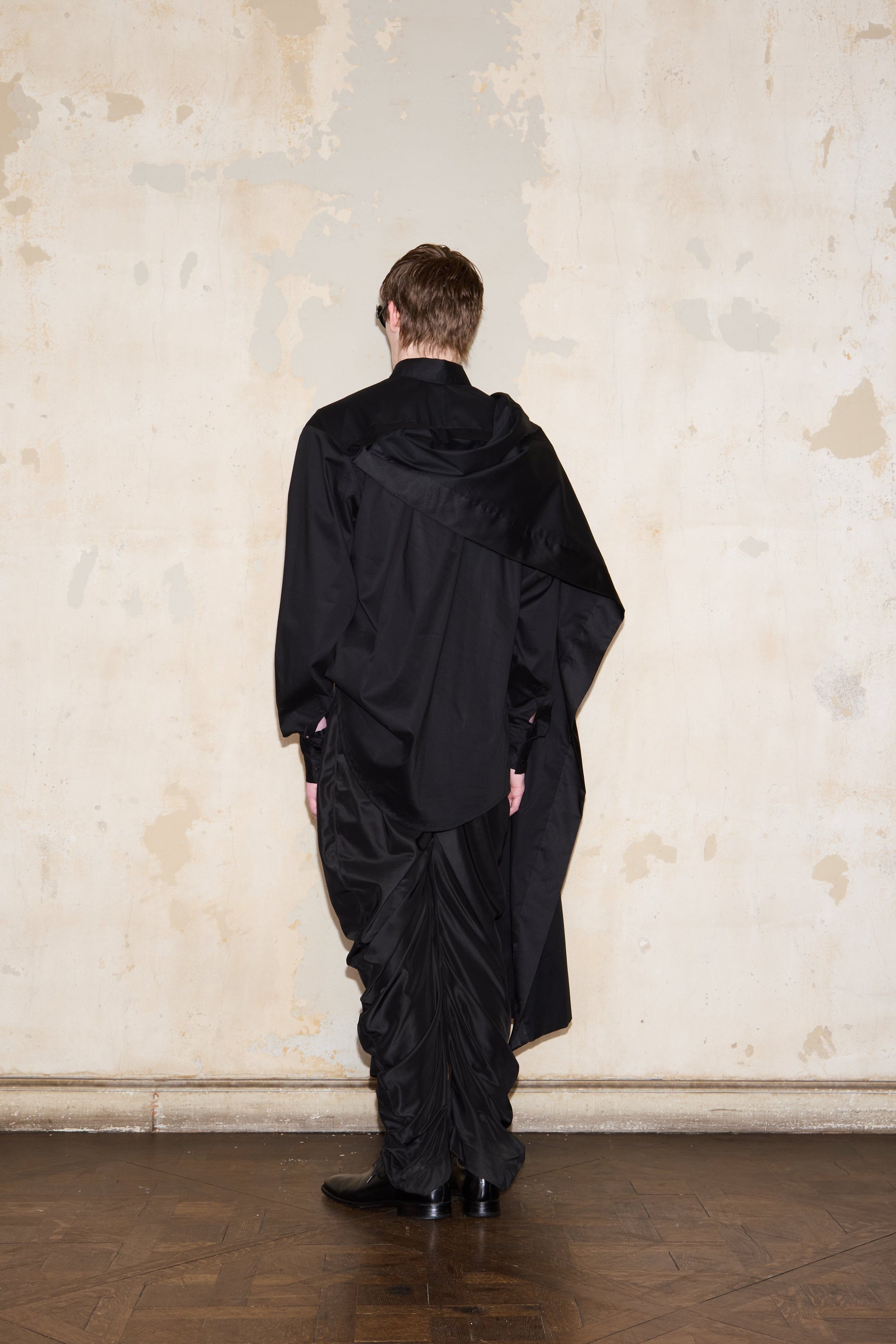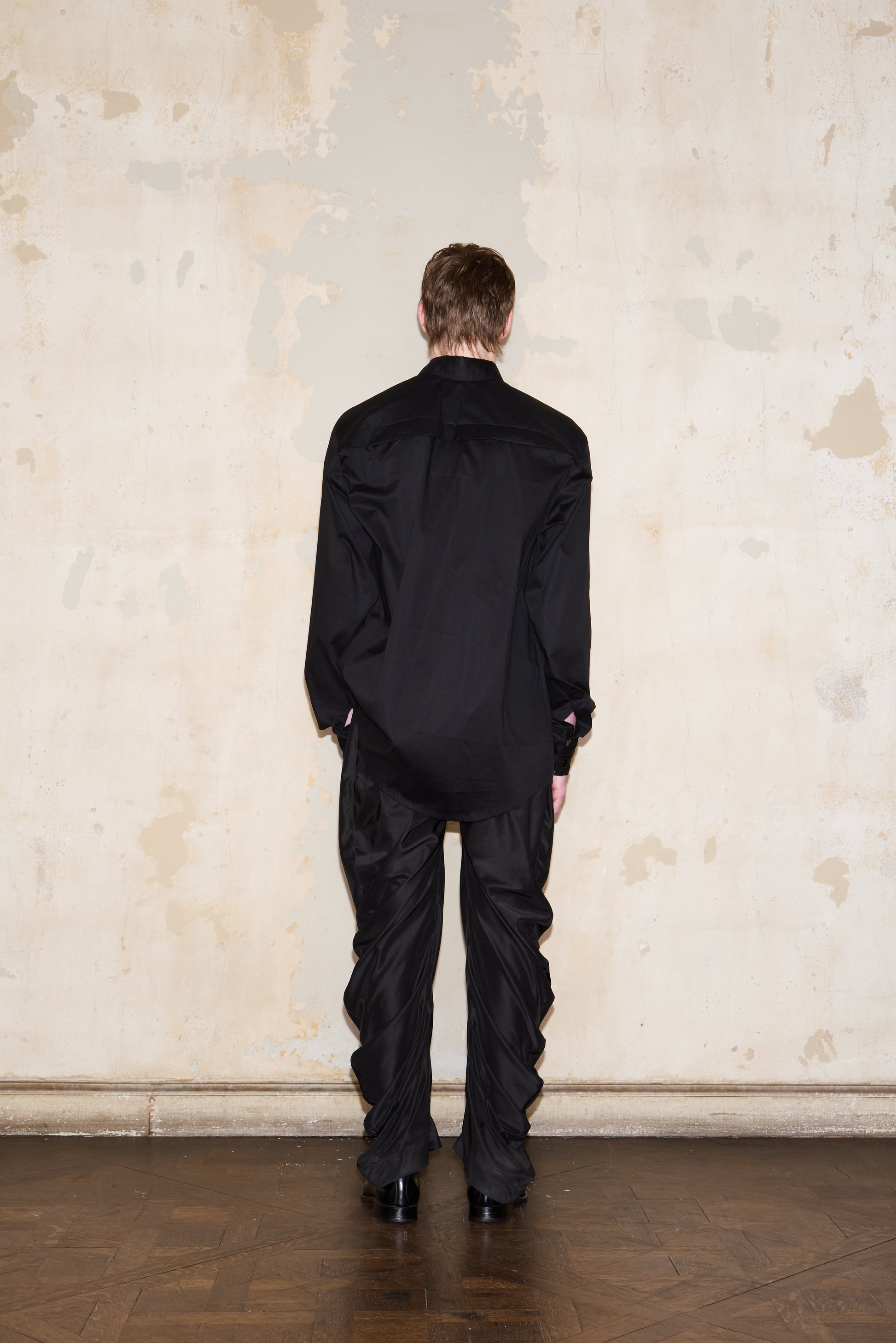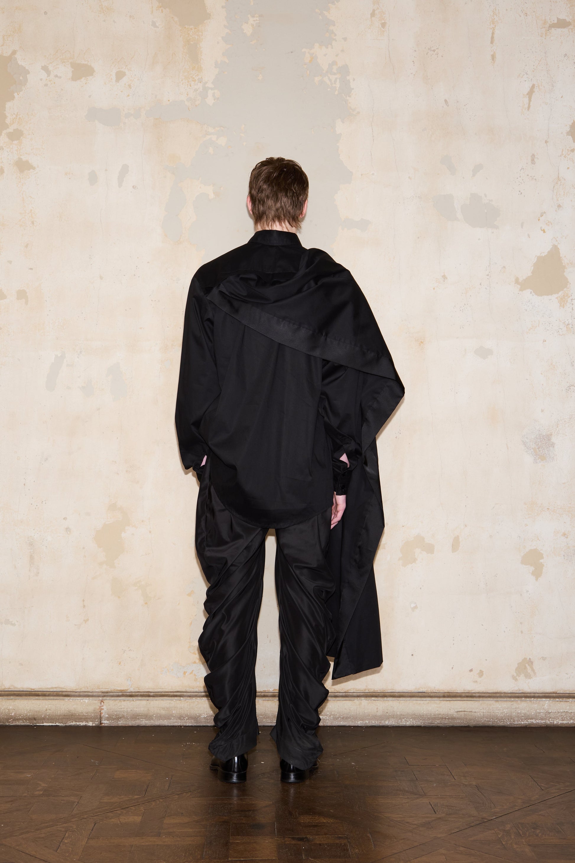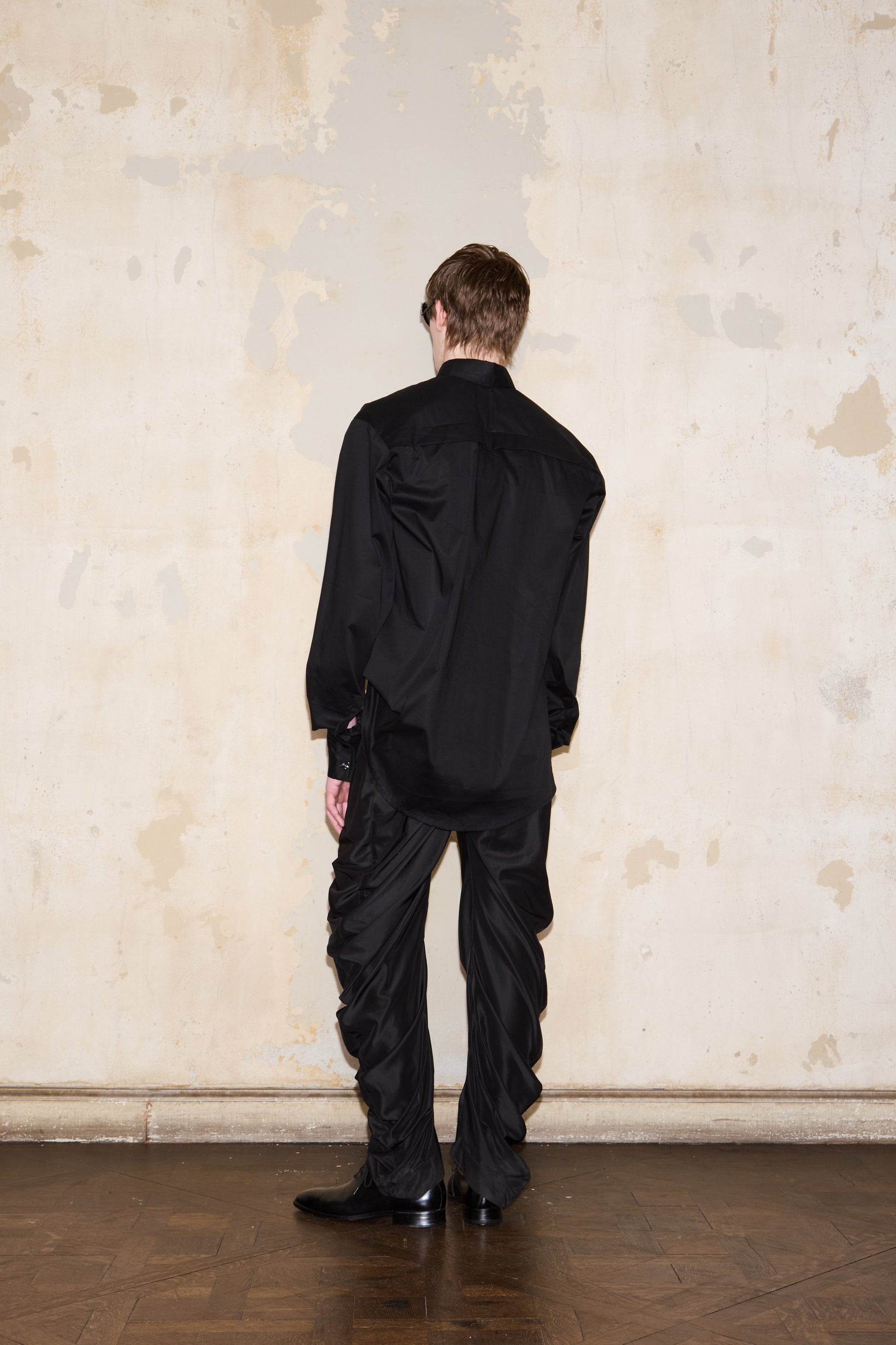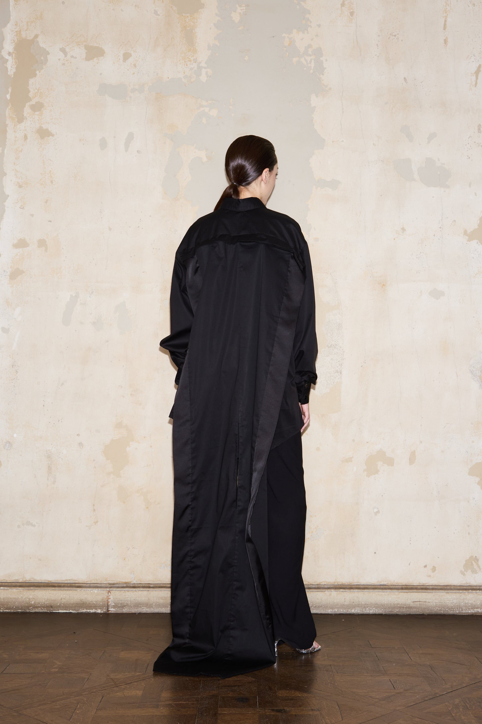This classic oversized shirt features a unique detail on the back: a placket with eyelets designed to attach a matching poncho. The poncho, made from the same fabric with silk-trimmed edges and a Pampa-inspired print, can be styled in various ways.