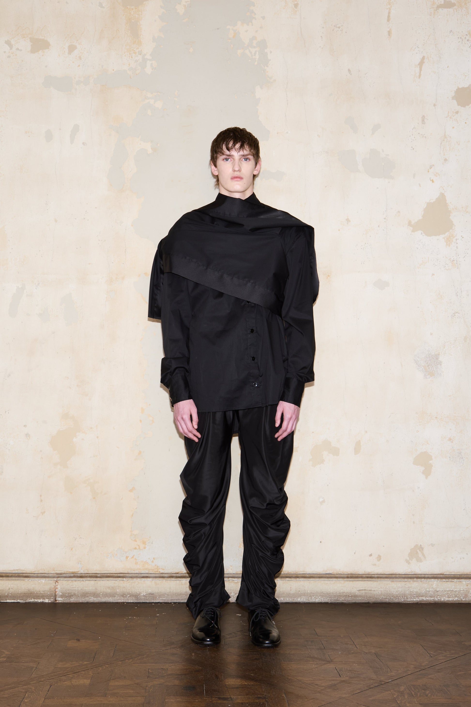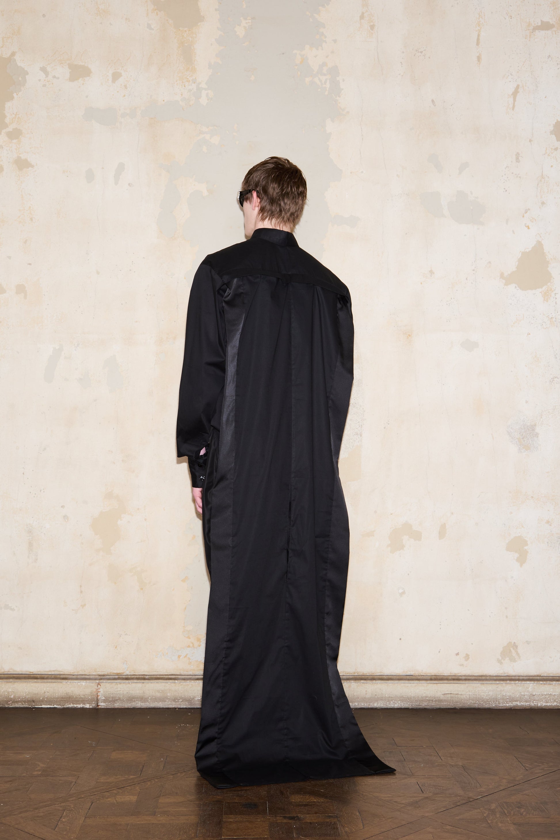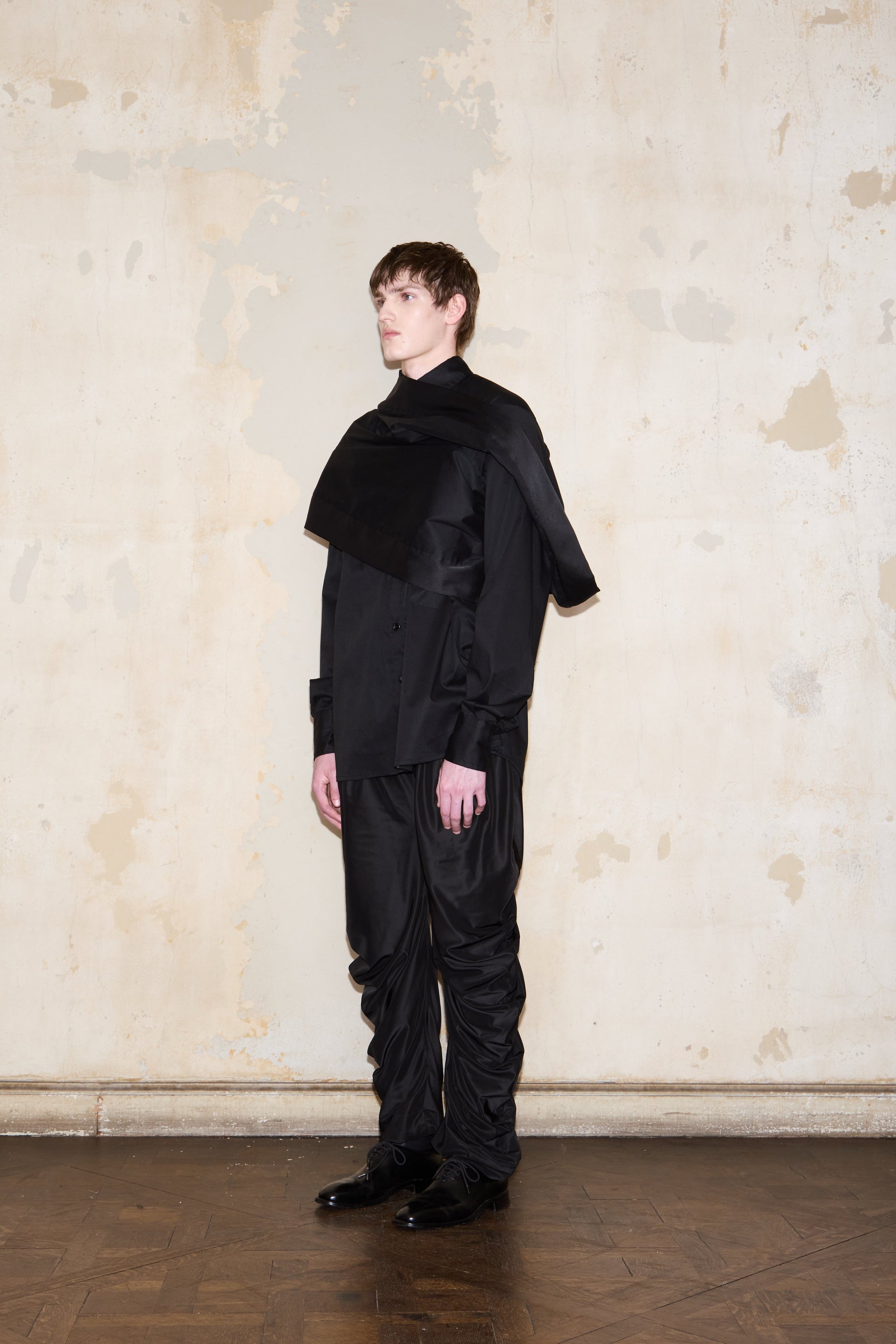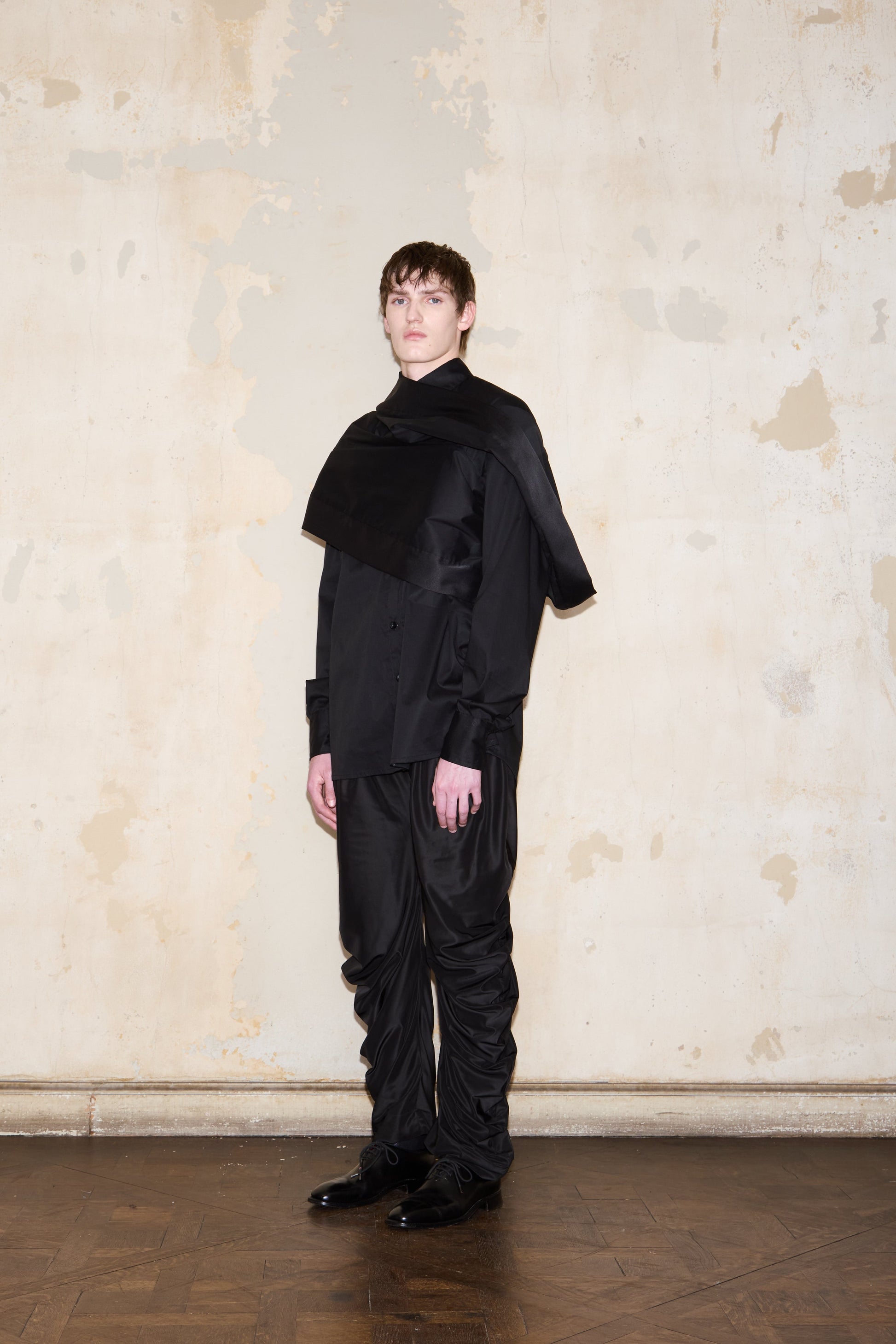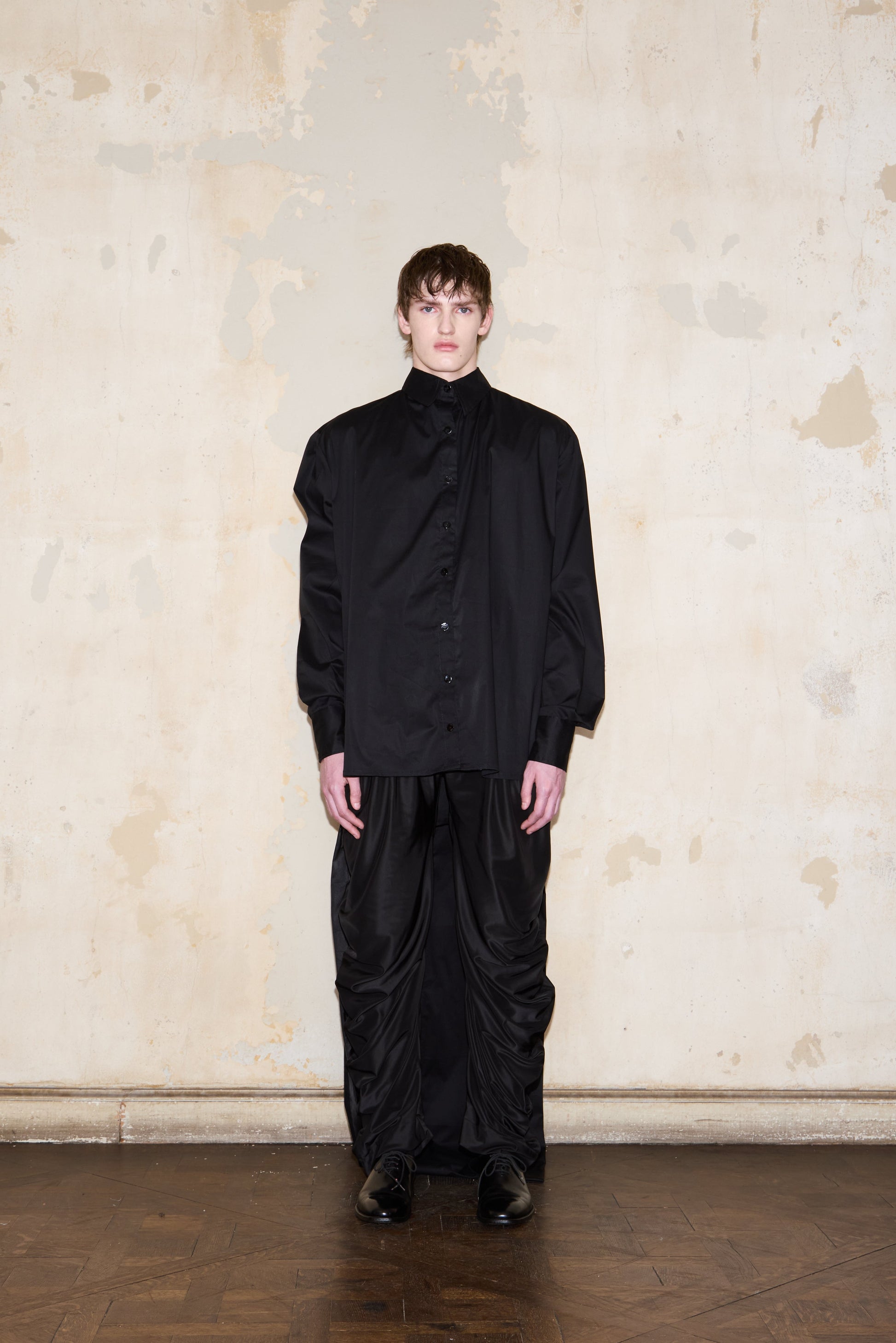 This classic oversized shirt features a unique detail on the back: a placket with eyelets designed to attach a matching poncho. The poncho, made from the same fabric with silk-trimmed edges and a Pampa-inspired print, can be styled in various ways.