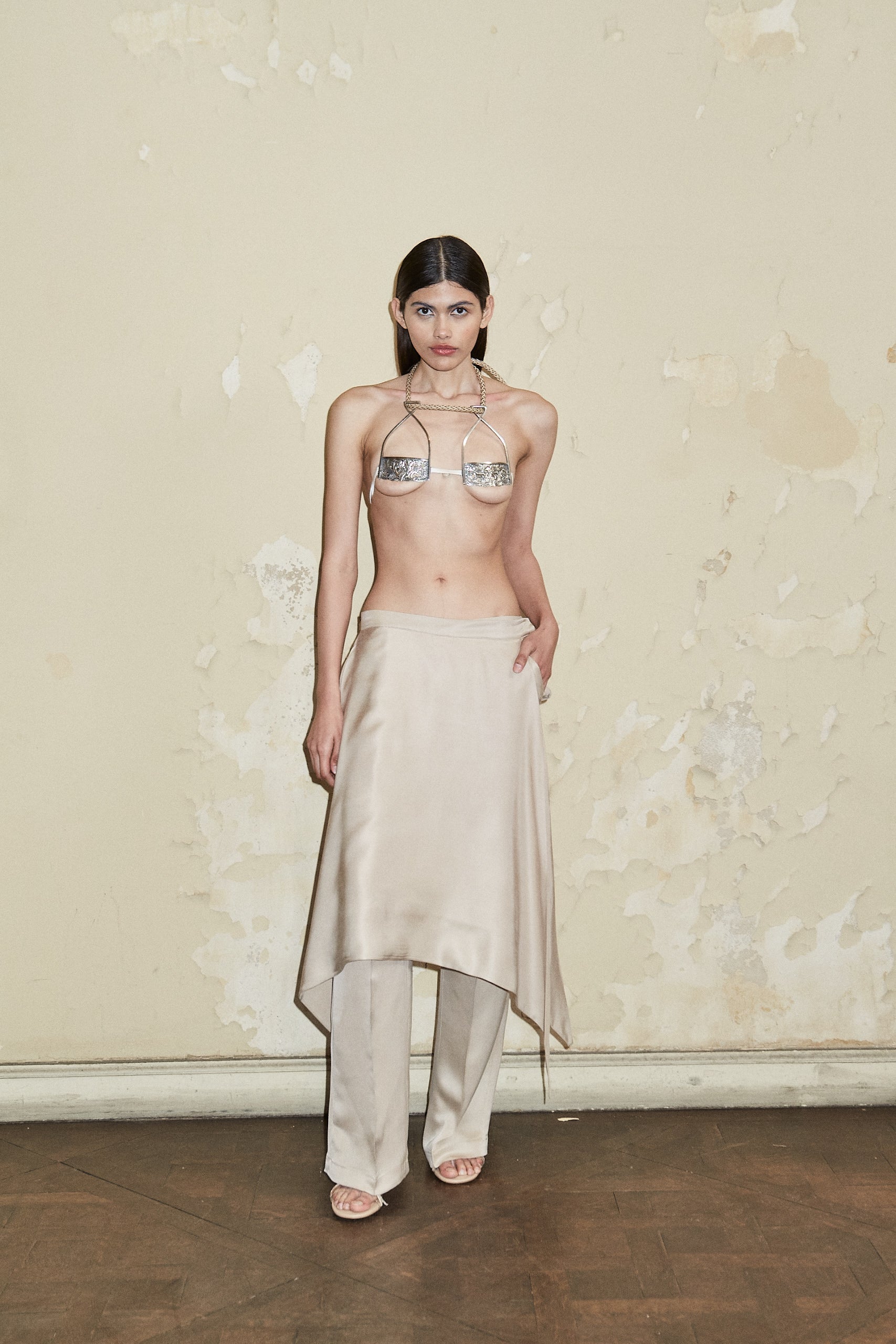 Tailored jumpsuit in Italian silk with 2 variants of use: straight pants with pockets and top tied at the shoulders or top left loose so that the bottom looks like a skirt.