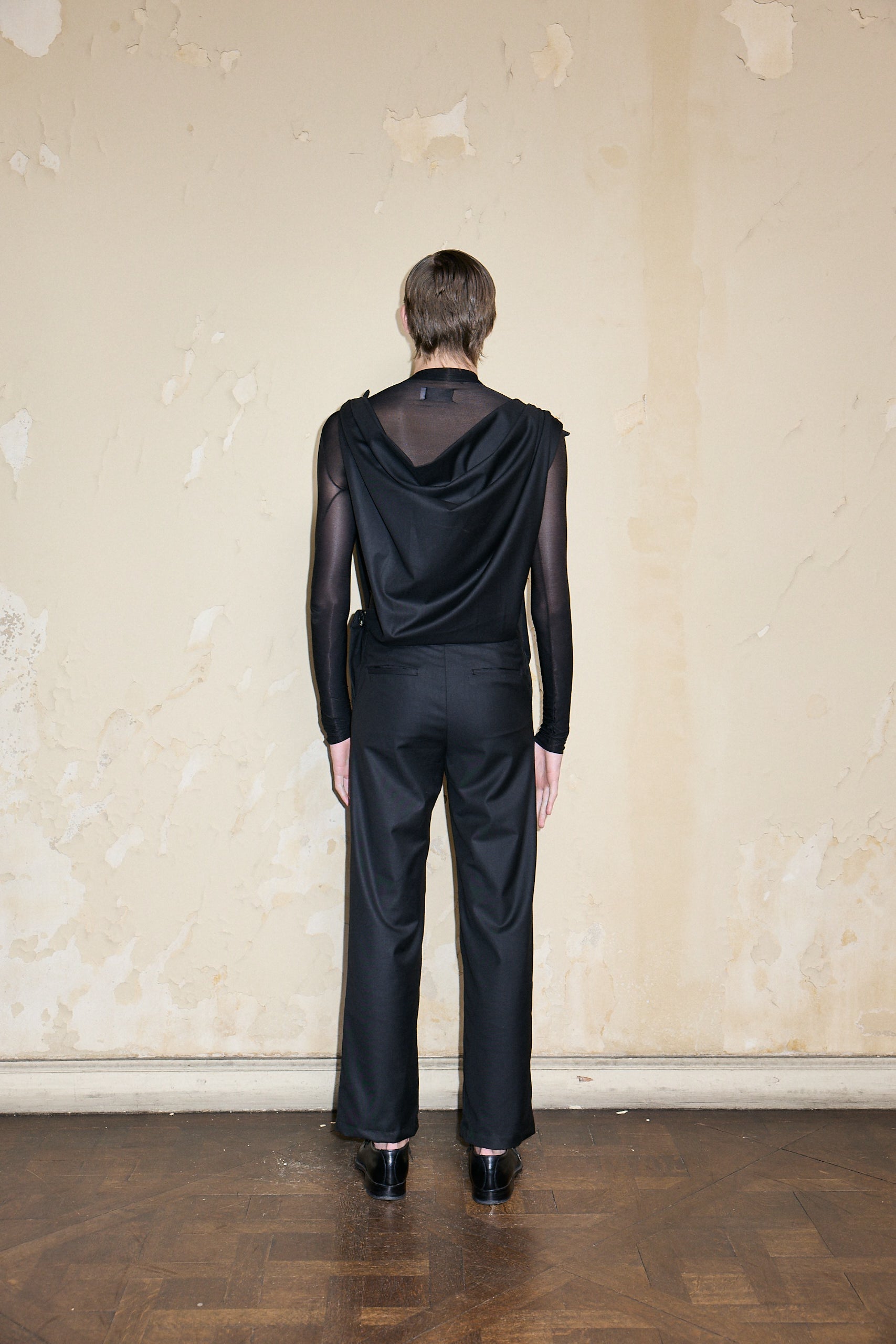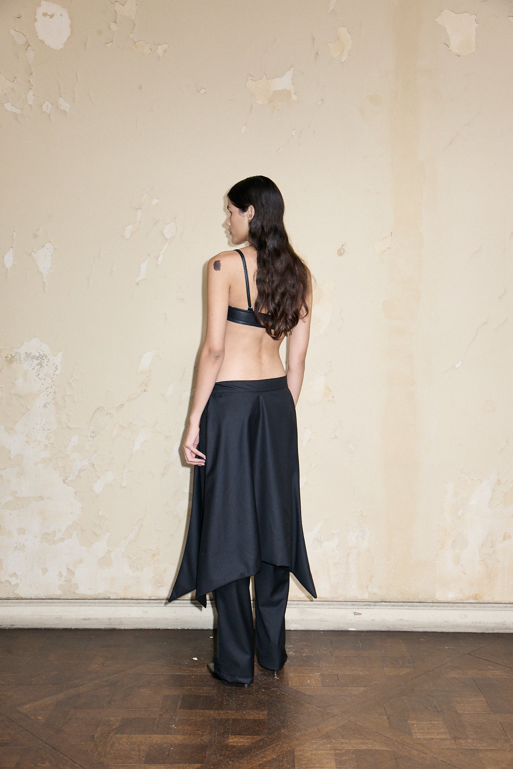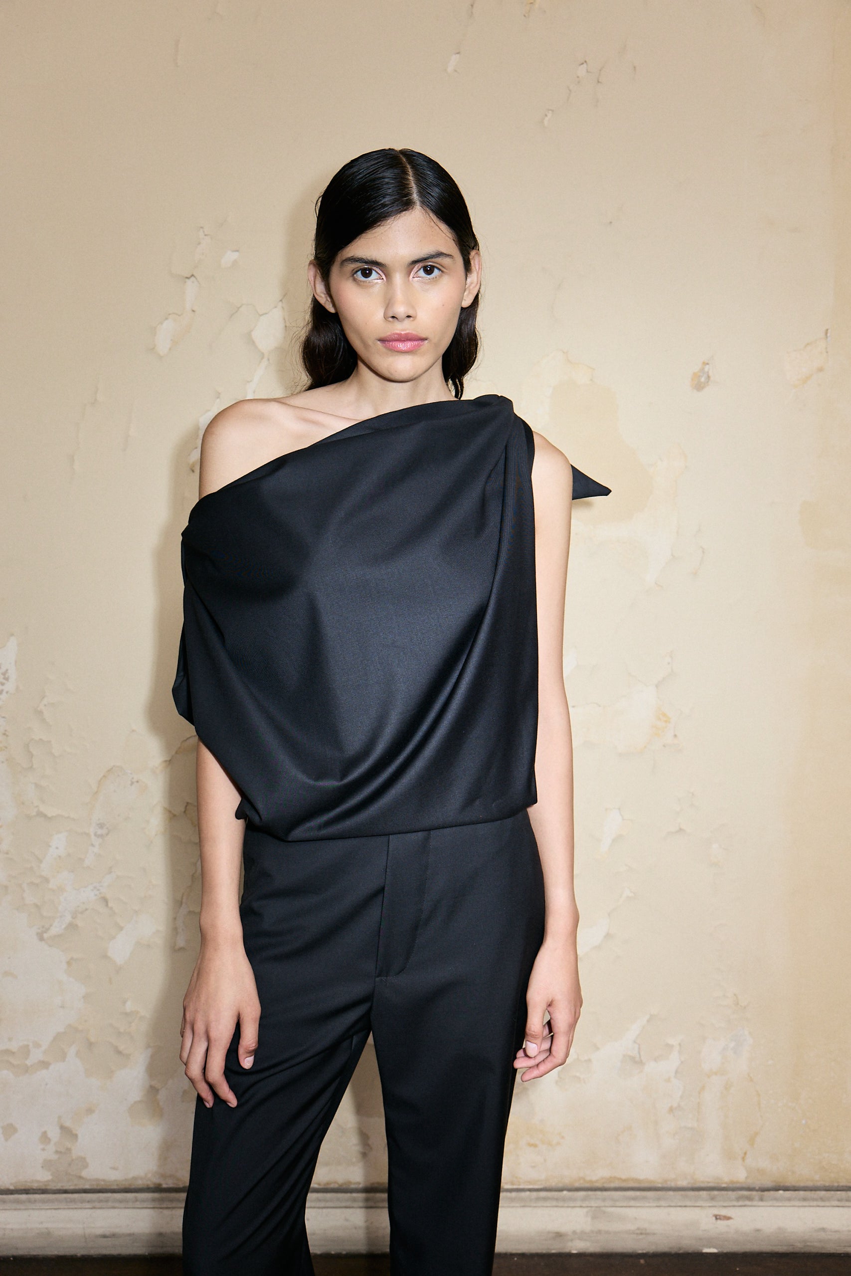 This versatile jumpsuit comes in two different variations. It features a straight-legged pant with convenient pockets, and the top can be tied at the shoulders or left loose for a stylish over-skirt look. Made with high-quality suiting fabric, dry cleaning is recommended for care.