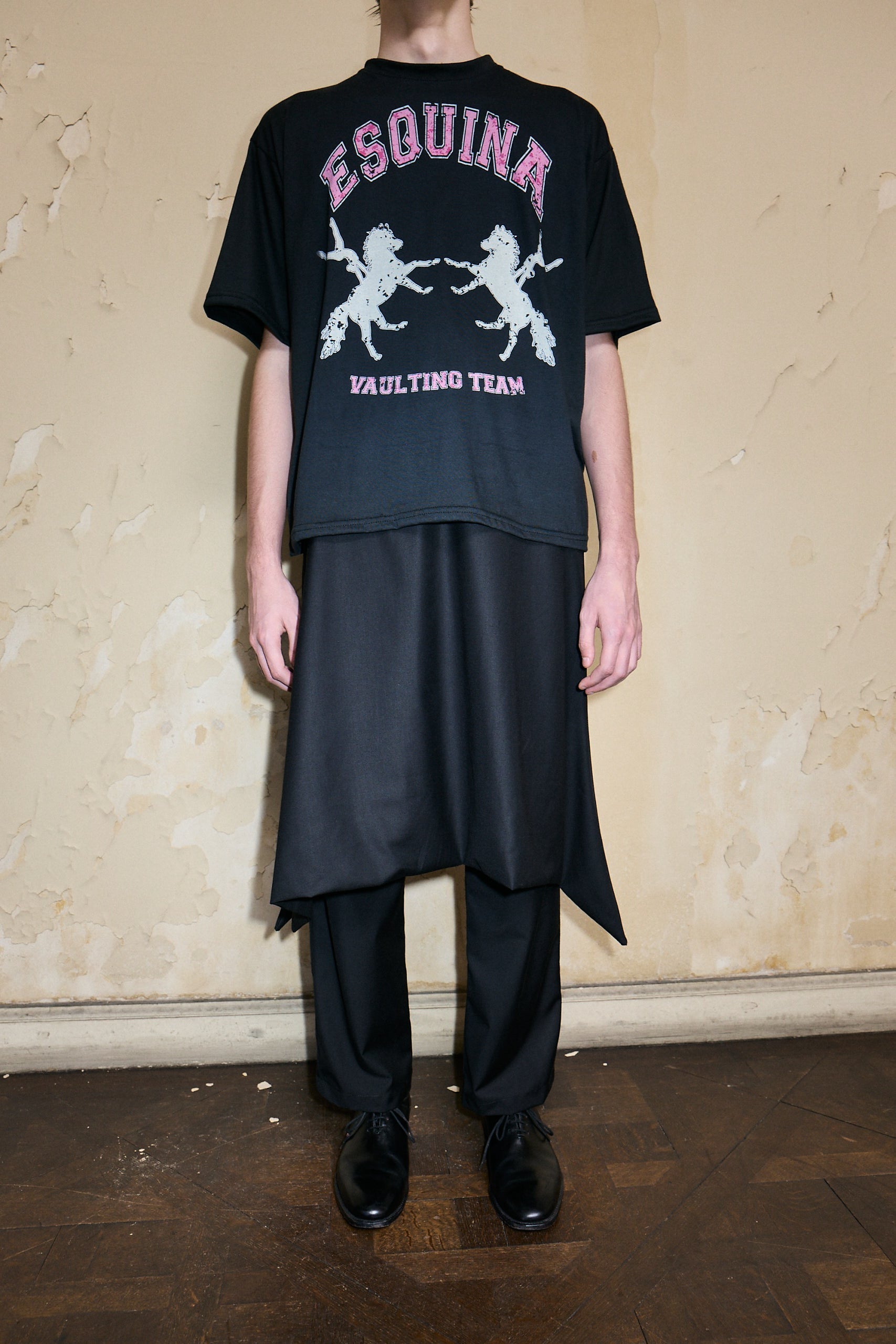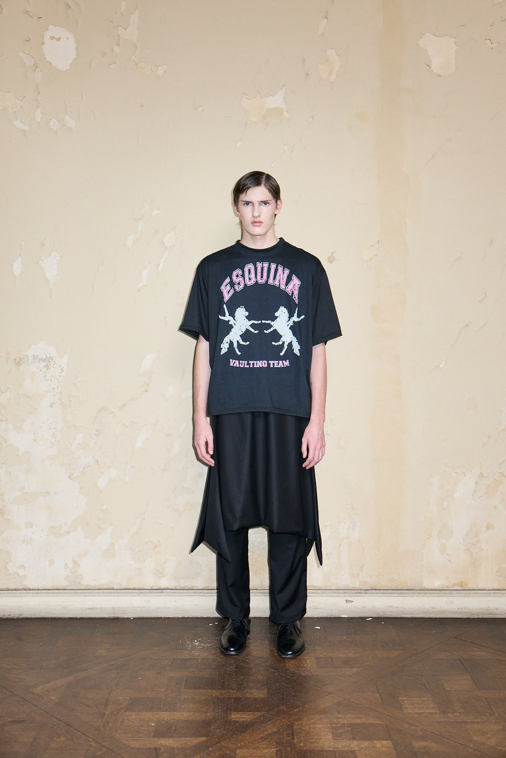 Juana, wearing size S, measures 5'7 and Alejo, wearing size M, measures 6'10
