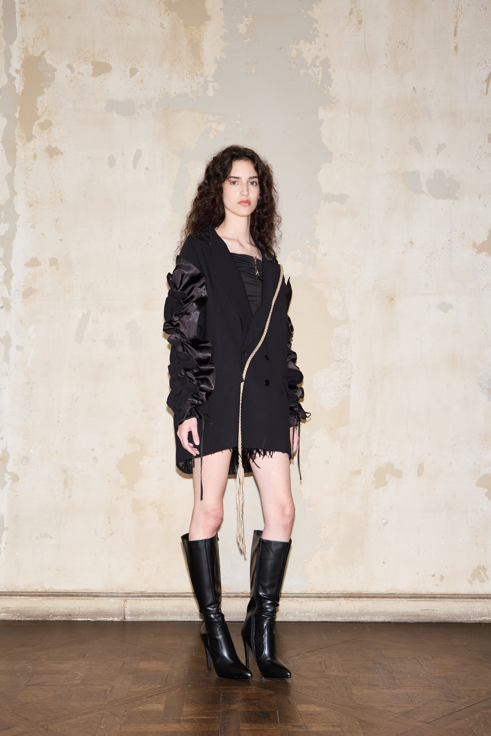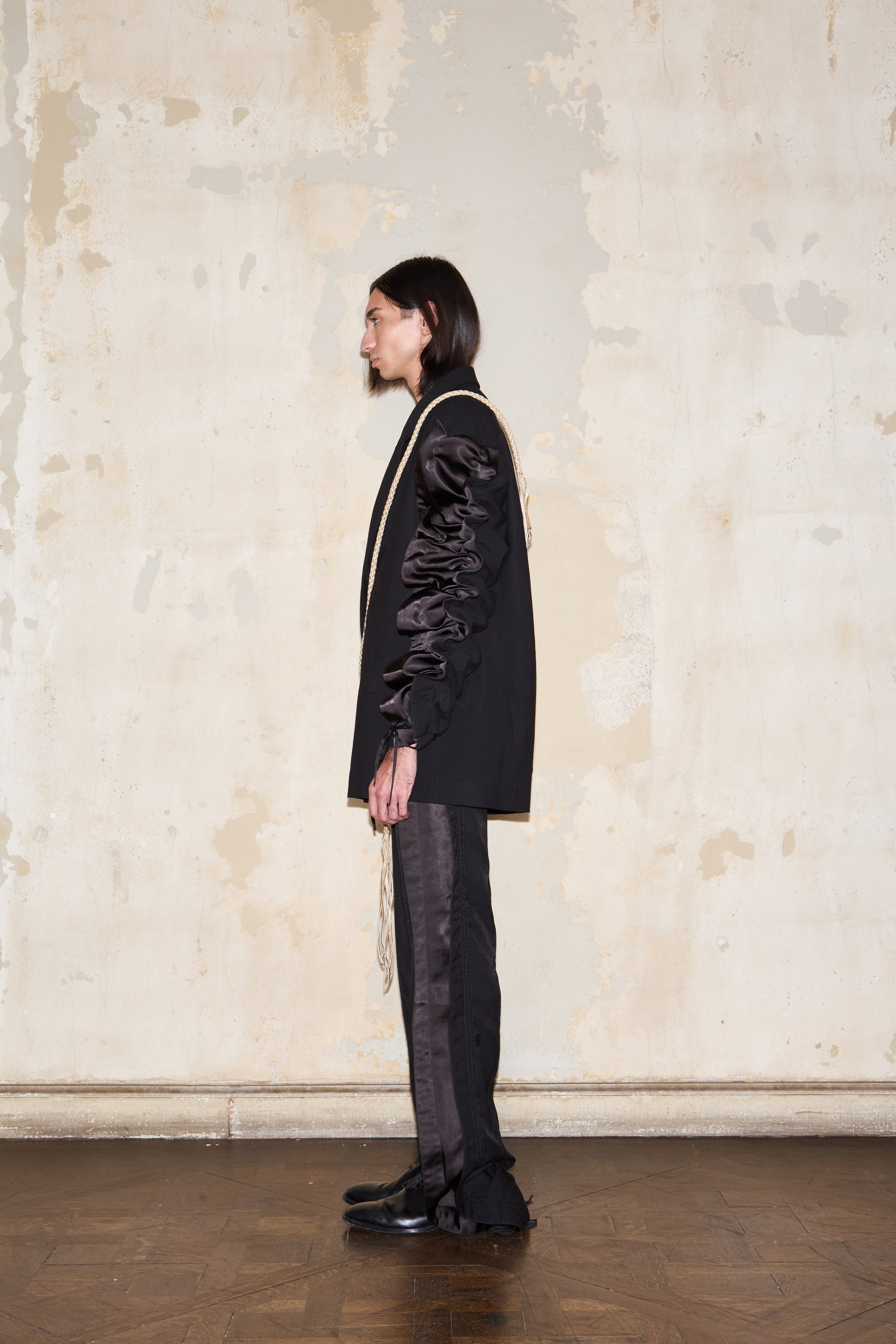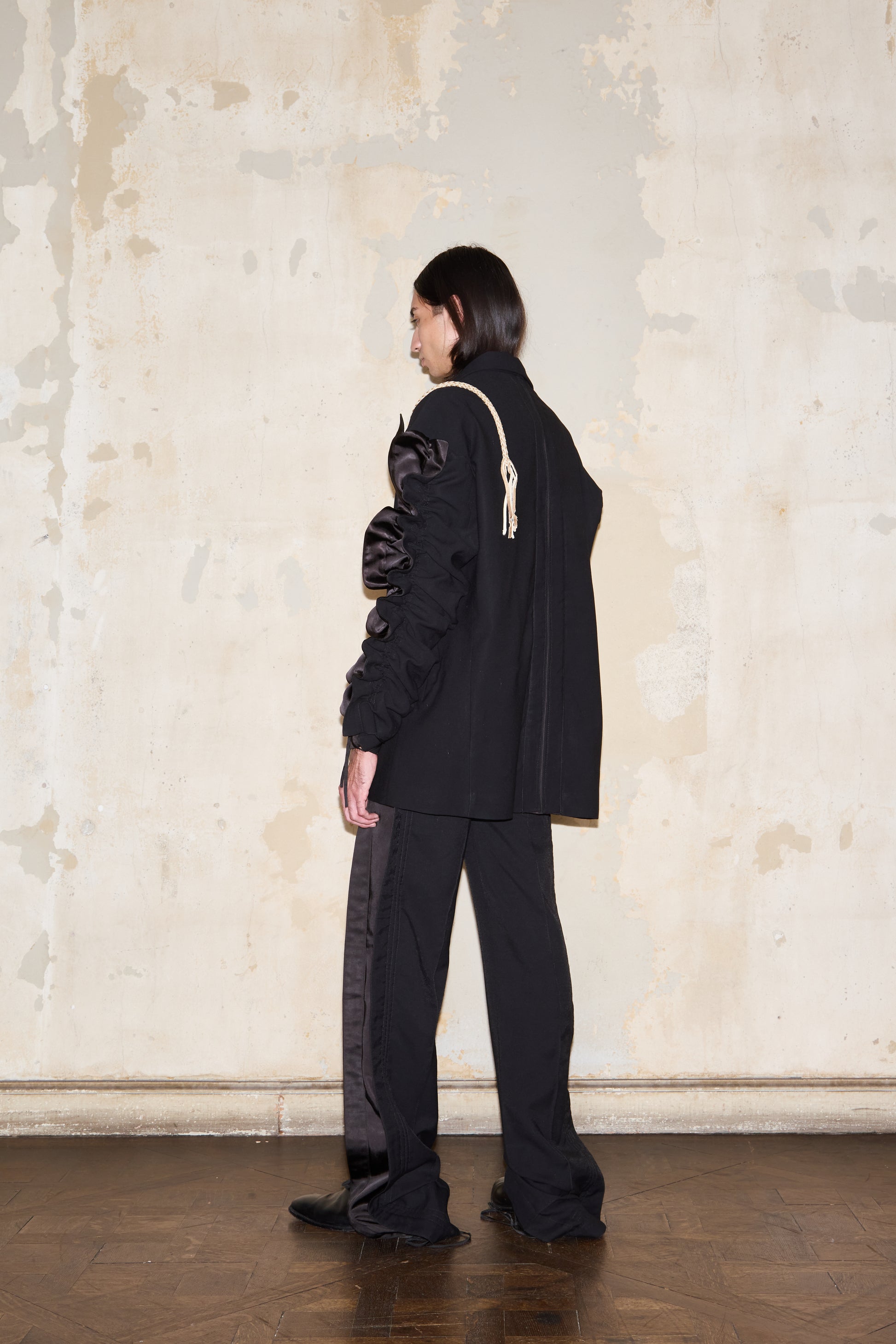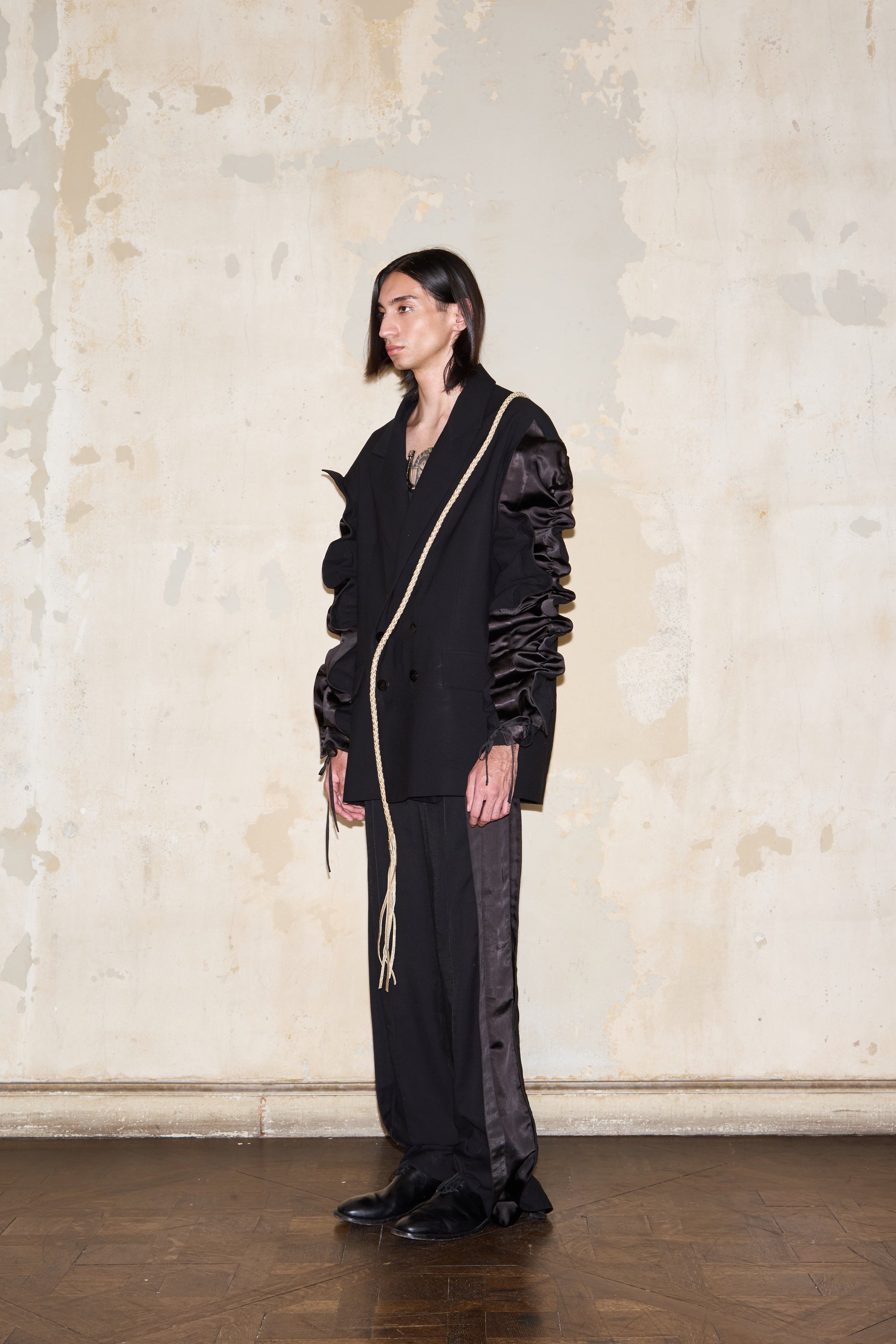 Sophisticated oversized genderless blazer featuring extra-long sleeves with satin stripes that gather using internal ties for adjustable length. Handcrafted raw leather artisanal flat braid crosses laterally. Constructed with tailoring fabric and satin. Dry clean only.