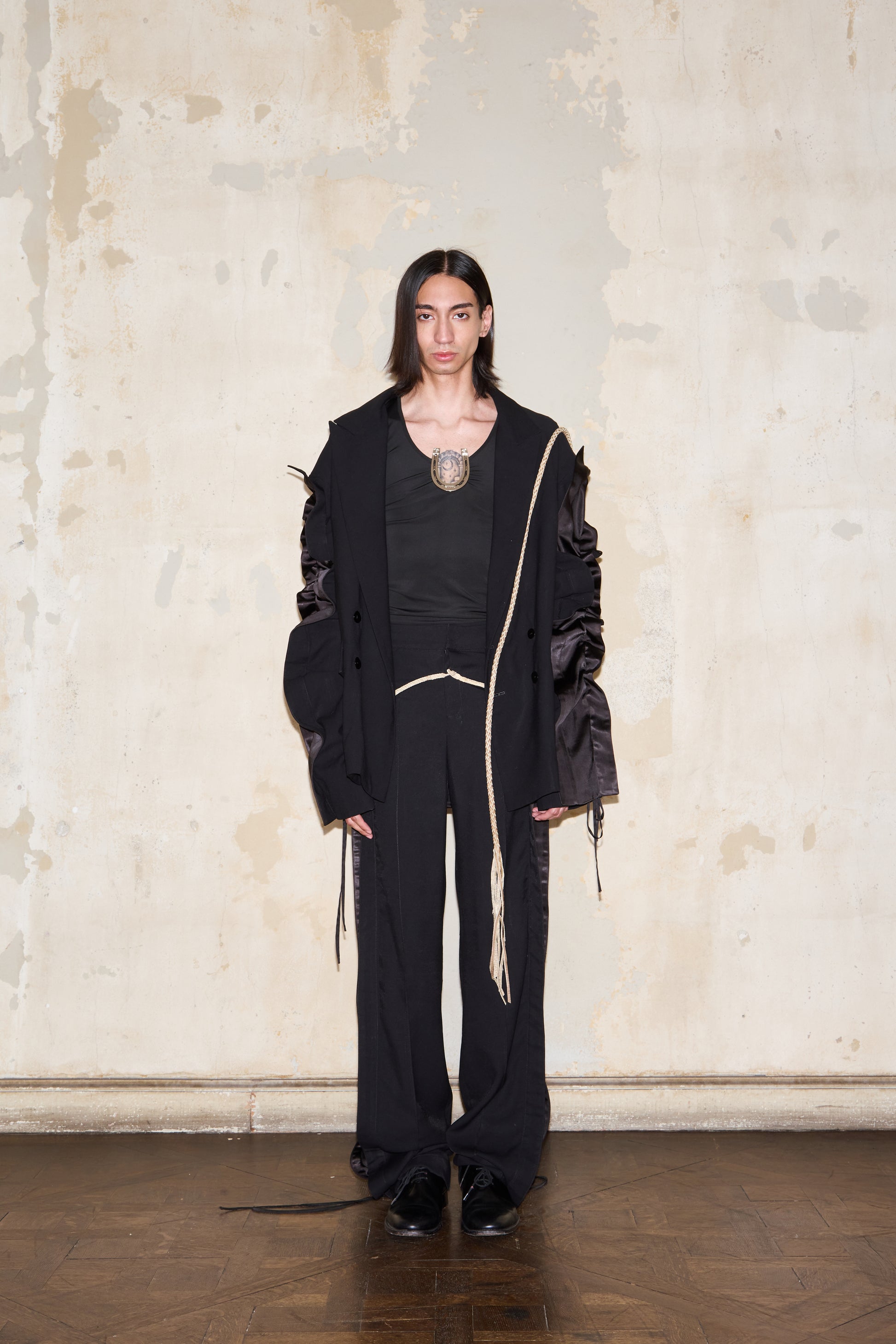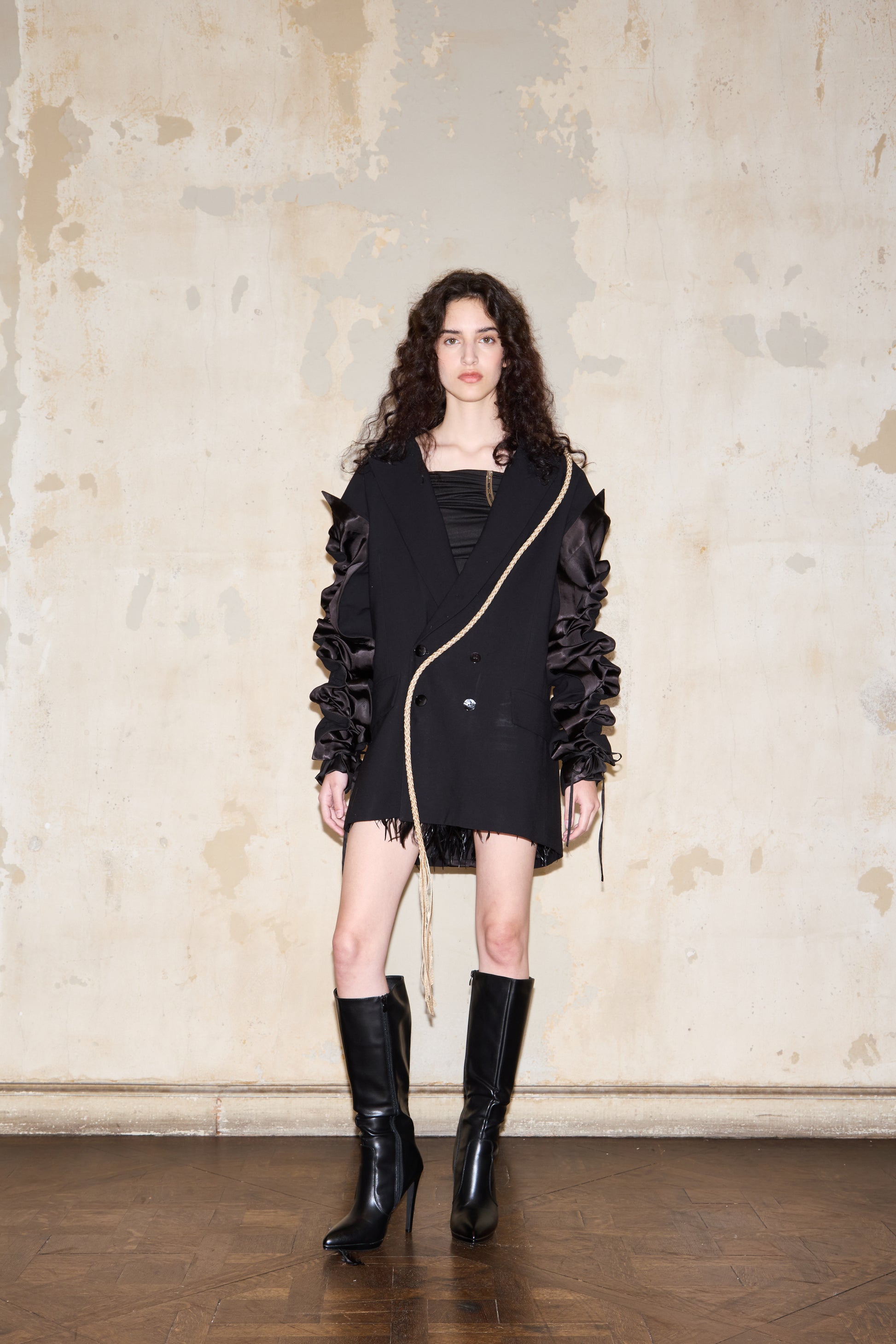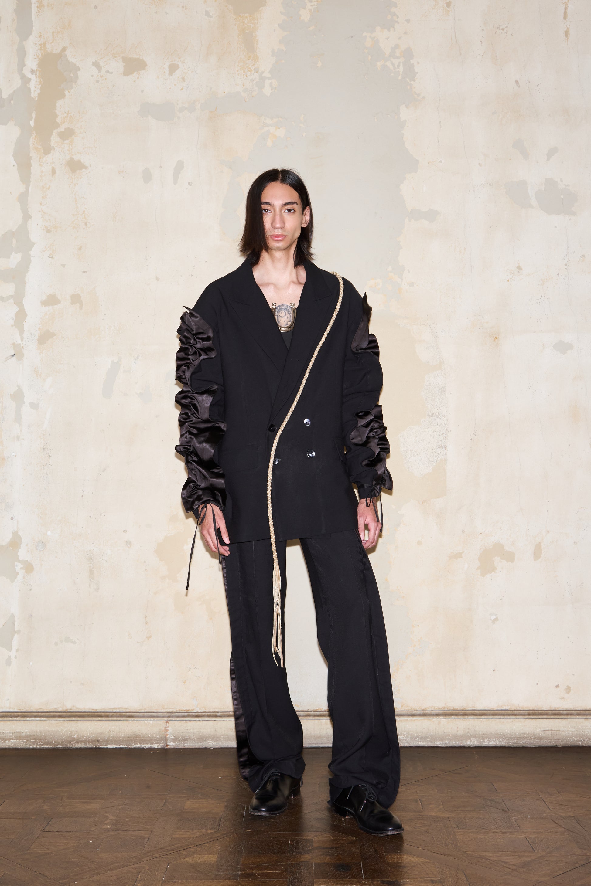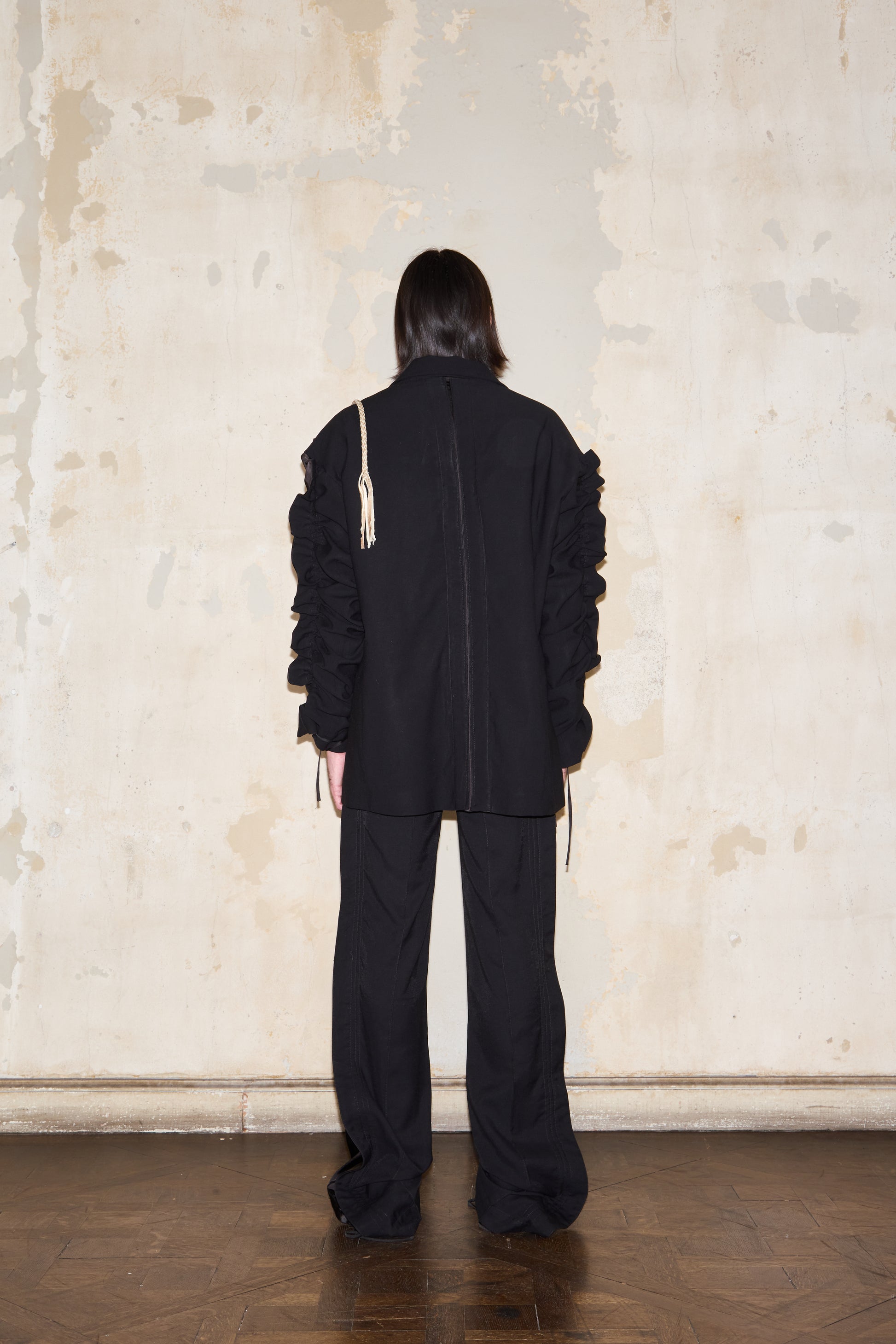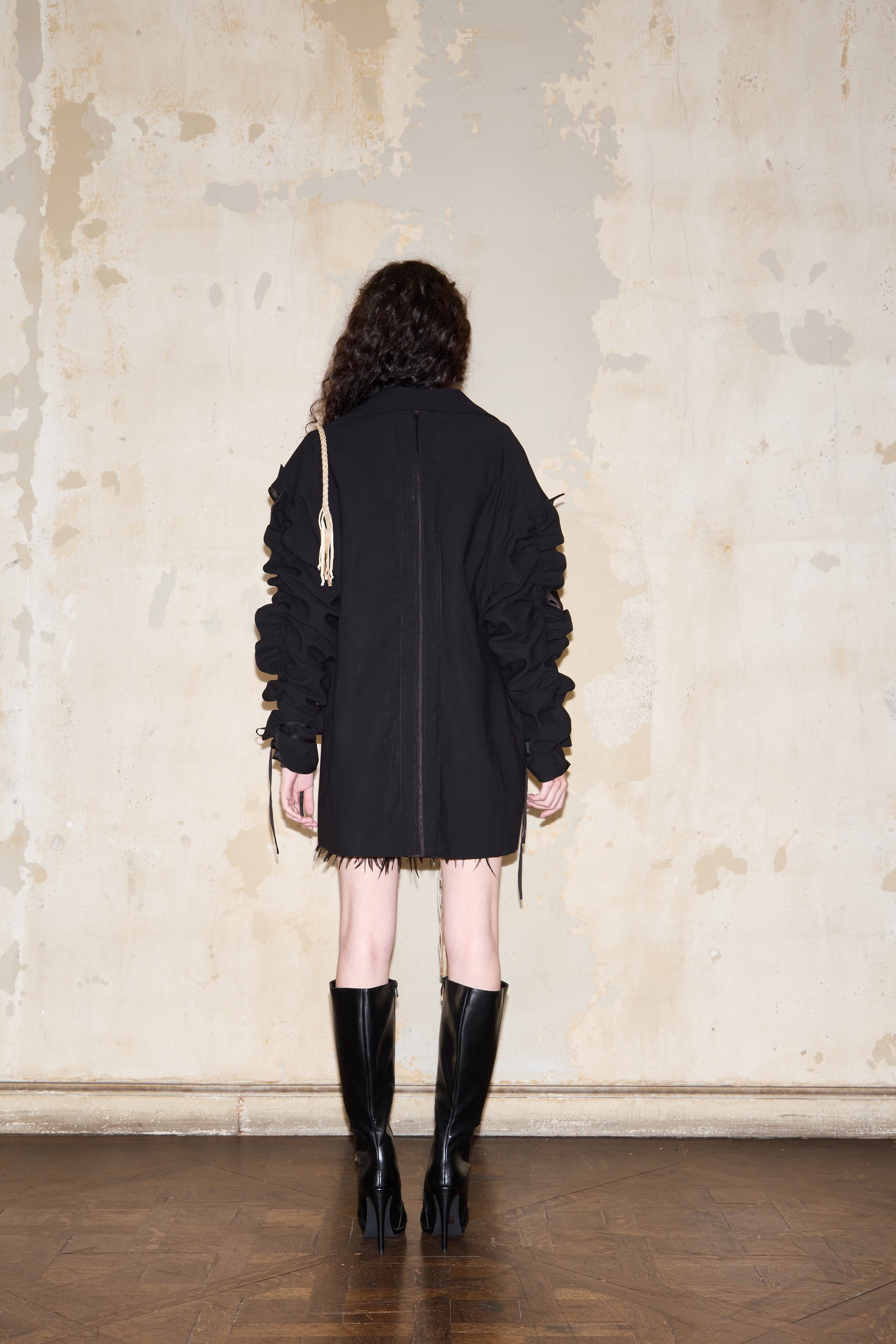 Sophisticated oversized genderless blazer featuring extra-long sleeves with satin stripes that gather using internal ties for adjustable length. Handcrafted raw leather artisanal flat braid crosses laterally. Constructed with tailoring fabric and satin. Dry clean only.