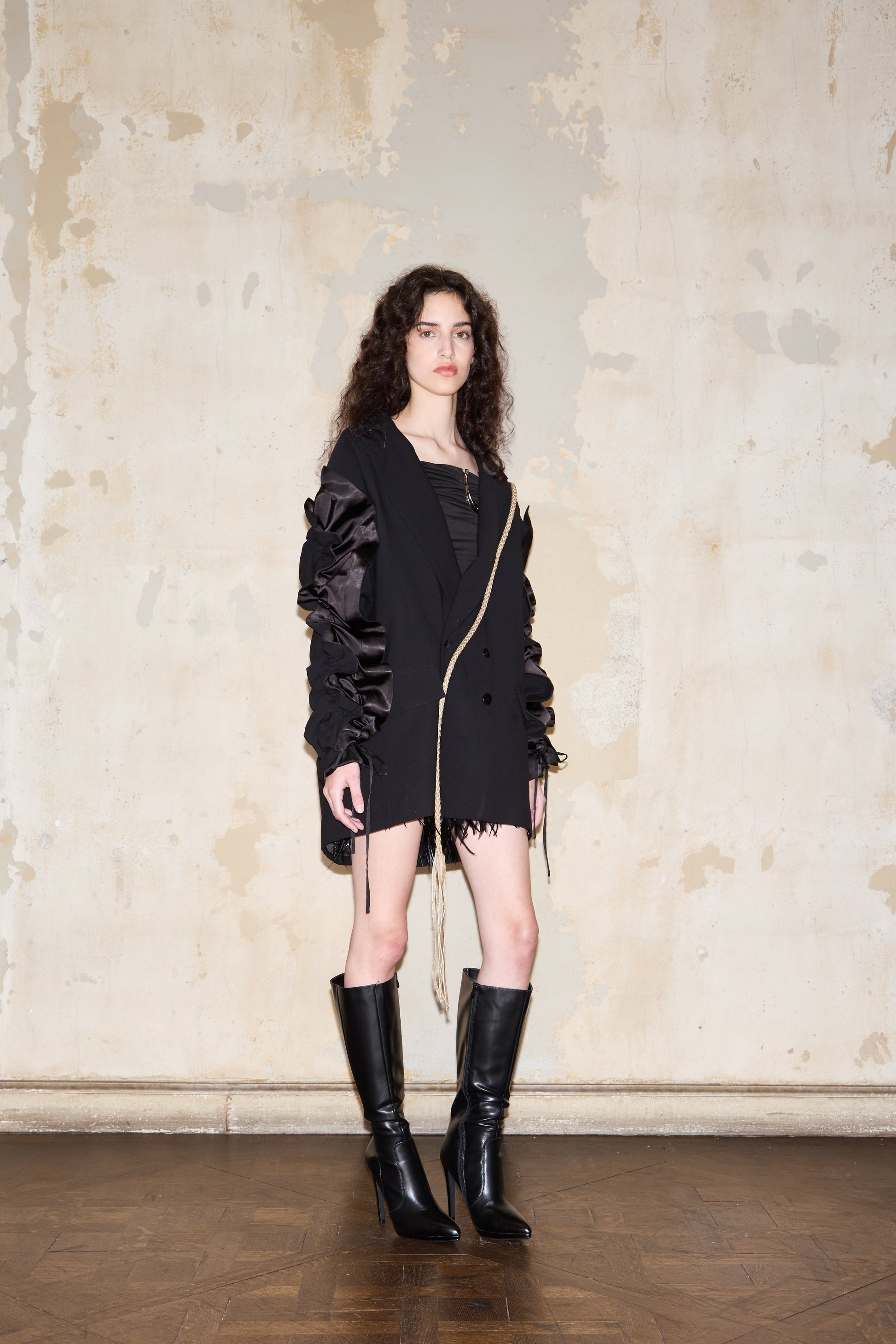 Mini skirt crafted from fine cloth with an asymmetrical hemline, higher at front and back. Features tonal feather trim and exclusive ESQUINA signature print satin lining. Made with Italian cloth, printed satin, and feathers. Professional dry cleaning recommended.