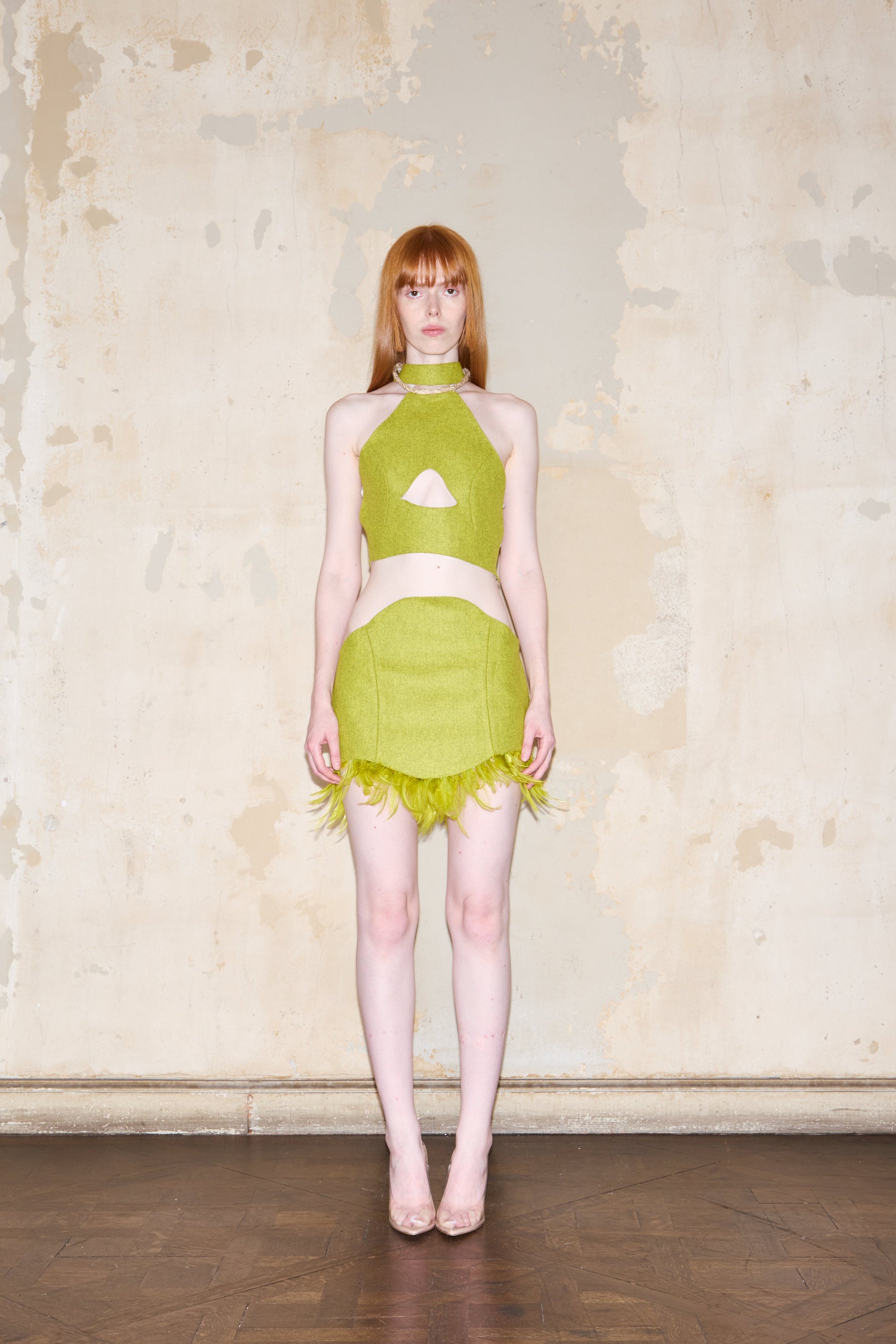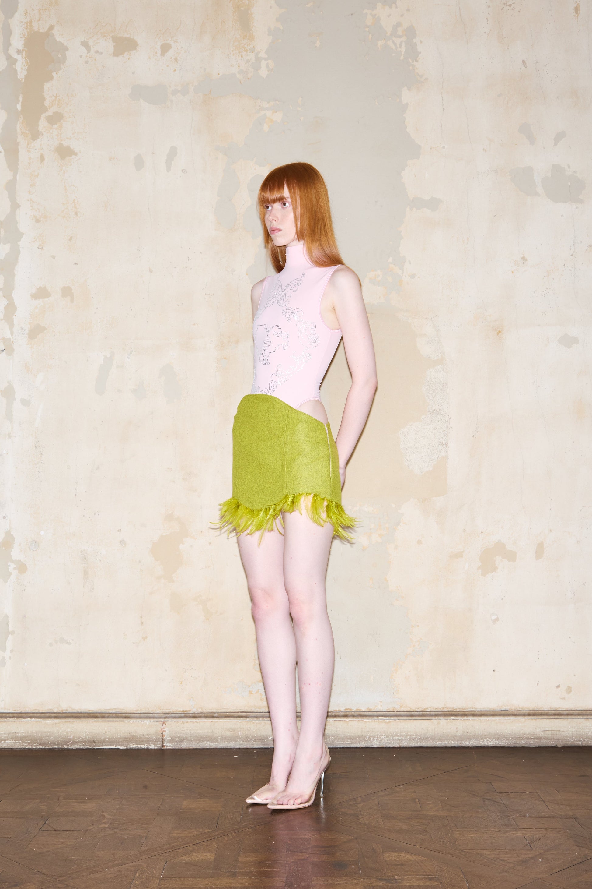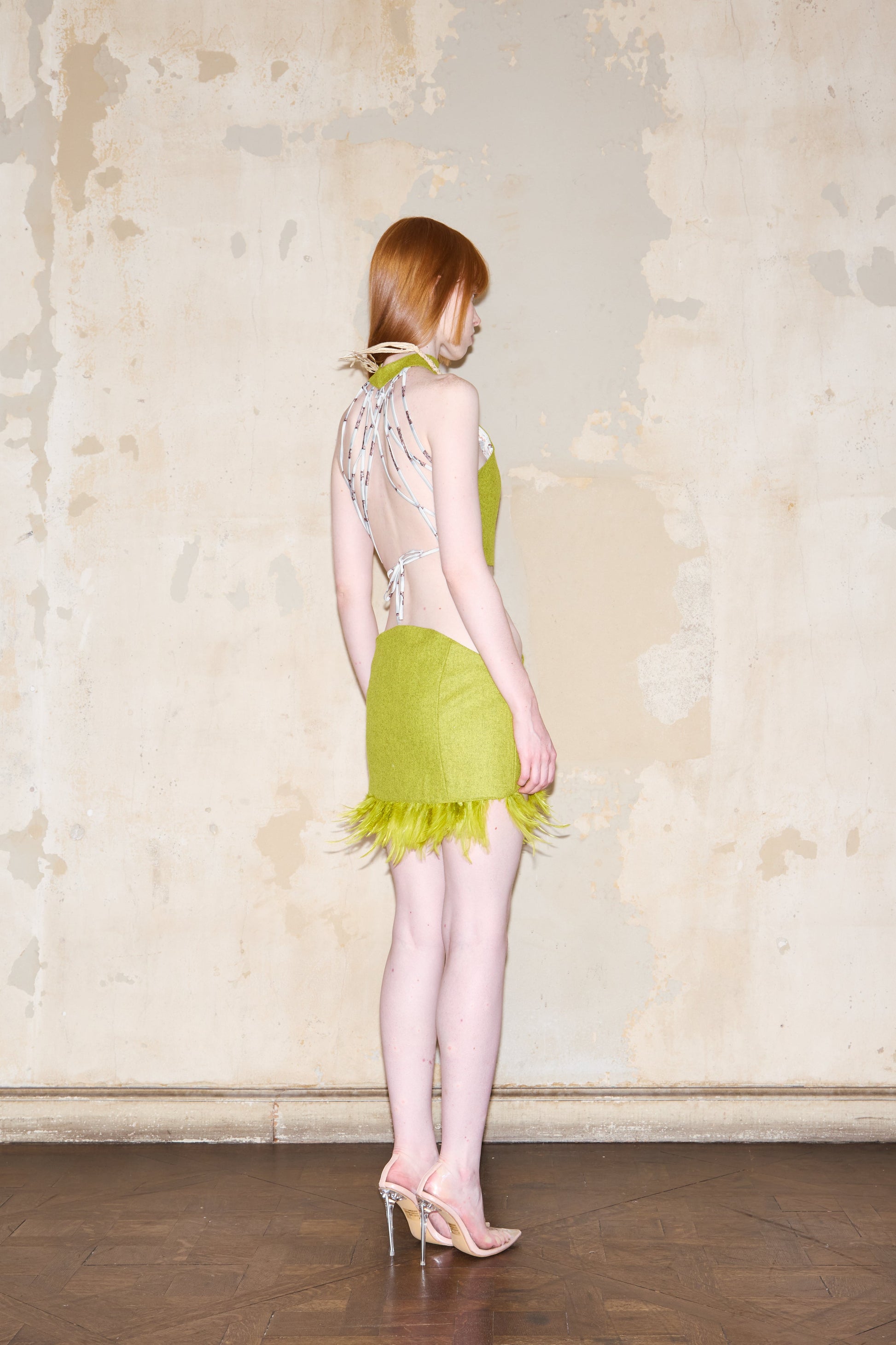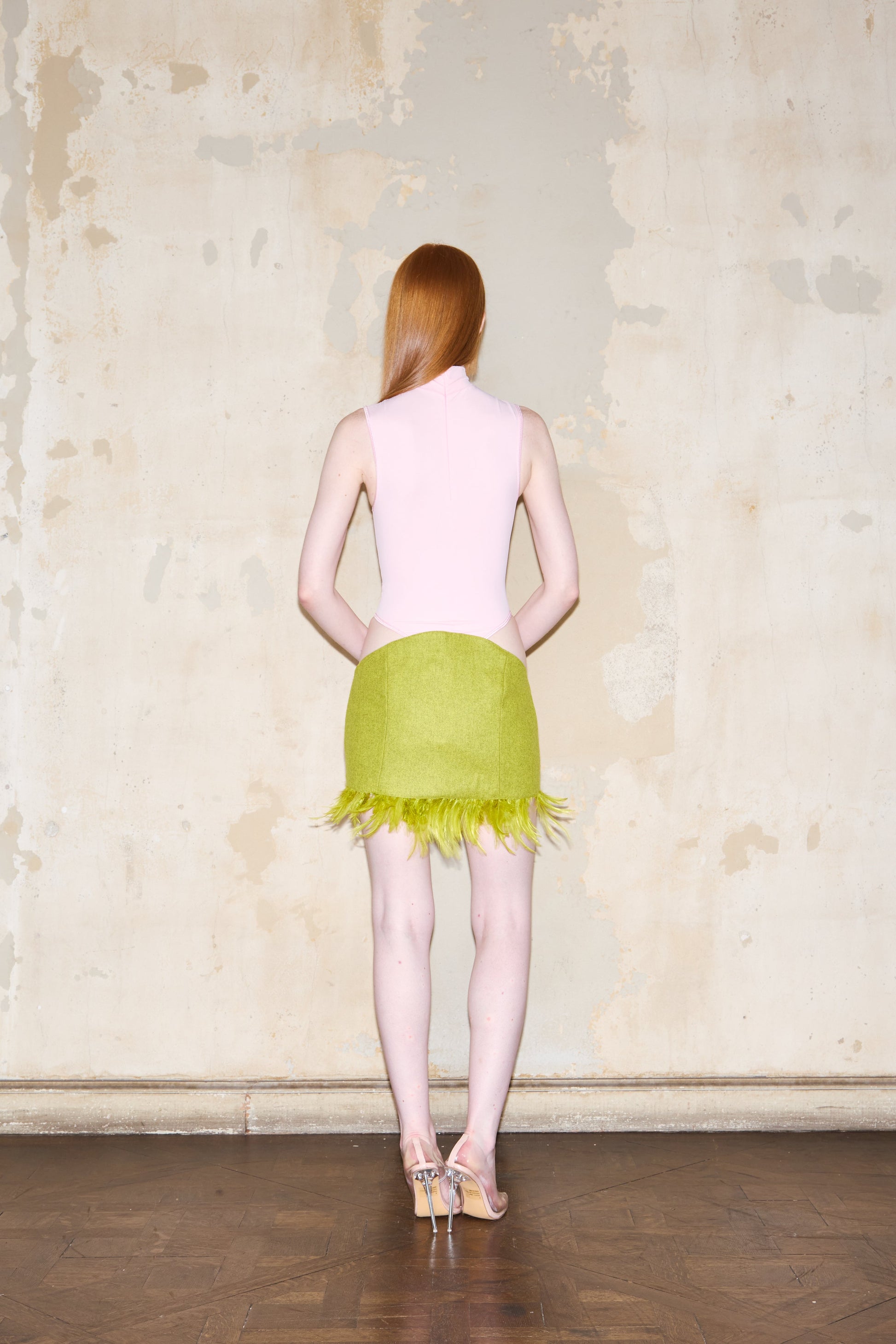 Mini skirt crafted from fine cloth with an asymmetrical hemline, higher at front and back. Features tonal feather trim and exclusive ESQUINA signature print satin lining. Made with Italian cloth, printed satin, and feathers. Professional dry cleaning recommended.