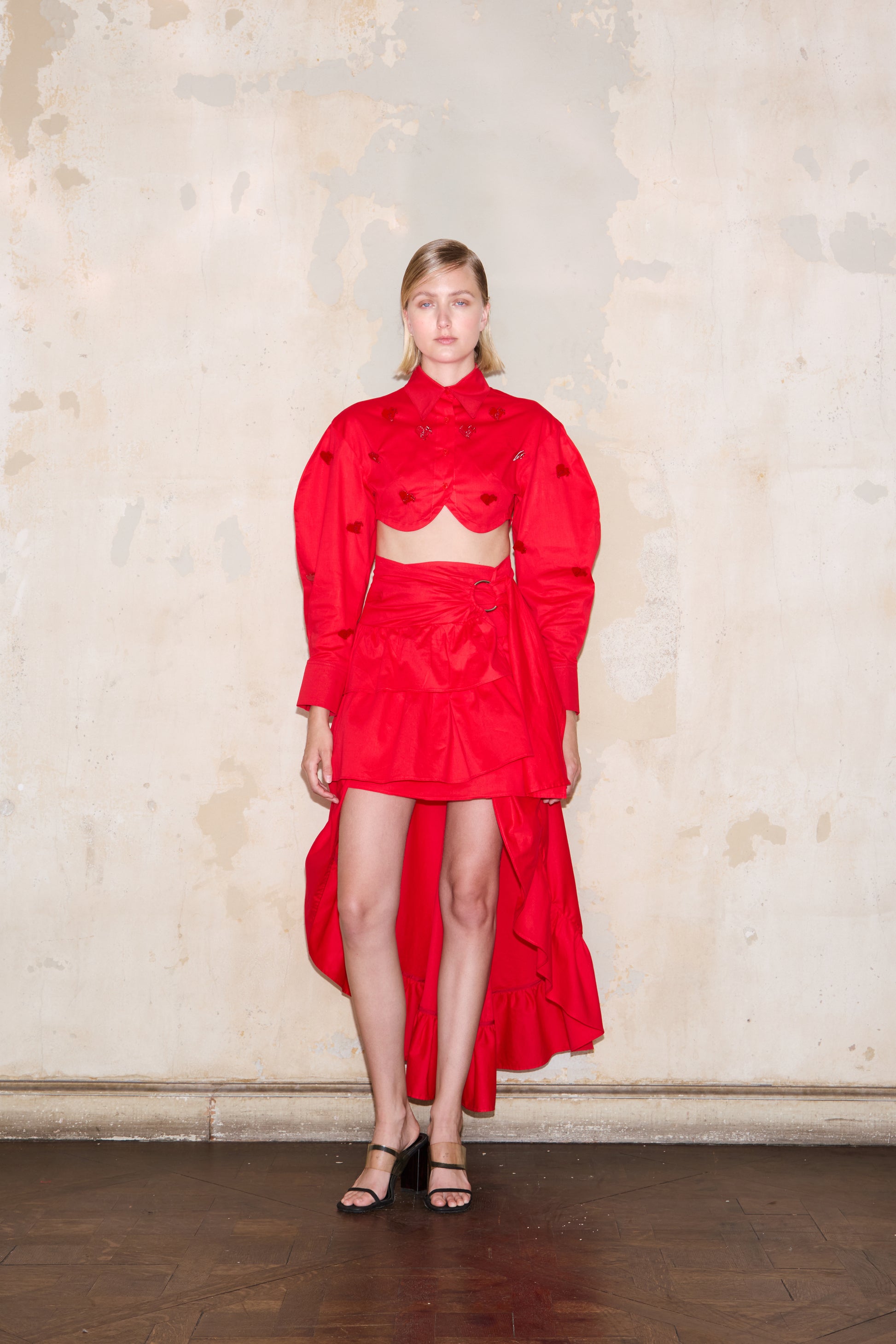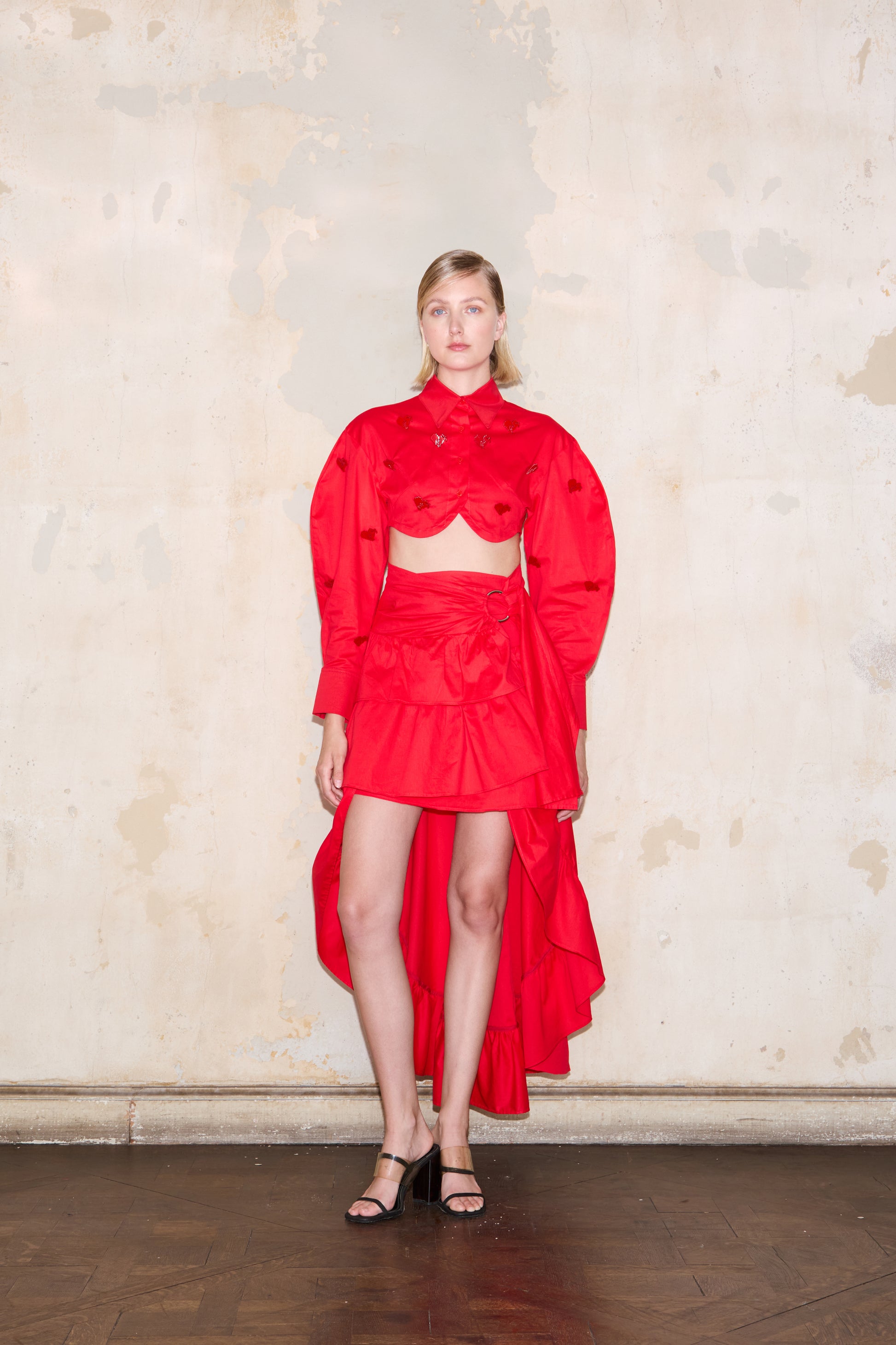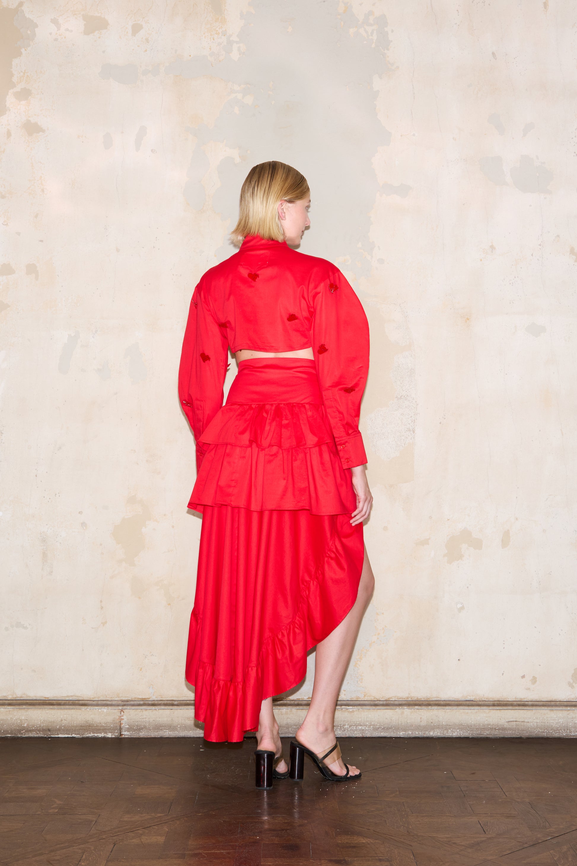 Classic cropped shirt made from Italian poplin. The front is cut in a wavy shape and is slightly fitted at the hem, while the sleeves are voluminous for an exaggerated silhouette.