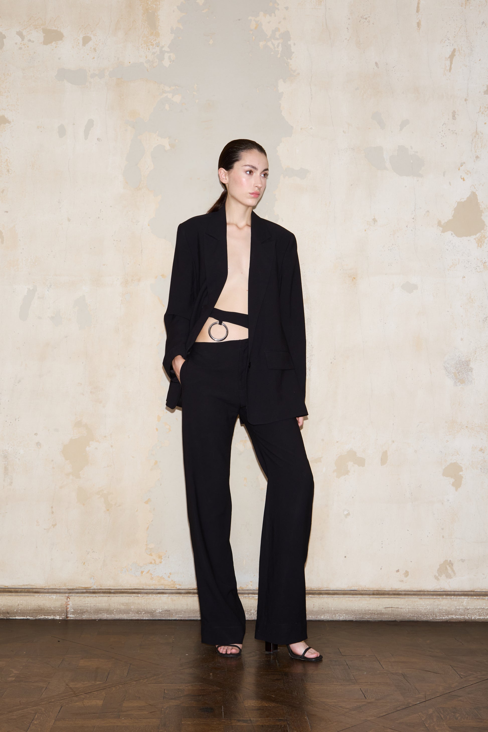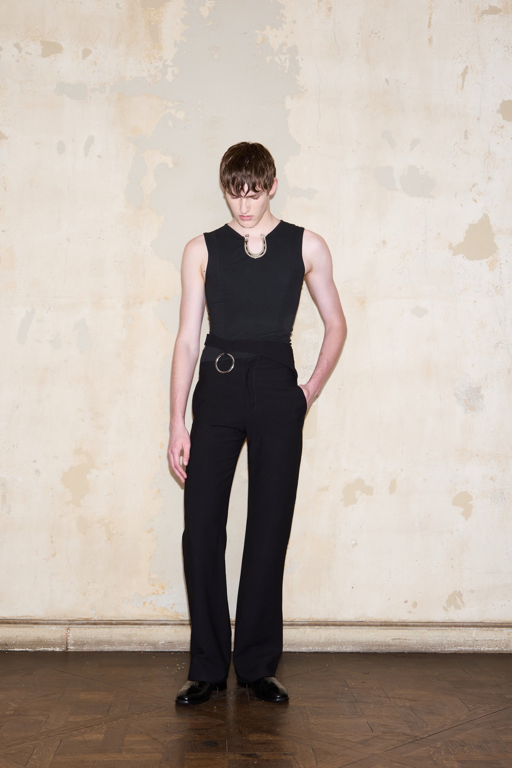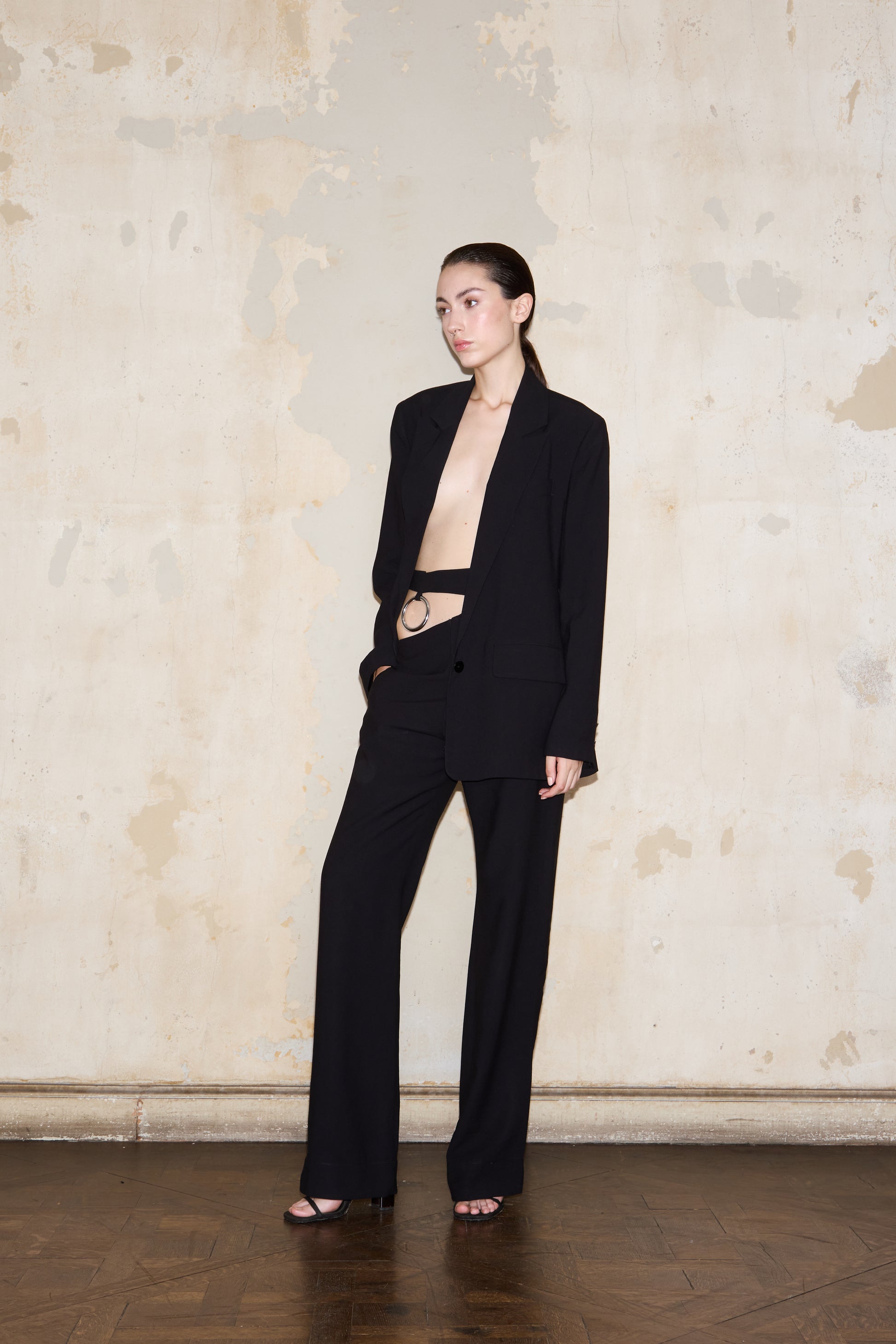 Straight-leg pants made from black Italian tailoring fabric, featuring an irregular waistband that sits lower on one side. The loose waist at the front is finished with a saddle ring, while the back waistline is cut to reveal skin on one side.