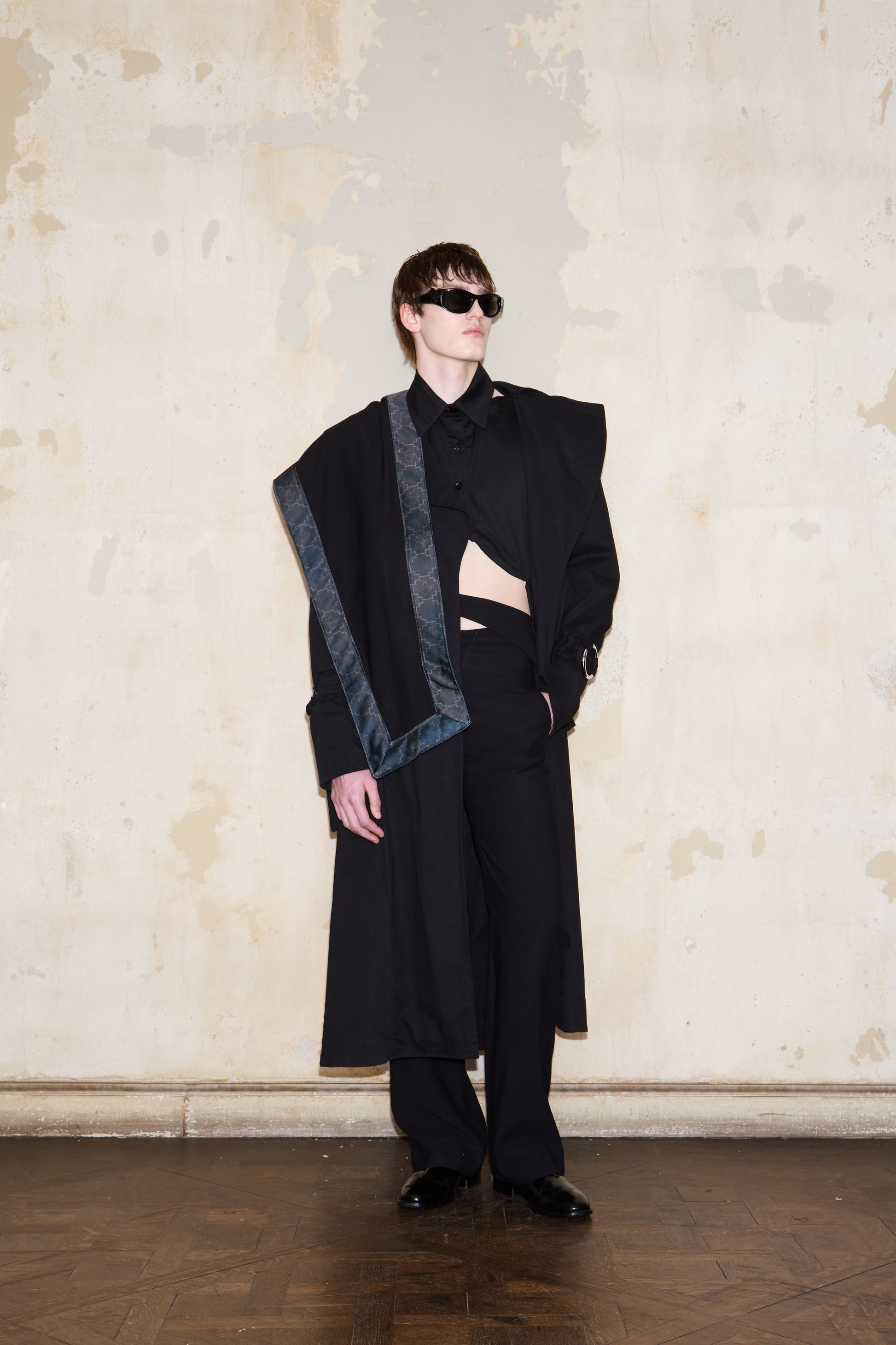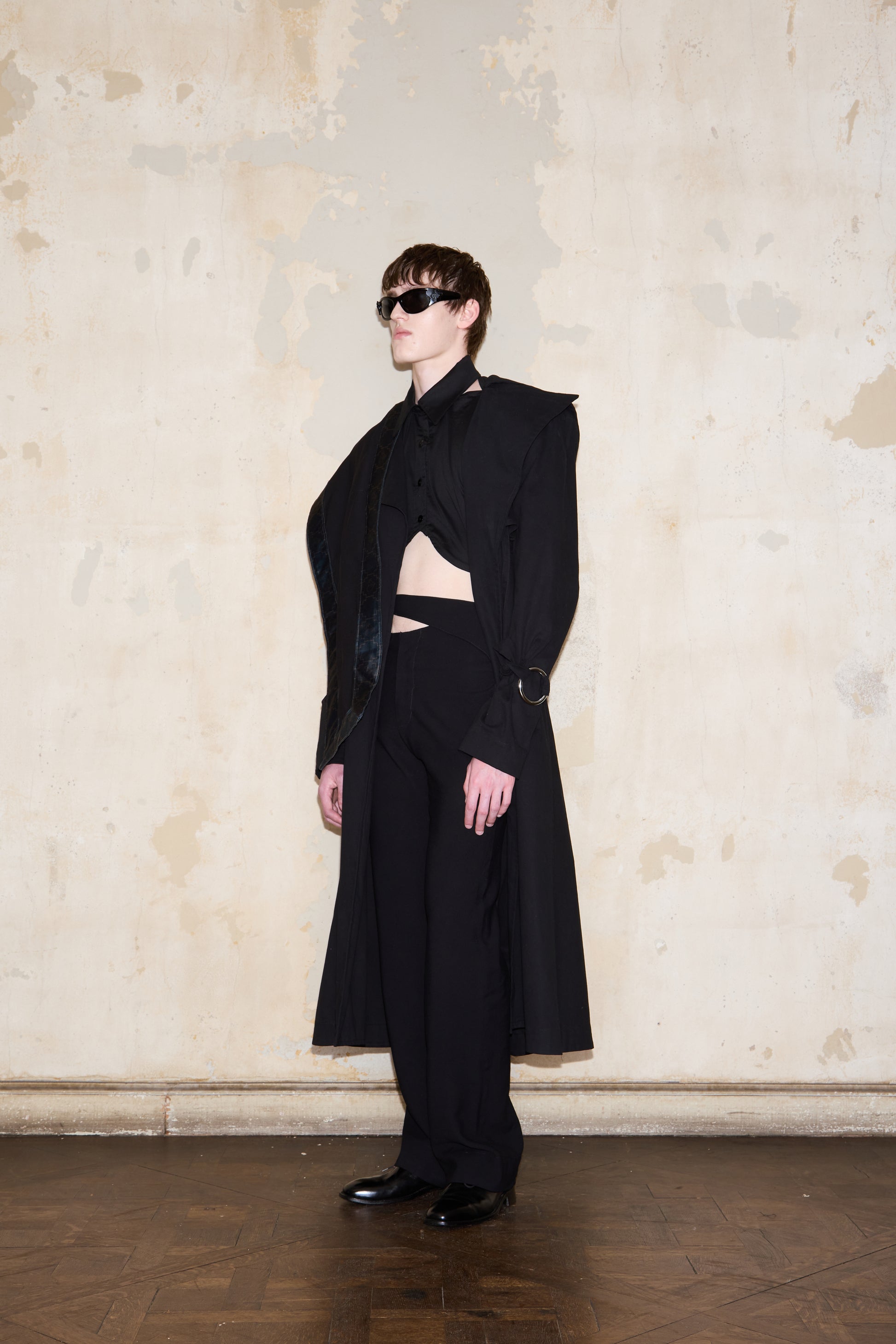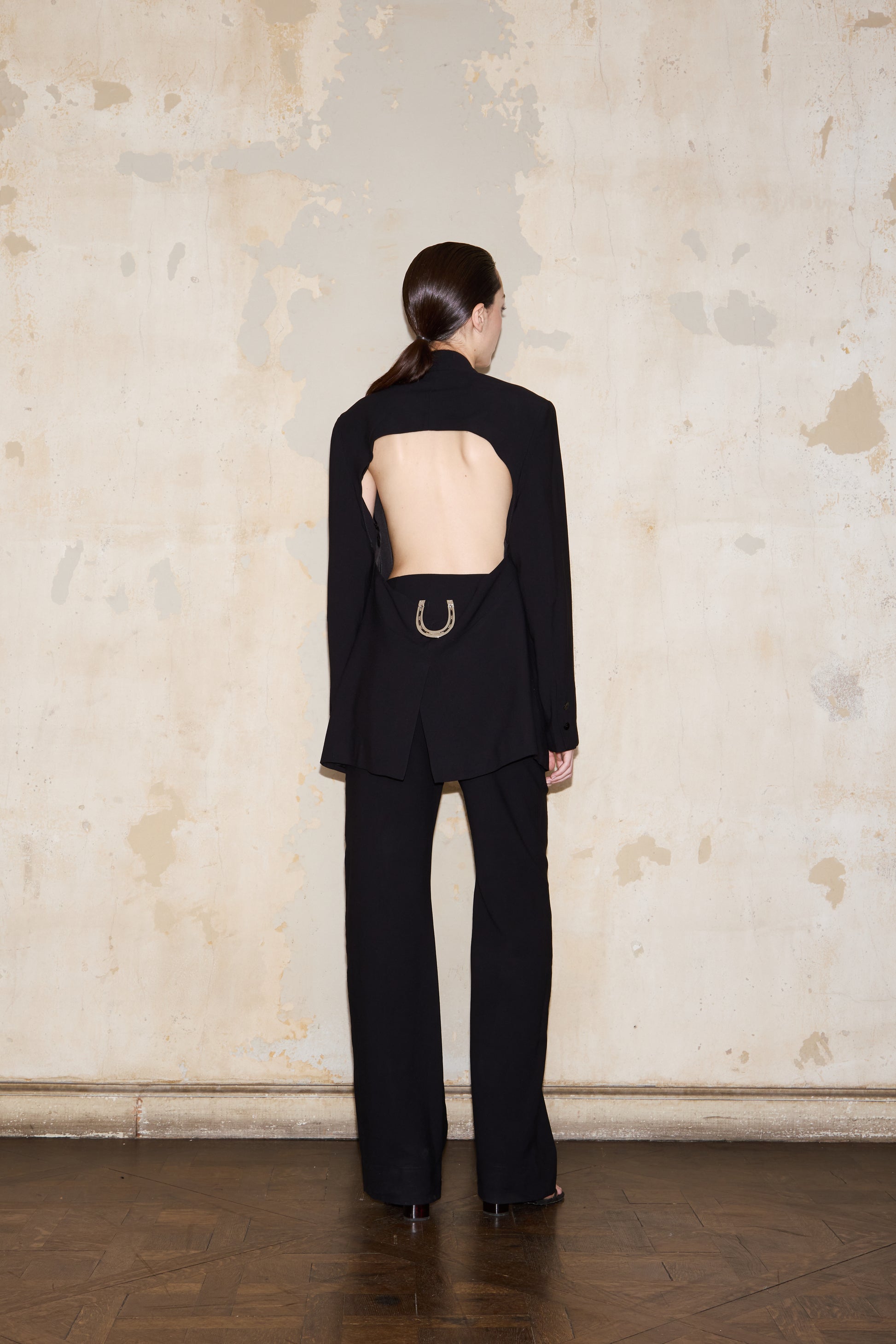 Straight-leg pants made from black Italian tailoring fabric, featuring an irregular waistband that sits lower on one side. The loose waist at the front is finished with a saddle ring, while the back waistline is cut to reveal skin on one side.