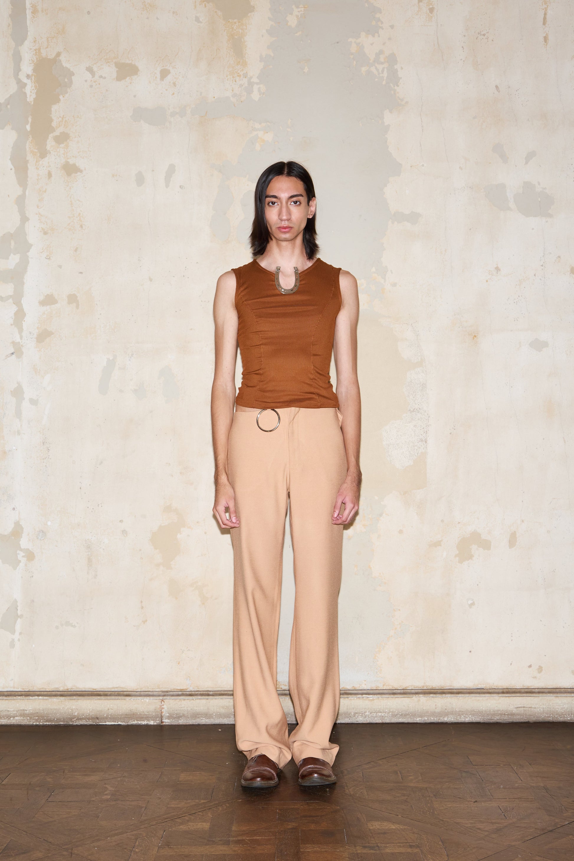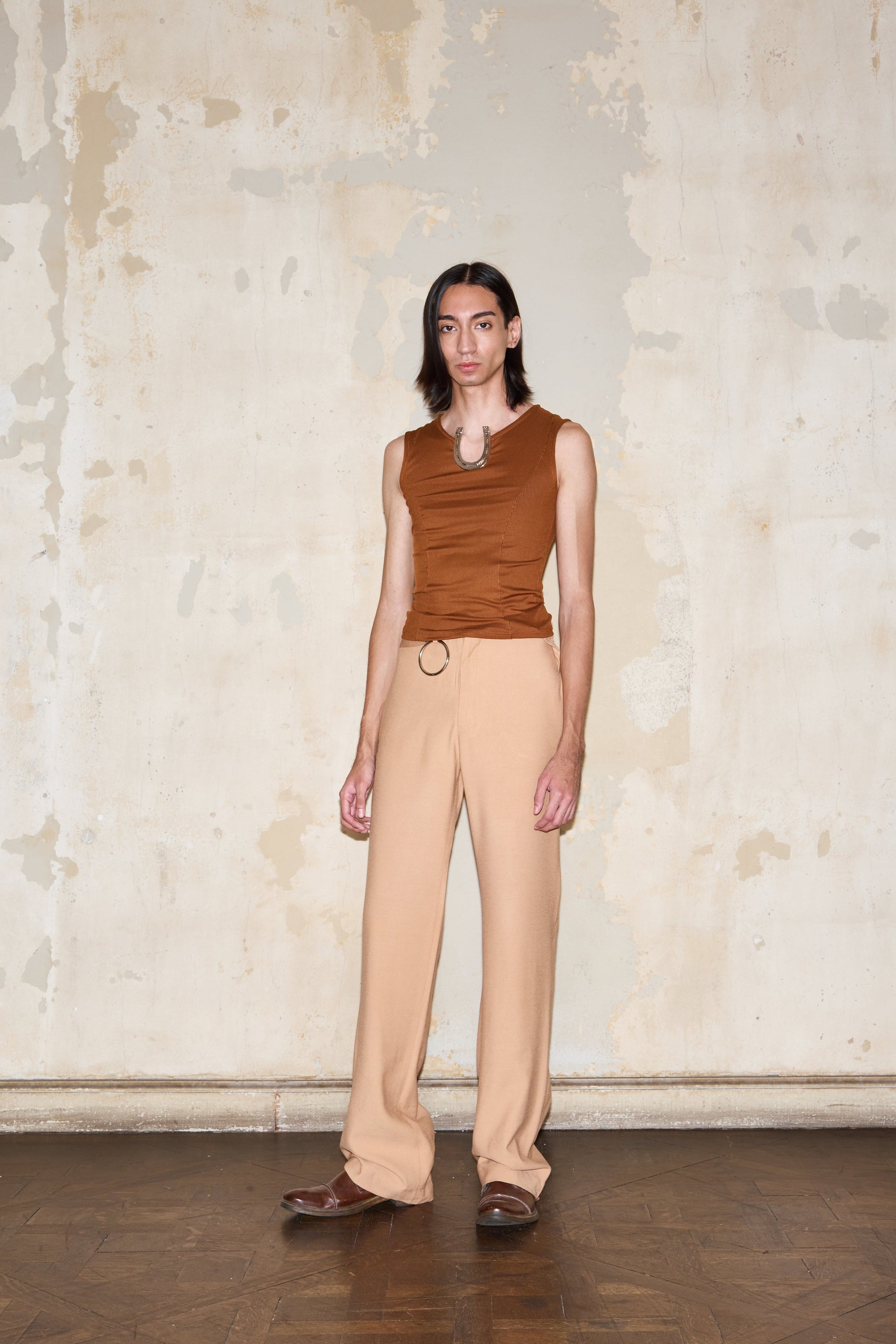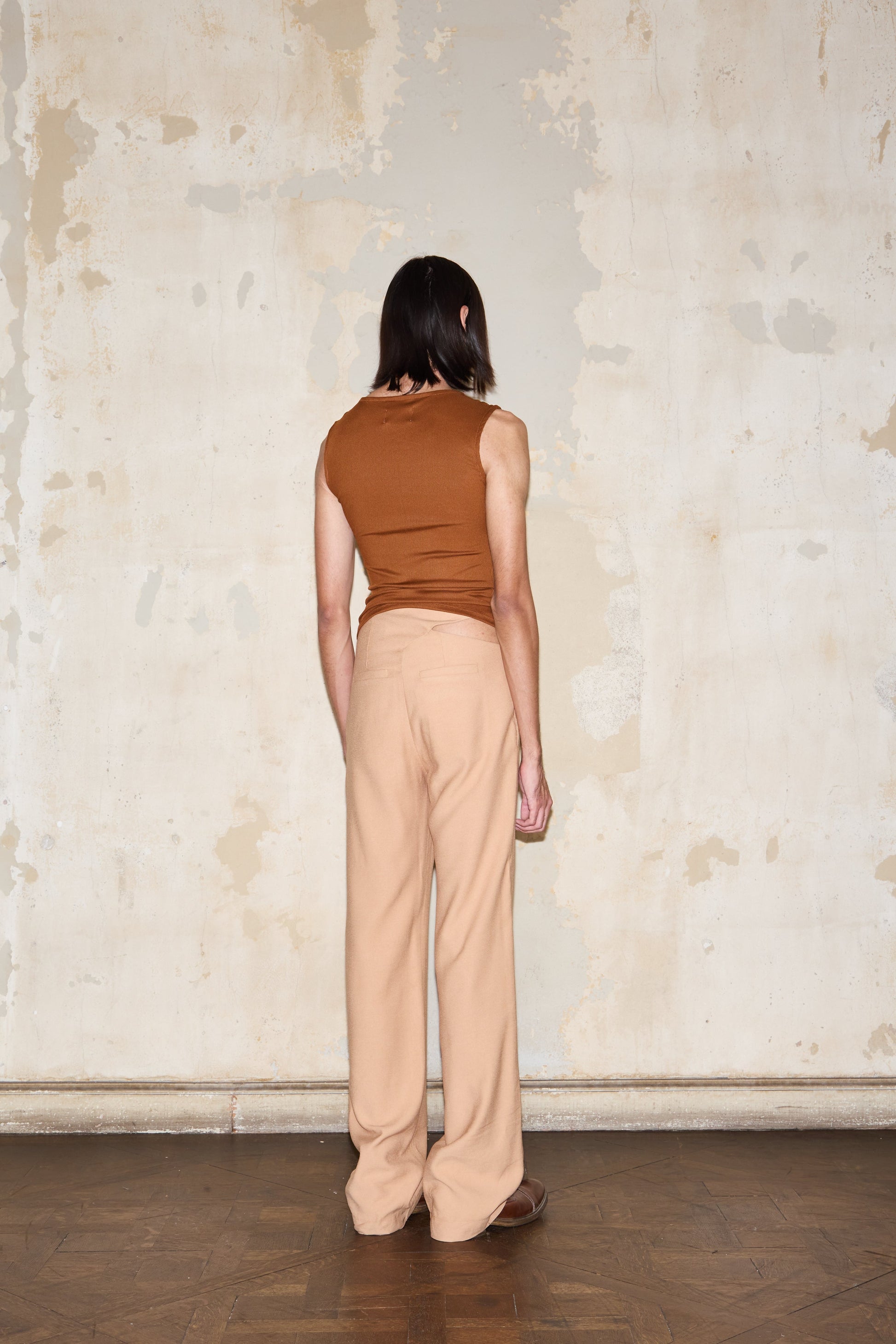 Straight-cut textured fabric pants with asymmetrical waistline, lower on one side. Features a loose front waistband finished with a saddler's ring. Back waistline cutout reveals skin on one side. After purchase, we'll contact you to adjust the waist circumference to your measurements.