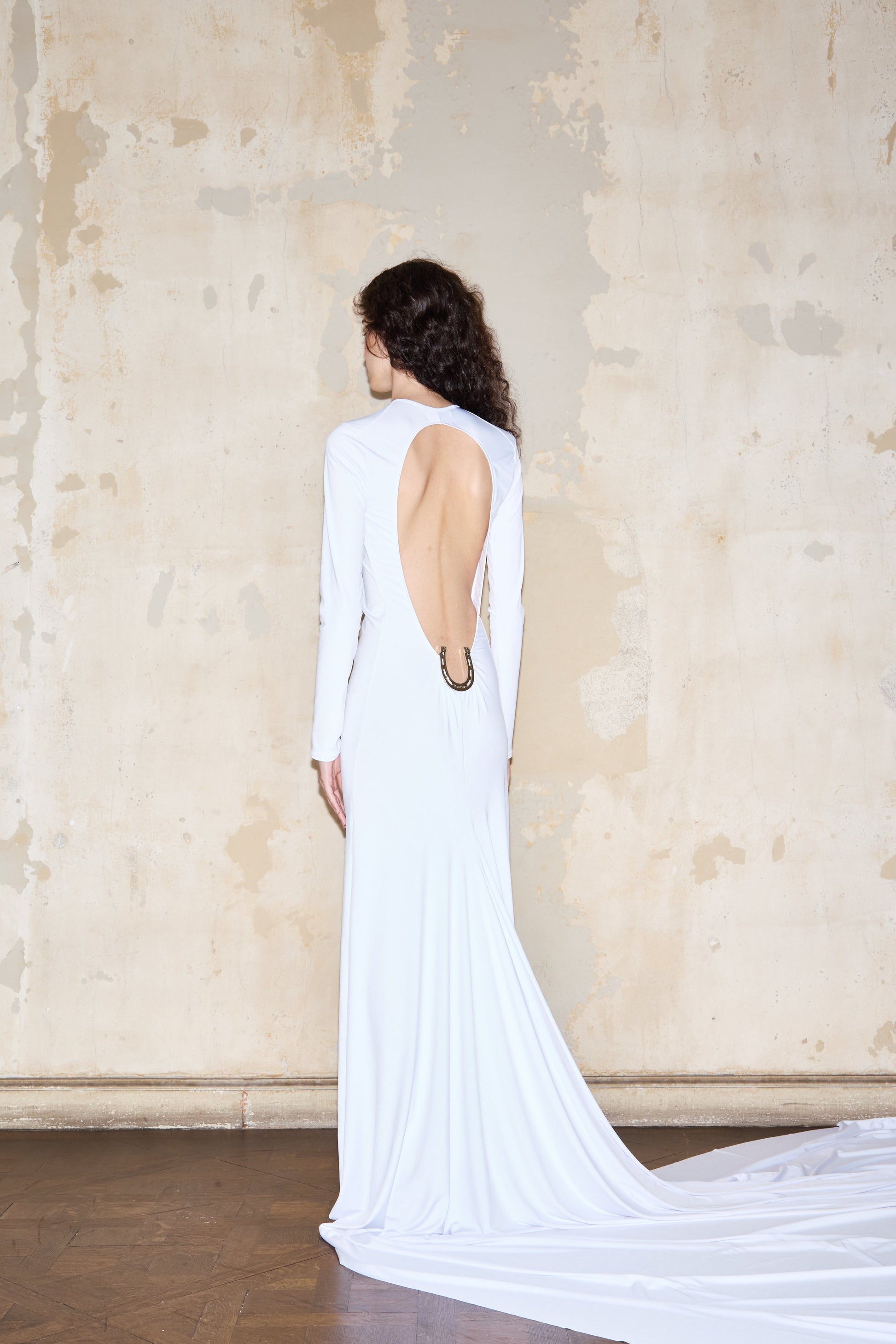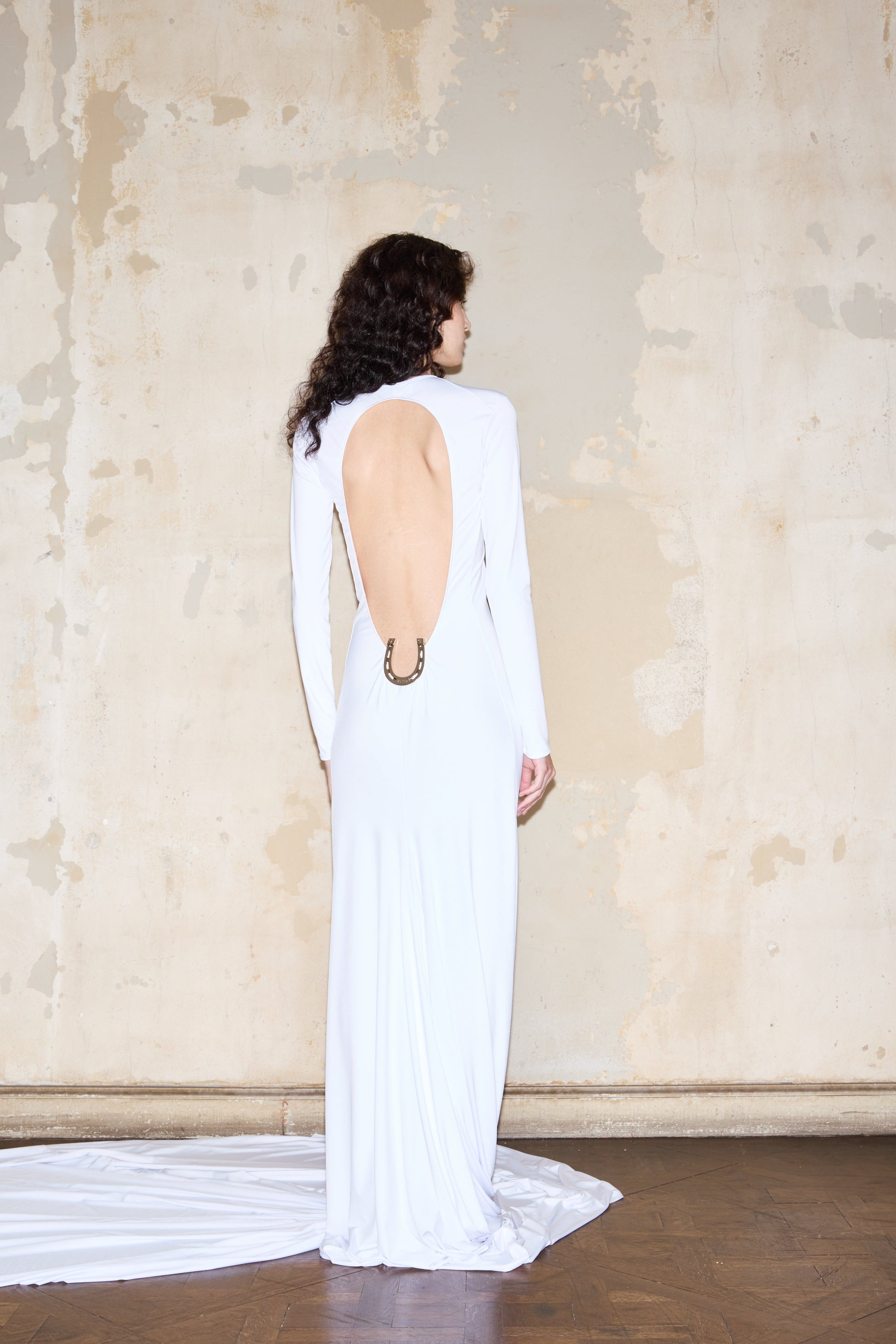 Long-sleeved white charmouse dress featuring a gathered halter neckline. Distinctive ESQUINA horseshoe embellishments adorn both the neckline and dramatic open back. The silhouette hugs the body to just below the torso before cascading into an impressive 2-meter train. Crafted from charmouse fabric, which enhances the wearer's natural contours through its material properties and structural design.
