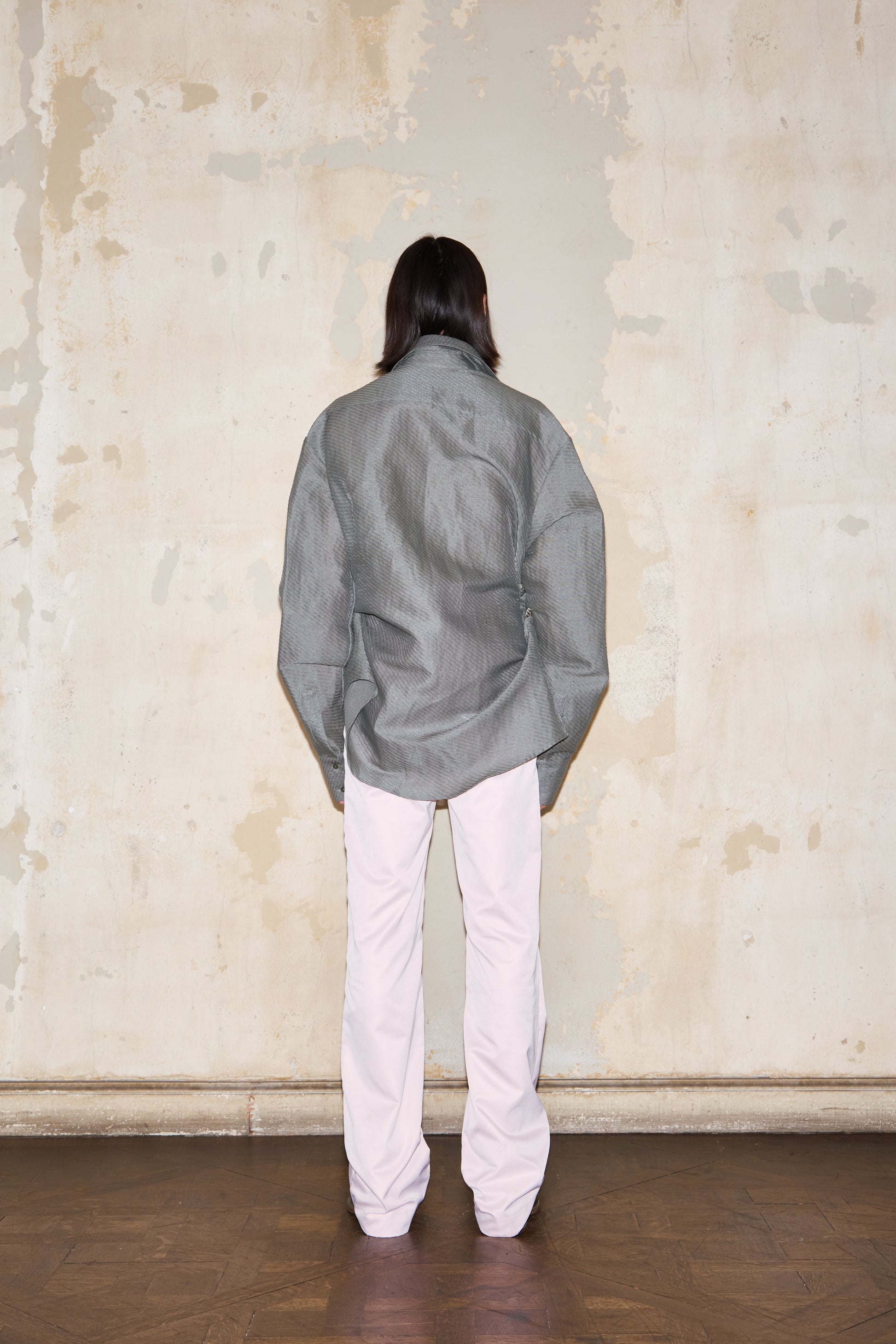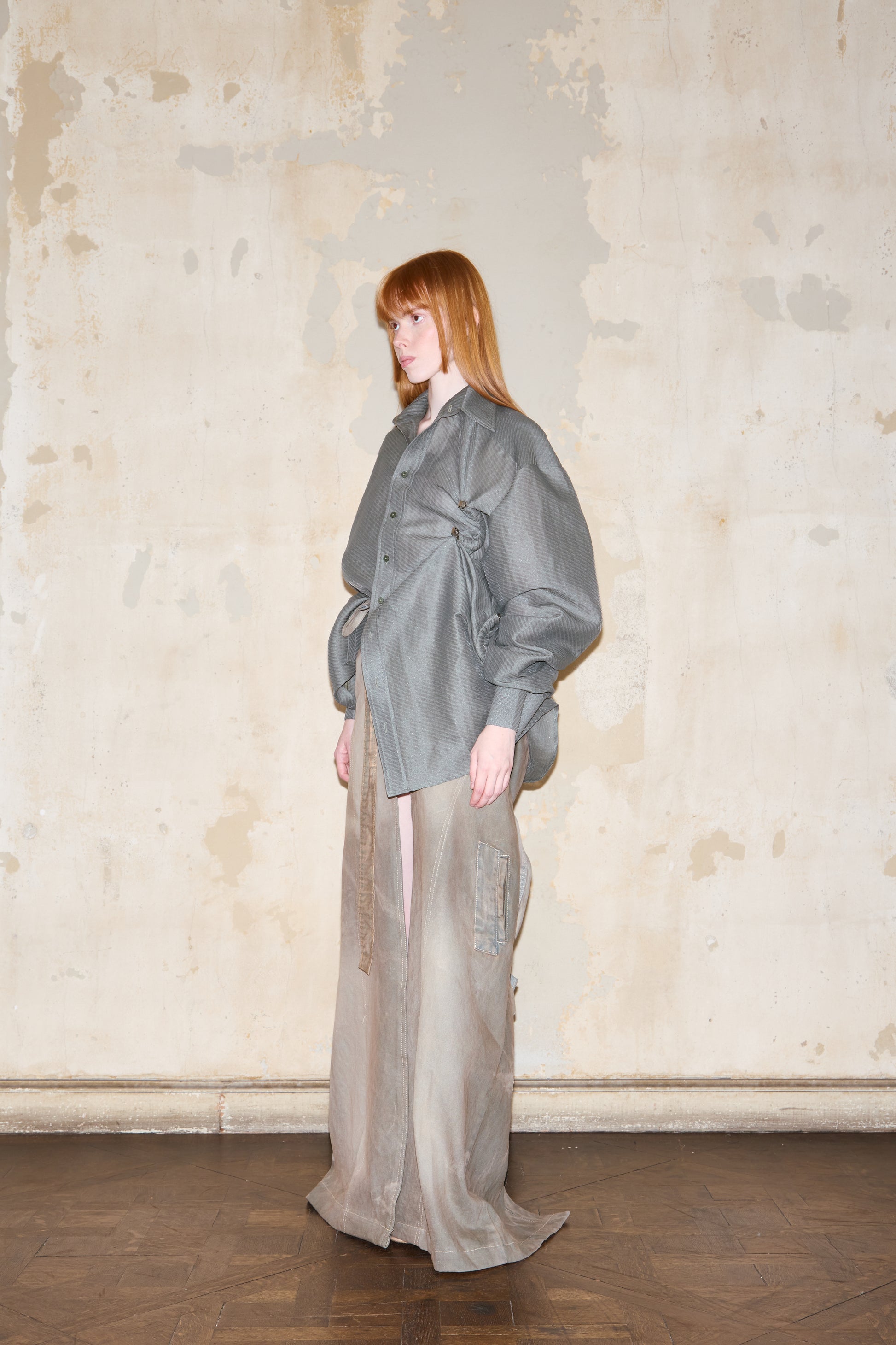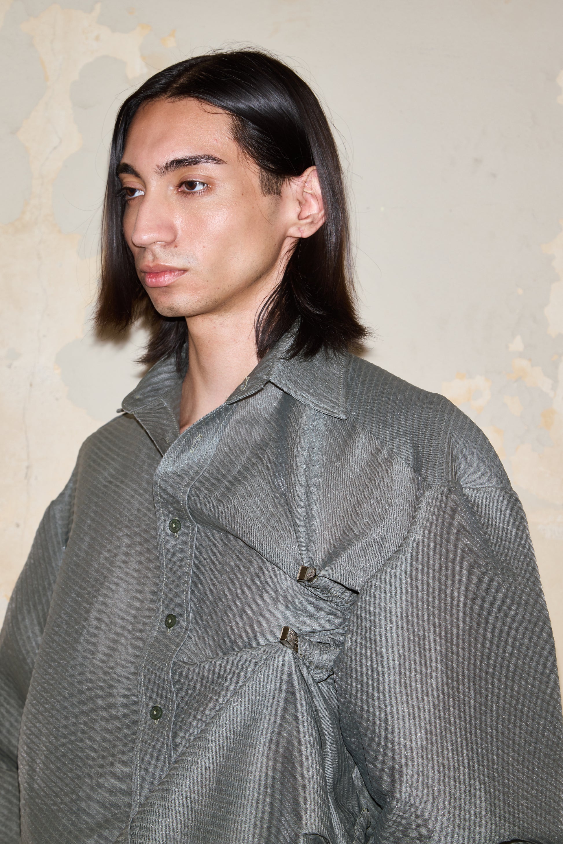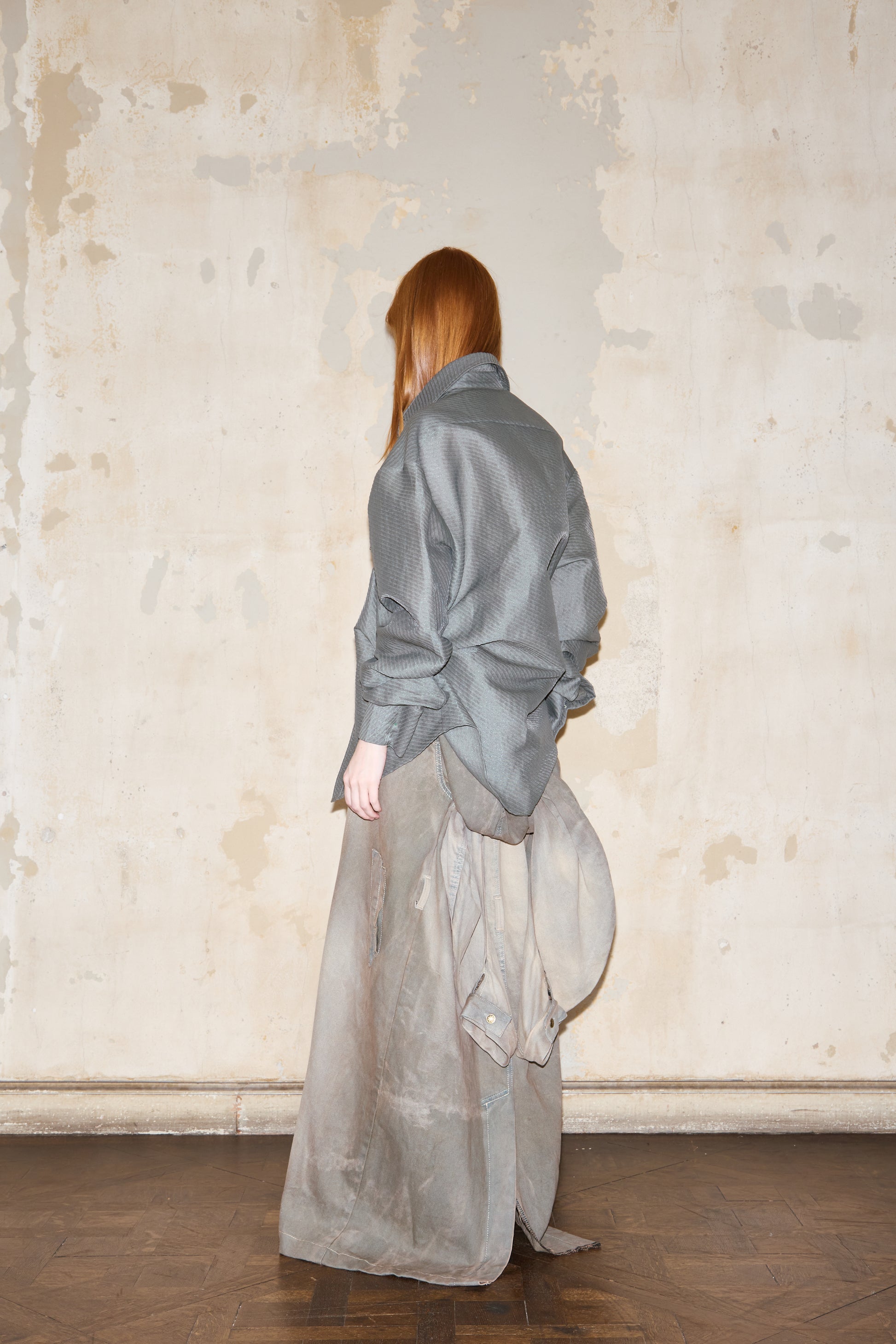 This versatile, genderless oversized shirt offers dual styling options: utilize the ESQUINA ESQUINA horseshoes for a draped effect or wear conventionally for a classic oversized silhouette. Crafted from technical fabric, it requires cold water hand washing.