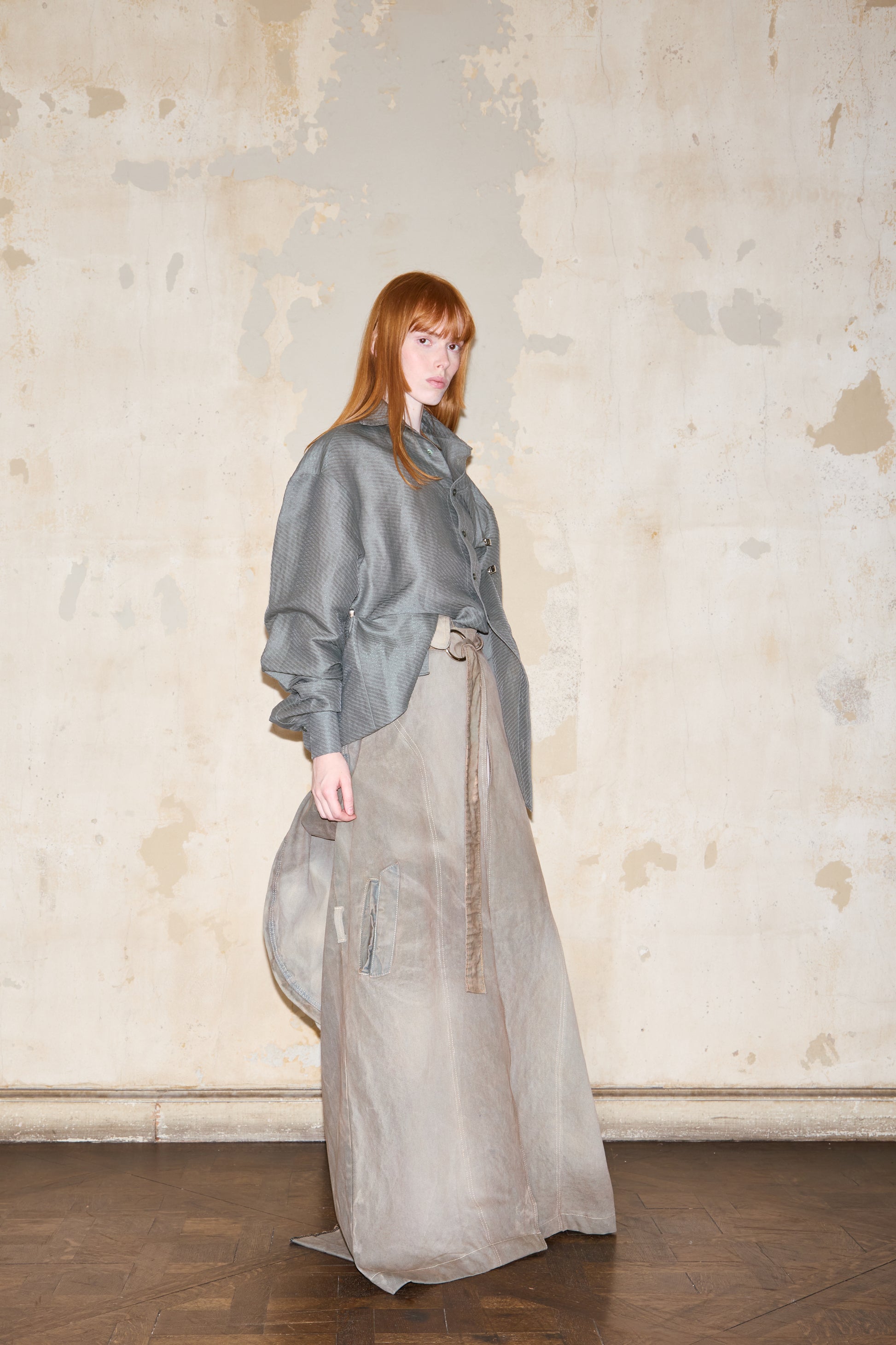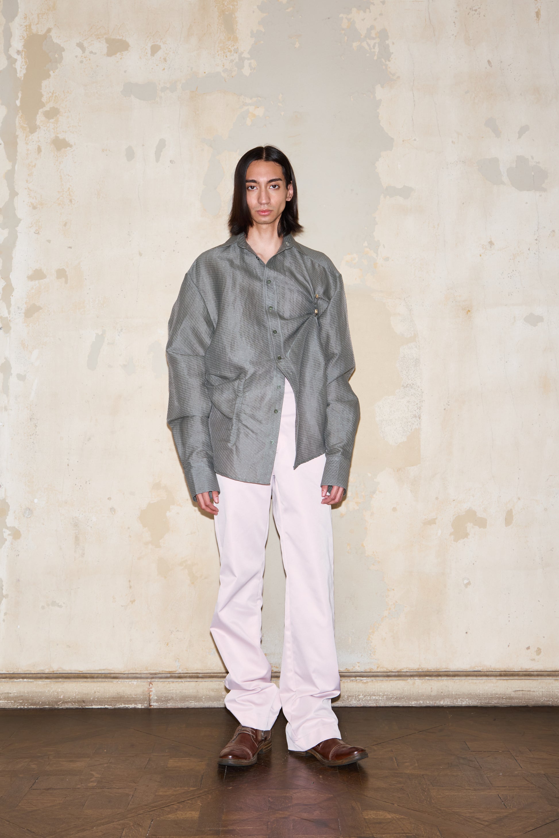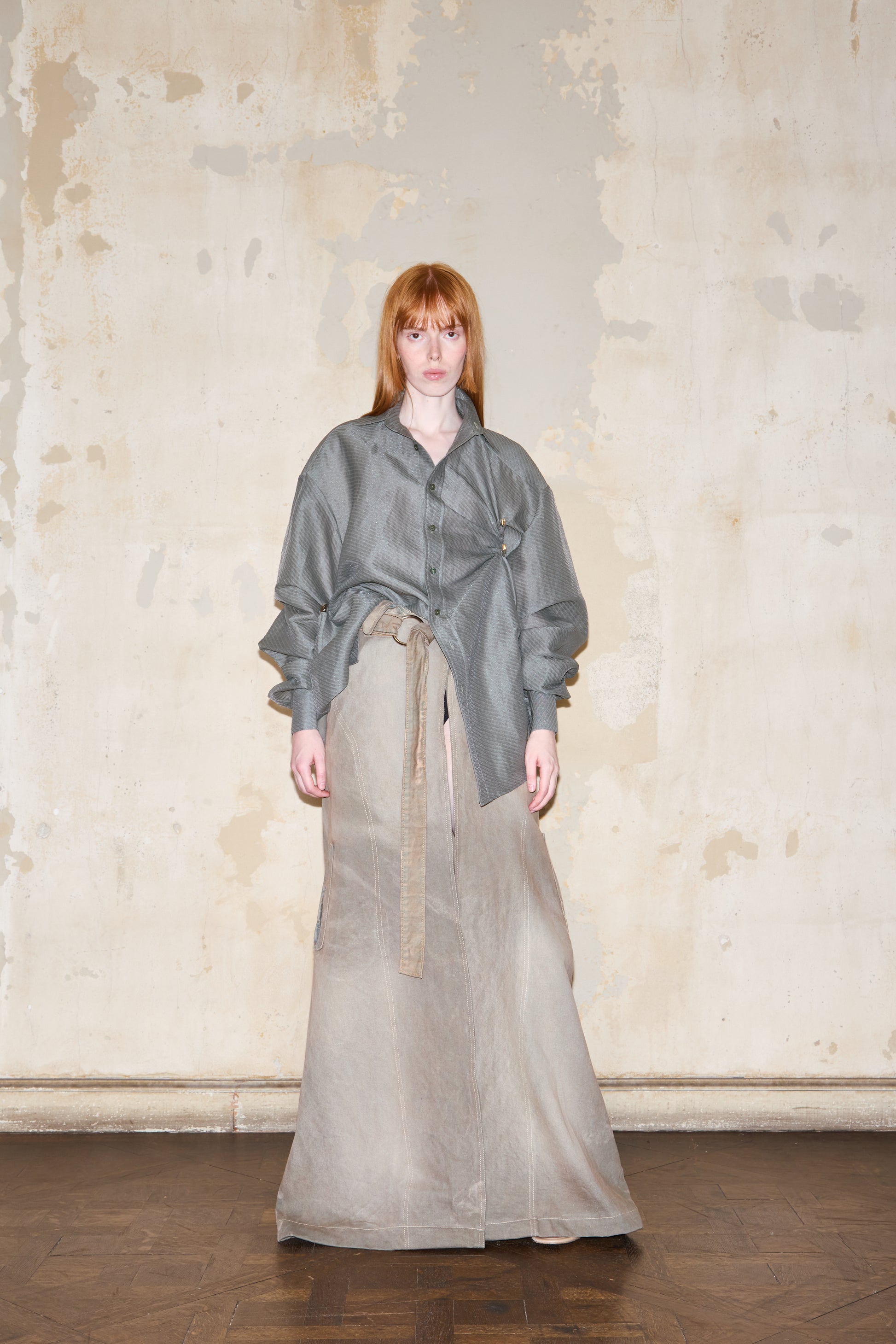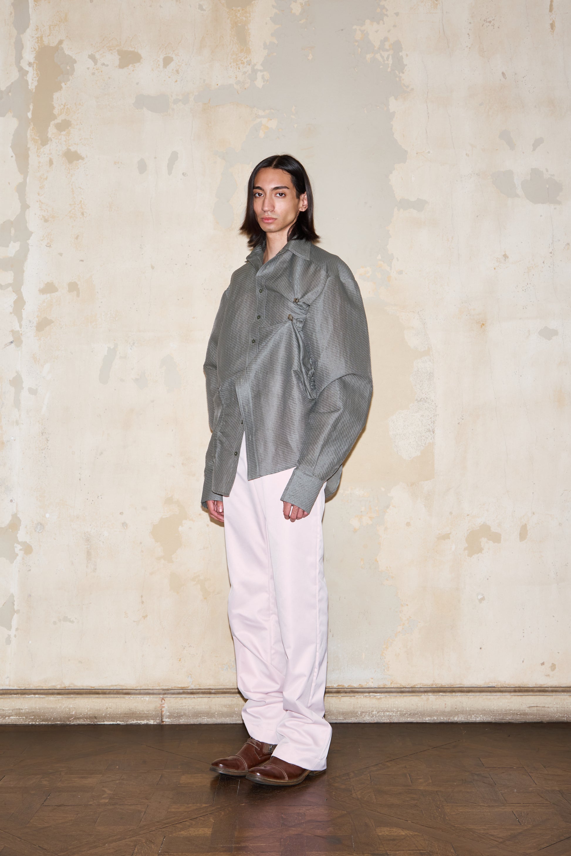 This versatile, genderless oversized shirt offers dual styling options: utilize the ESQUINA ESQUINA horseshoes for a draped effect or wear conventionally for a classic oversized silhouette. Crafted from technical fabric, it requires cold water hand washing.