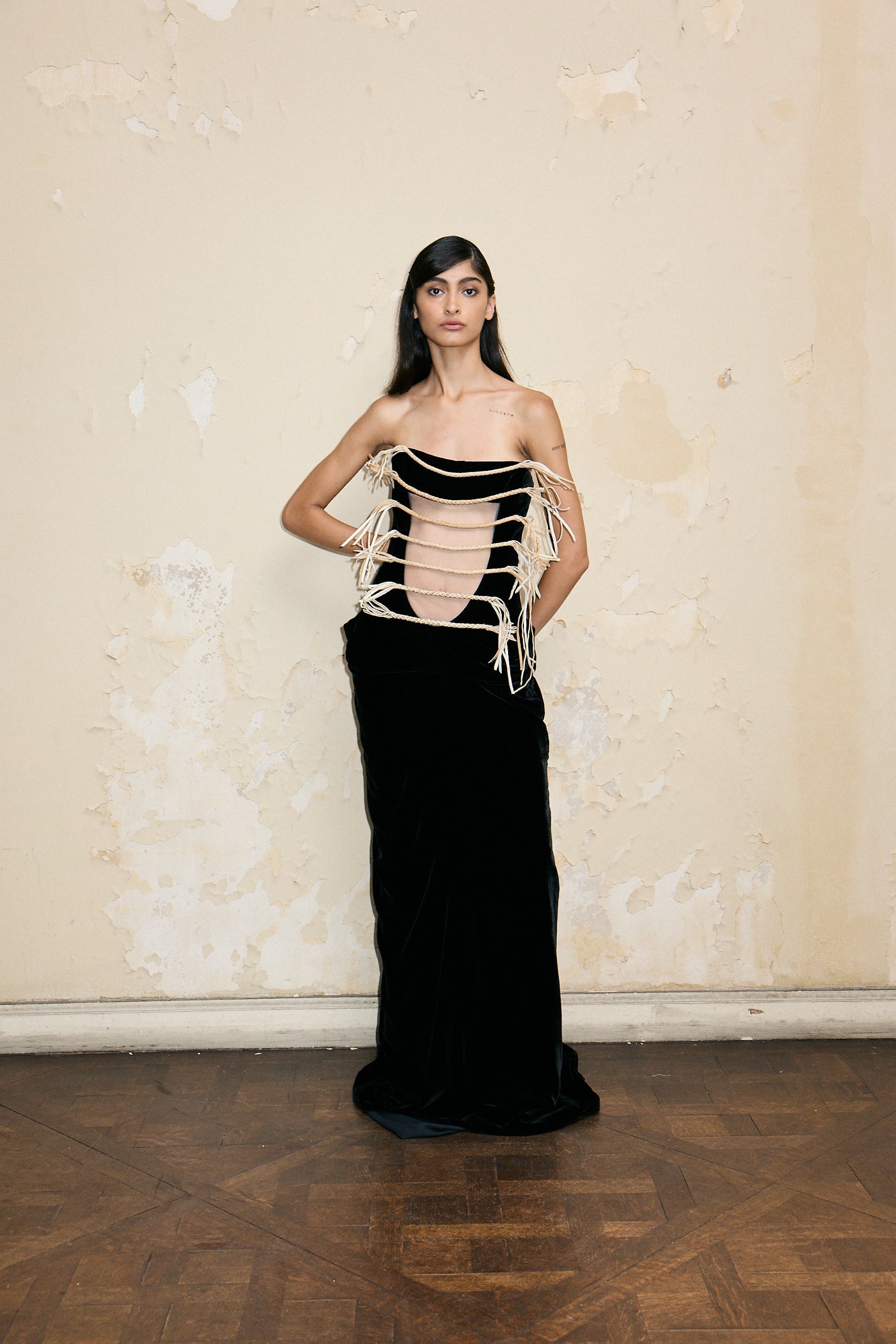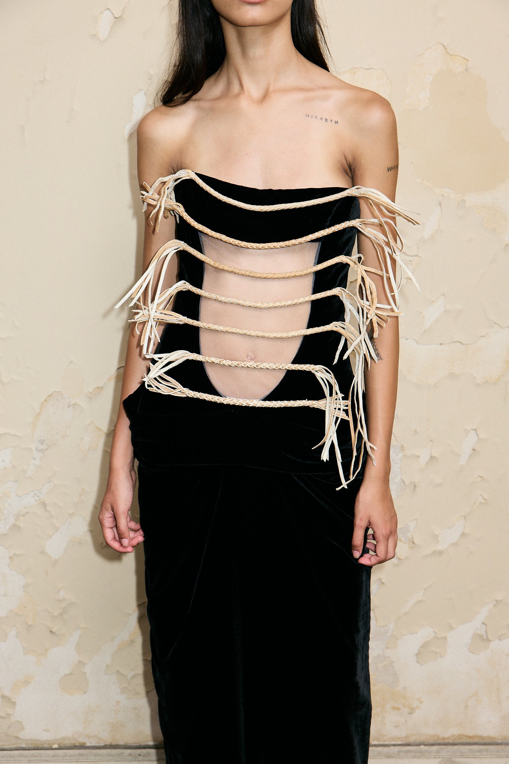 In collaboration with the internationally awarded master in sogueria criolla Jeronimo Coll. Long strapless dress made of Italian velvet. The mesh bustier has hand appliqués of 8 mm braids woven by "1y1" of raw cow leather, a traditional technique used for elementary tasks of the rural life. These braids are used traditionally on lazos used by gauchos to herd the cattle.