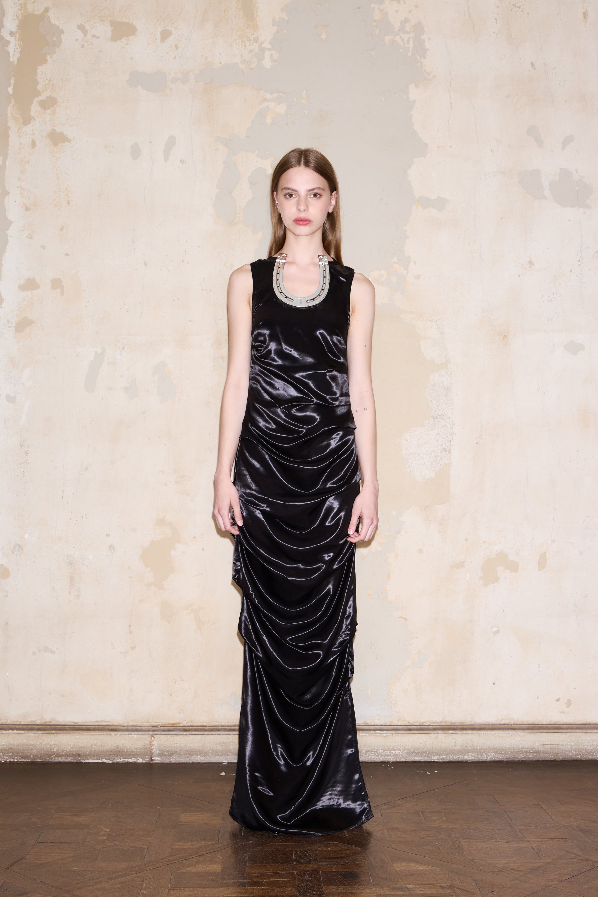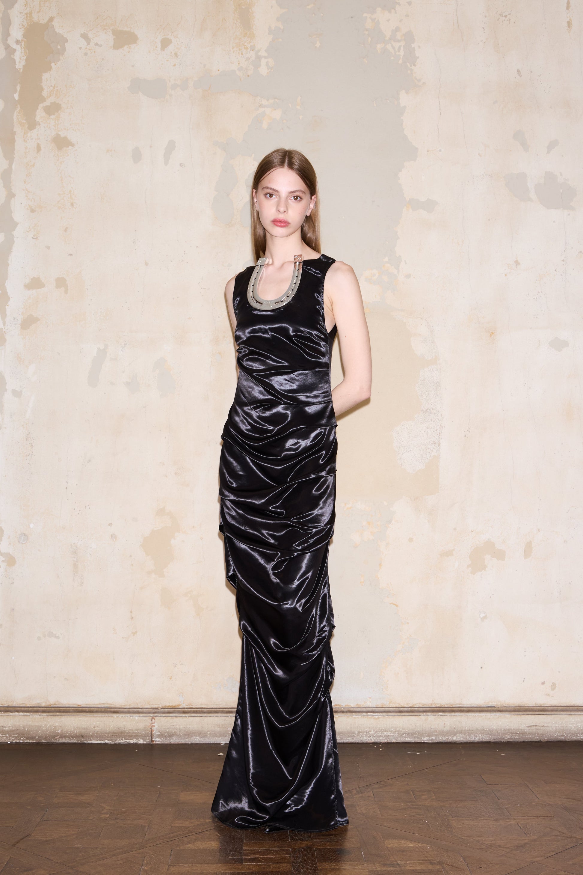 Sleeveless evening dress crafted from italian silk. The neckline features the distinctive ESQUINA horseshoe. Open back closes with intersecting straps. The draped construction creates fluid movement and refined proportions.