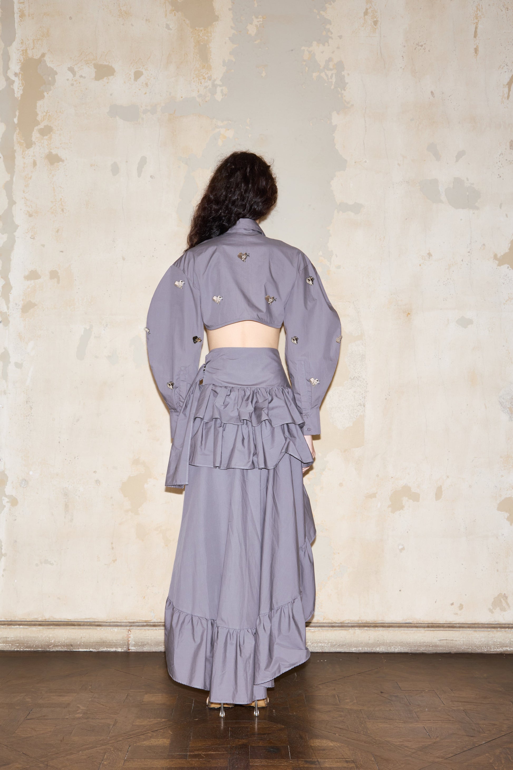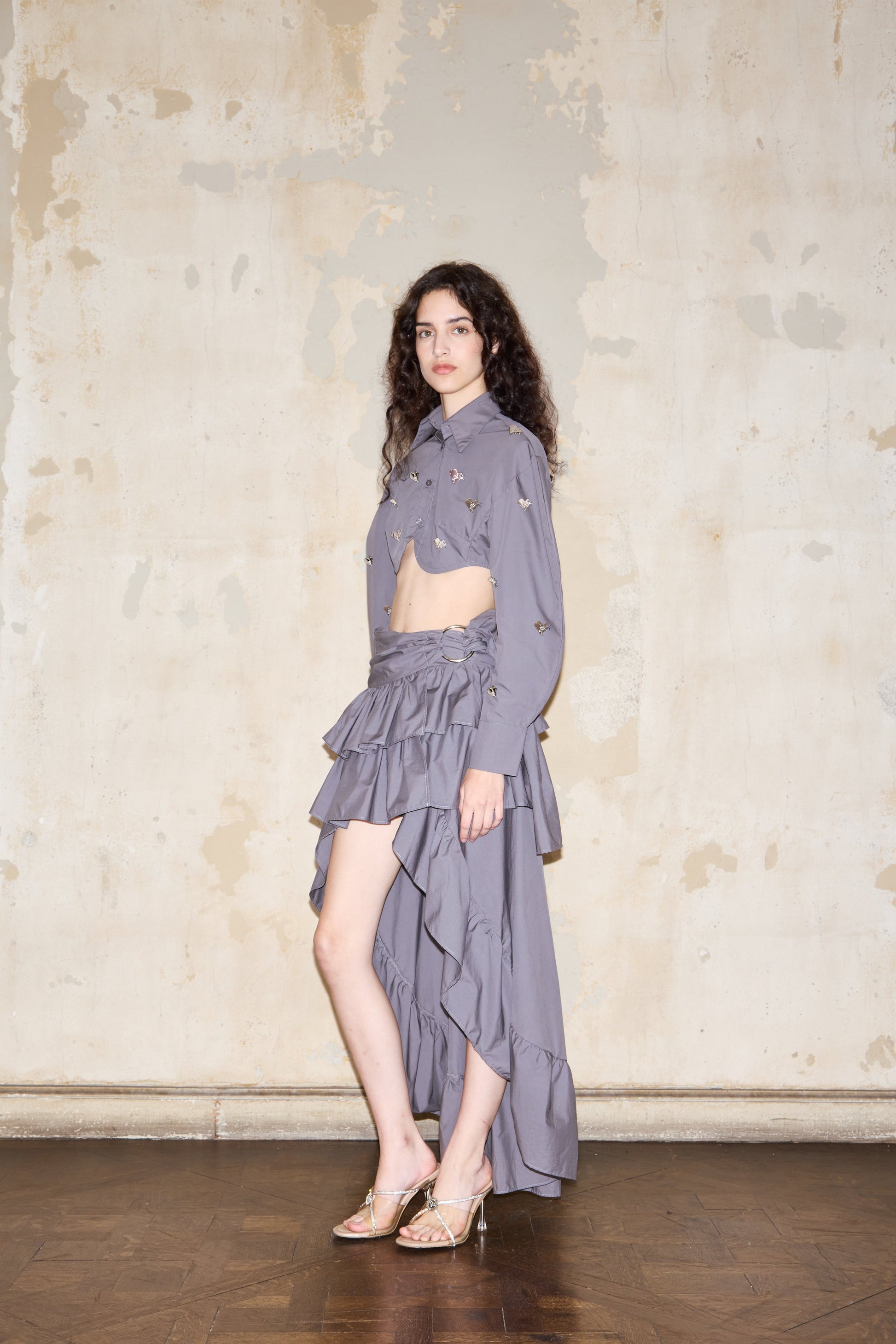 Asymmetrical ruffled skirt featuring a mini front with extended back length. Secured with a self-fabric tie and silver metal ring closure. Crafted from premium Italian poplin. Professional dry clean or cold hand wash recommended.